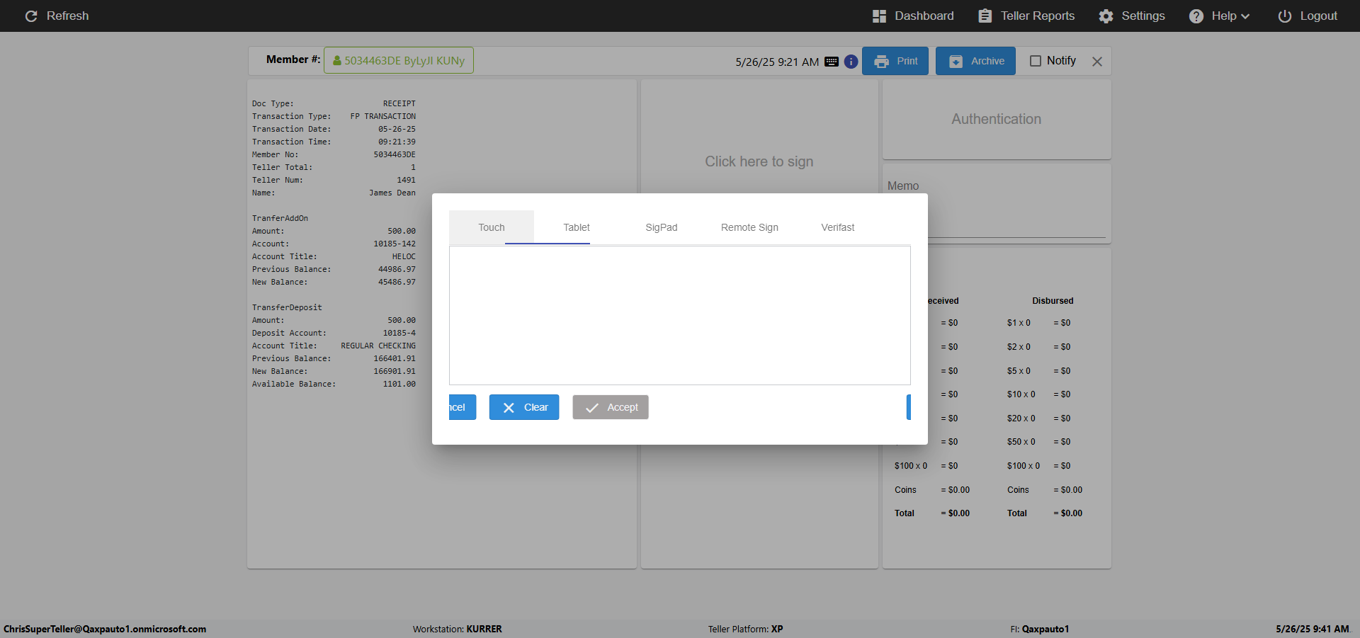 | 09:36:25 AM | Expected: verify the 'Cancel, Clear or Accept' elements in 'Touch' of Signature change mode Actual(Passed): verified the 'Cancel, Clear or Accept' elements in 'Touch' of Signature change mode [ScreenShot] |