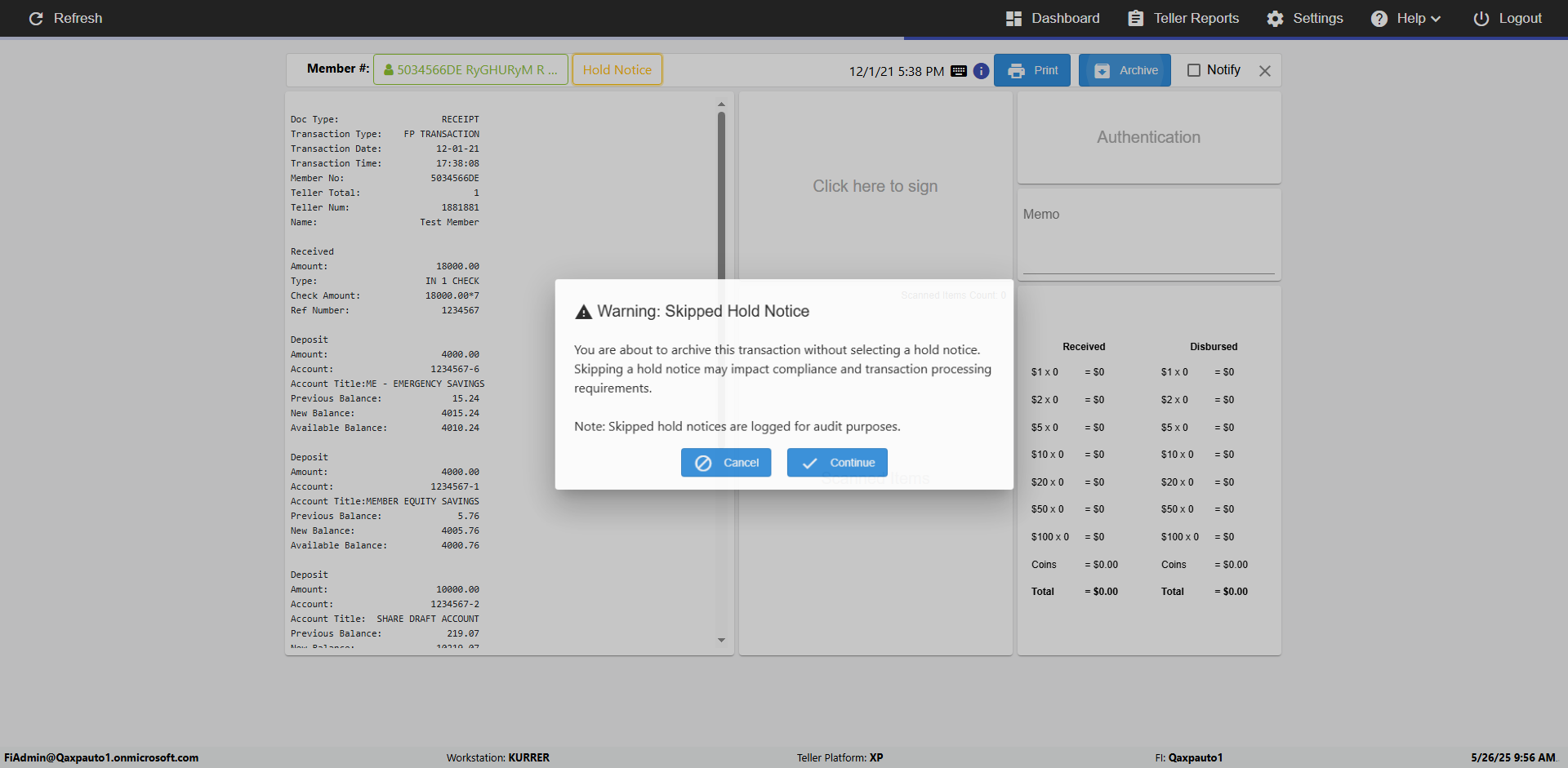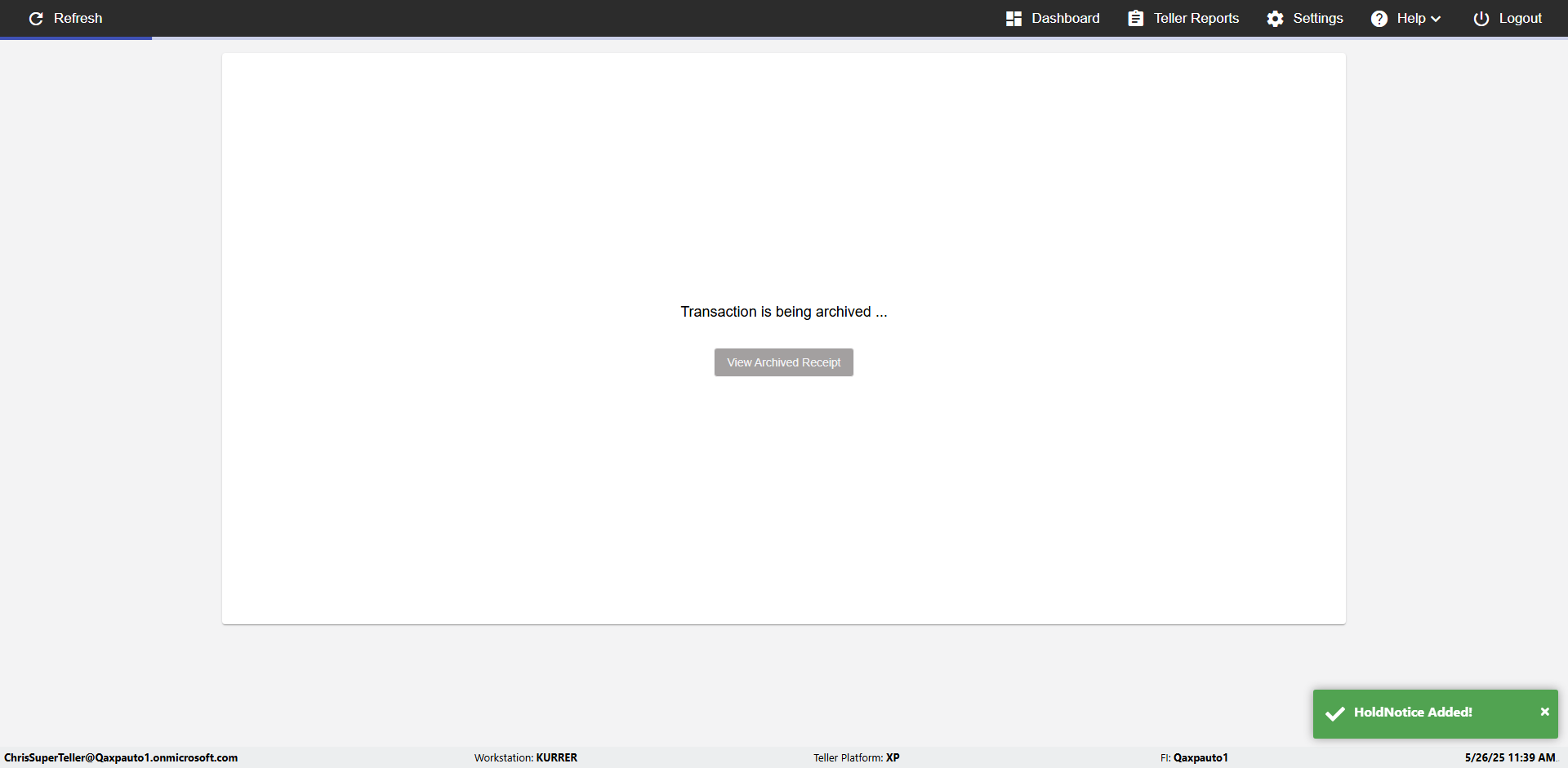 | 09:39:38 AM | Expected: check transaction status message Actual(Passed): Transaction is being archived ... [ScreenShot] |