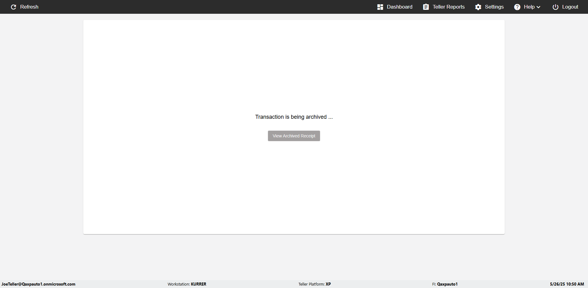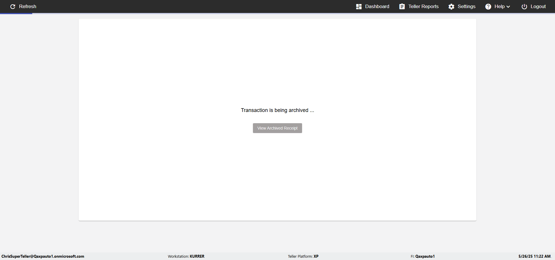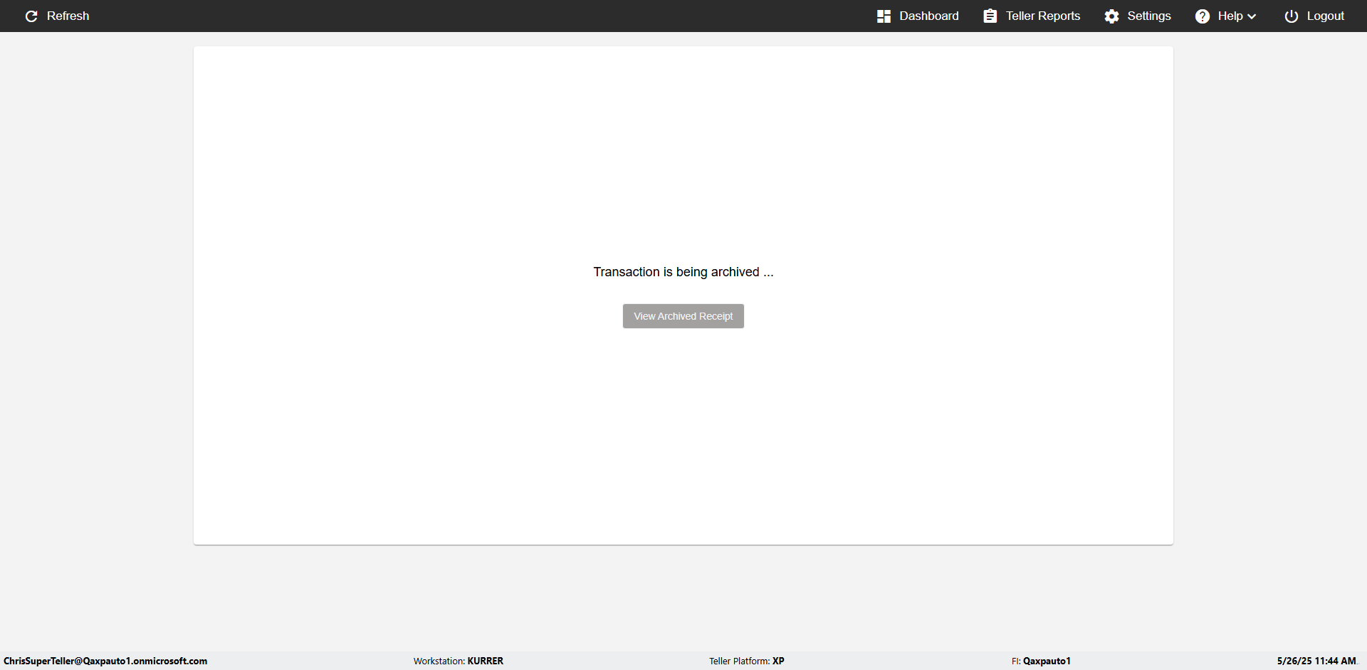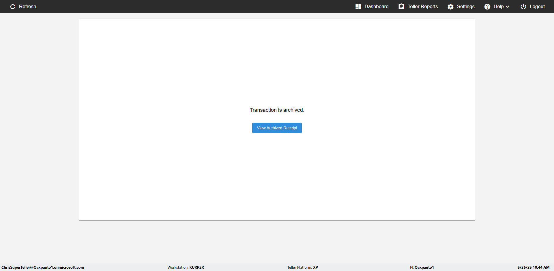 | 09:40:00 AM | Expected: check transaction status message Actual(Passed): Transaction is archived. [ScreenShot] |