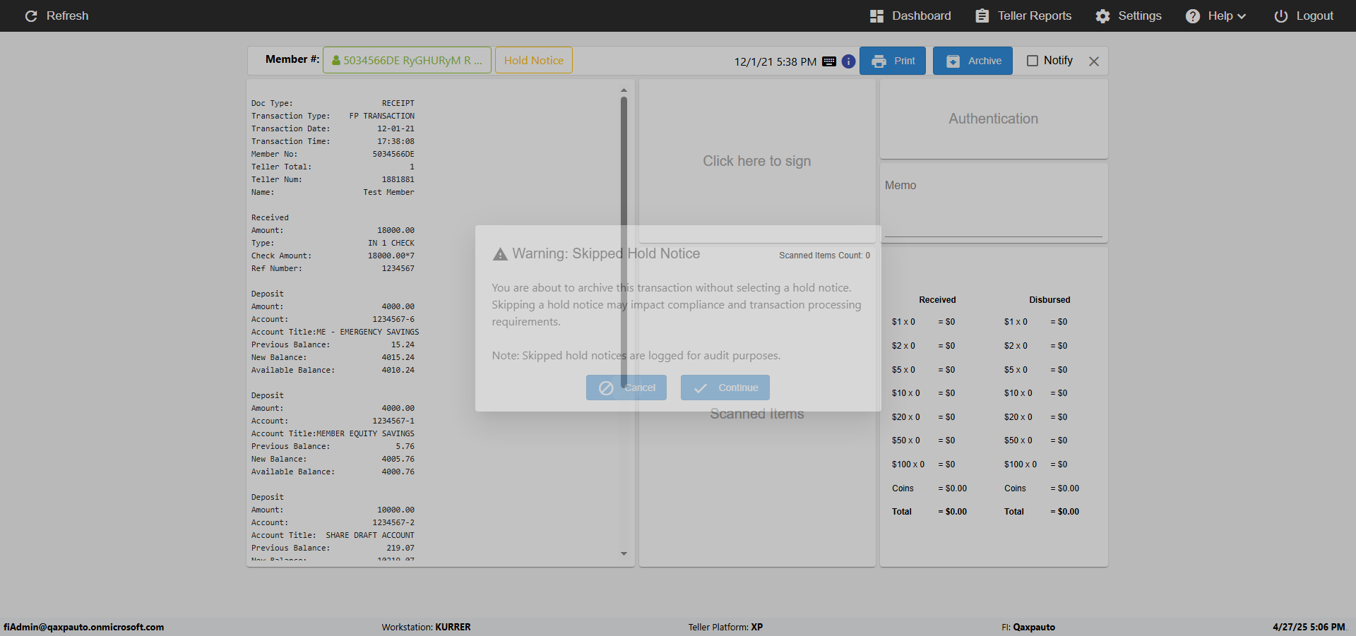 ({Toggel=, Archived Transactions=no, Description=verify Hold Notice Warning Message displayed when warning is enabled, Email=, Archive=, Document Type=, Notify=, SignatureTab=, DisbursedExpression=, Operation=, Teller LastName=, Disbursed cash=, errorint=, TestID=verifyHoldNoticeWarningWithoutReasons, Print=, DisbursedExpressionValue=, Phone=, ReceivedCashValue=, Member=5034566, UserPwd=iMM2022!, Transtatus=Archived-false;Active-true;Error-false, Docment ID=, Teller=1881881, Teller FirstName=, errorMessage=, ReceivedExpressionValue=, Date=, Platfrom=Enable Hold Notice-true; Hold Notice Warning-true;, Received cash=, Transaction=, Header=, Expression=, Username=fiAdmin@Qaxpauto.onmicrosoft.com, DisbursedCashValue=, FullName=, ReceivedExpression=, SMS=, Memo=})