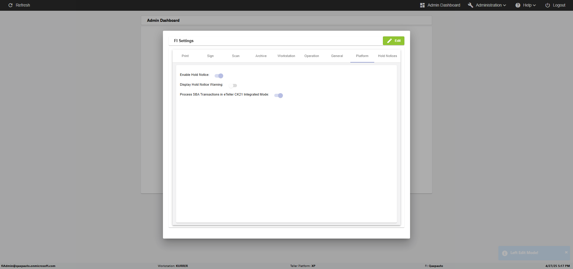 Actual(Passed): Sucessfully clicked on Settings button in Teller portal[ScreenShot]