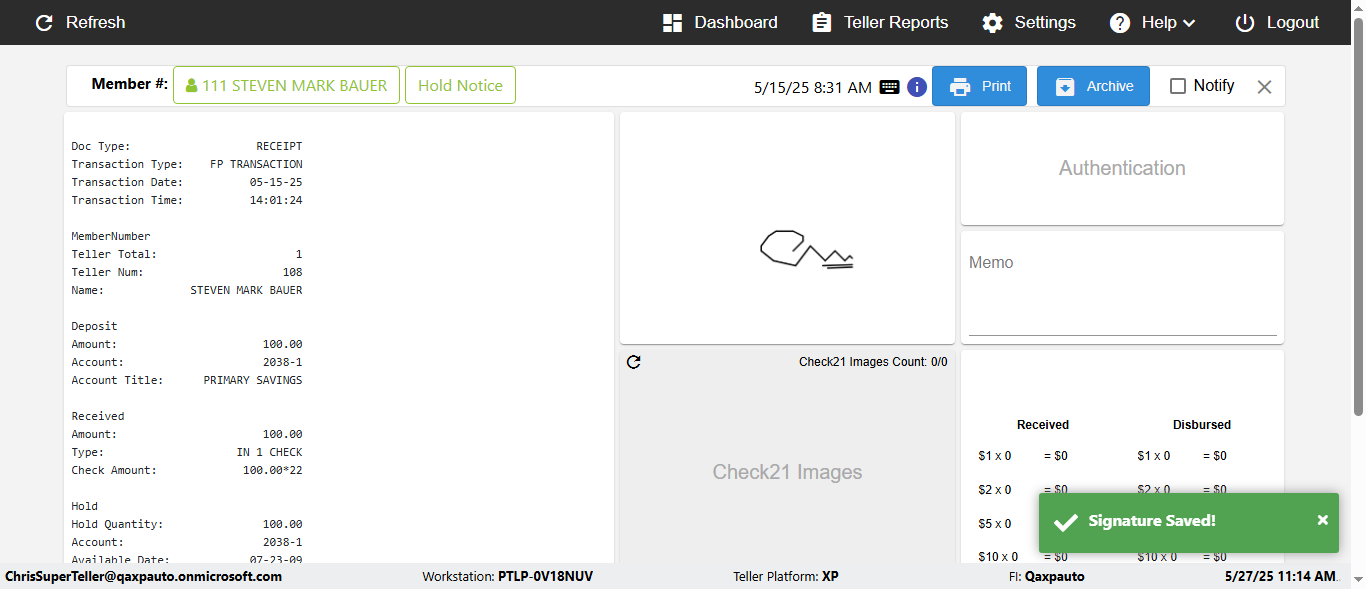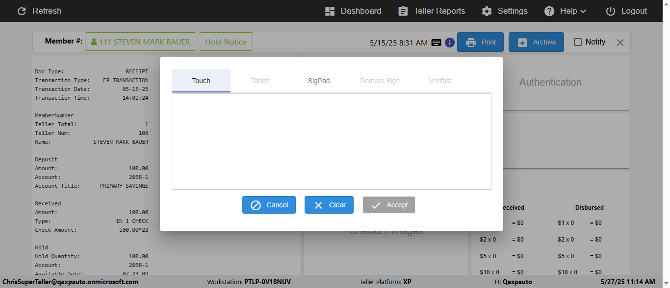 ({Toggel=, Archived Transactions=no, Description=verify touch signature in Receipt Page, Email=FALSE, Archive=FALSE, Document Type=, Notify=TRUE, SignatureTab=Touch,, DisbursedExpression=|-10*5, Operation=, Teller LastName=, Disbursed cash=, errorint=, TestID=verifyTouchSignatureEreceipt, Print=FALSE, DisbursedExpressionValue=TRUE, Phone=, ReceivedCashValue=FALSE, Member=, UserPwd=iMM2022!, Transtatus=Archived-false;Active-true;Error-false, Docment ID=, Teller=, Teller FirstName=Joe, errorMessage=, ReceivedExpressionValue=TRUE, Date=, Platfrom=, Received cash=, Transaction=, Header=, Expression=, Username=ChrisSuperTeller@Qaxpauto.onmicrosoft.com, DisbursedCashValue=FALSE, FullName=, ReceivedExpression=|+100*2, SMS=FALSE, Memo=})