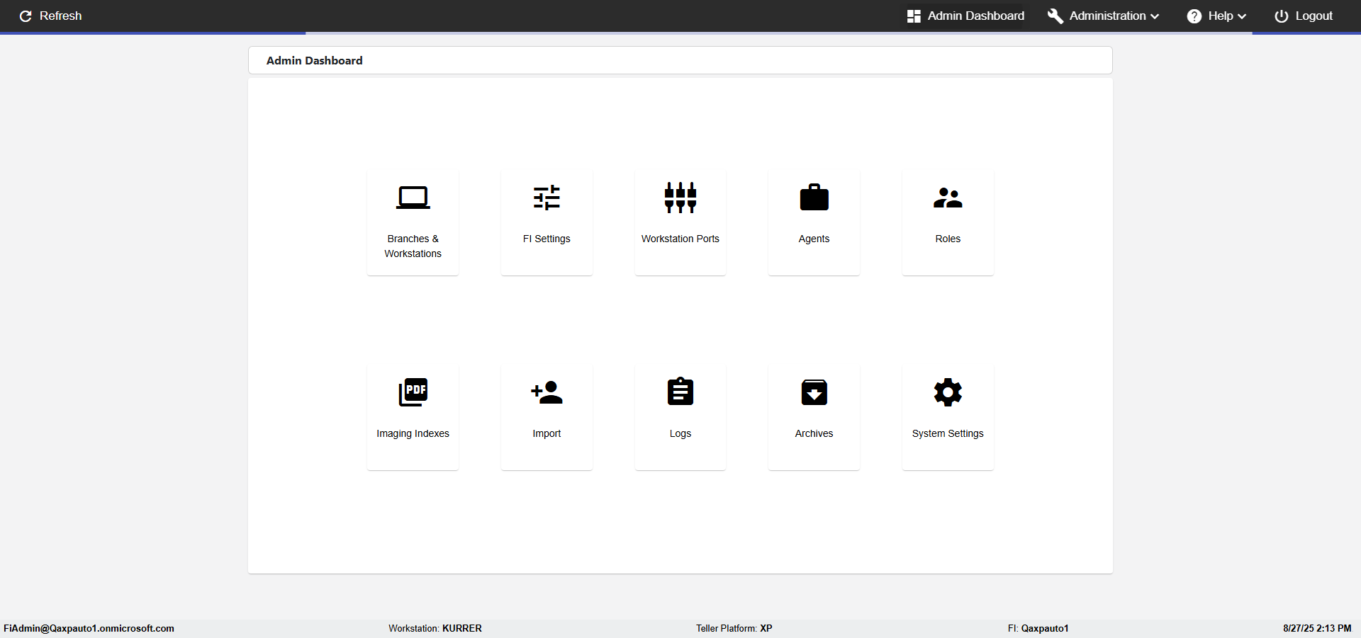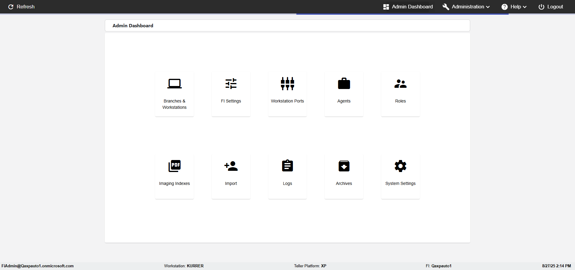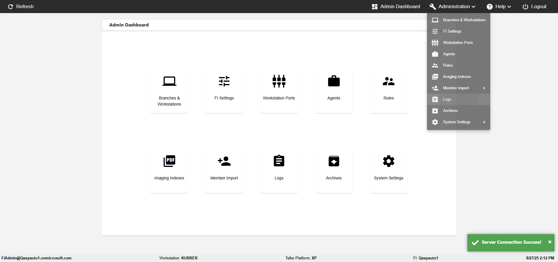 Control Panel, FI Management, Agents, Roles, Imaging Indexes, Member Import, Logging, Archives, About, Logout Actual(Passed): Successfully verified the Verfiy Administration menu has the following options- Control Panel, FI Management, Agents, Roles, Imaging Indexes, Member Import, Logging, Archives, About, Logout [ScreenShot] |