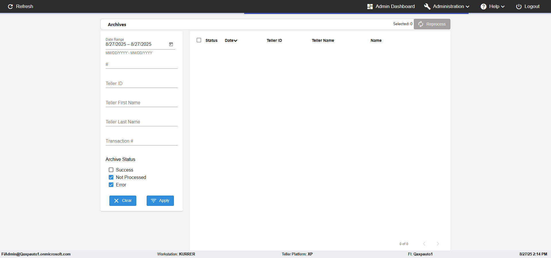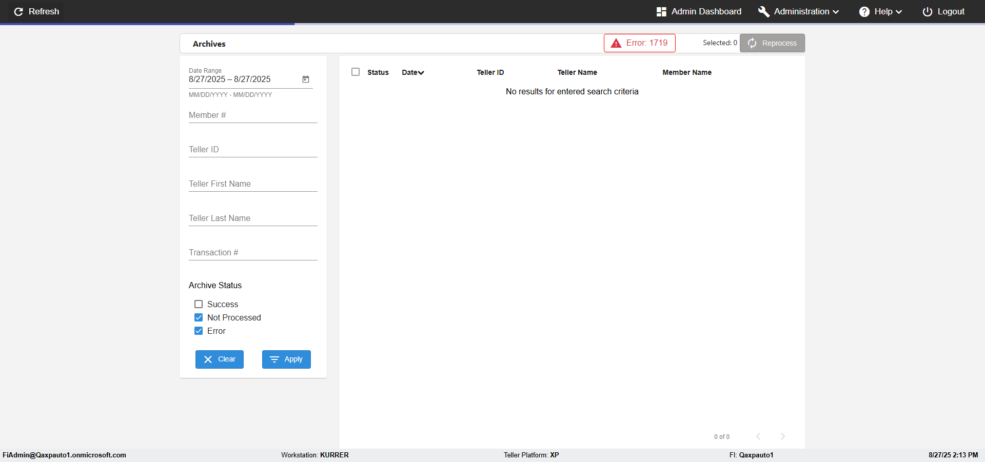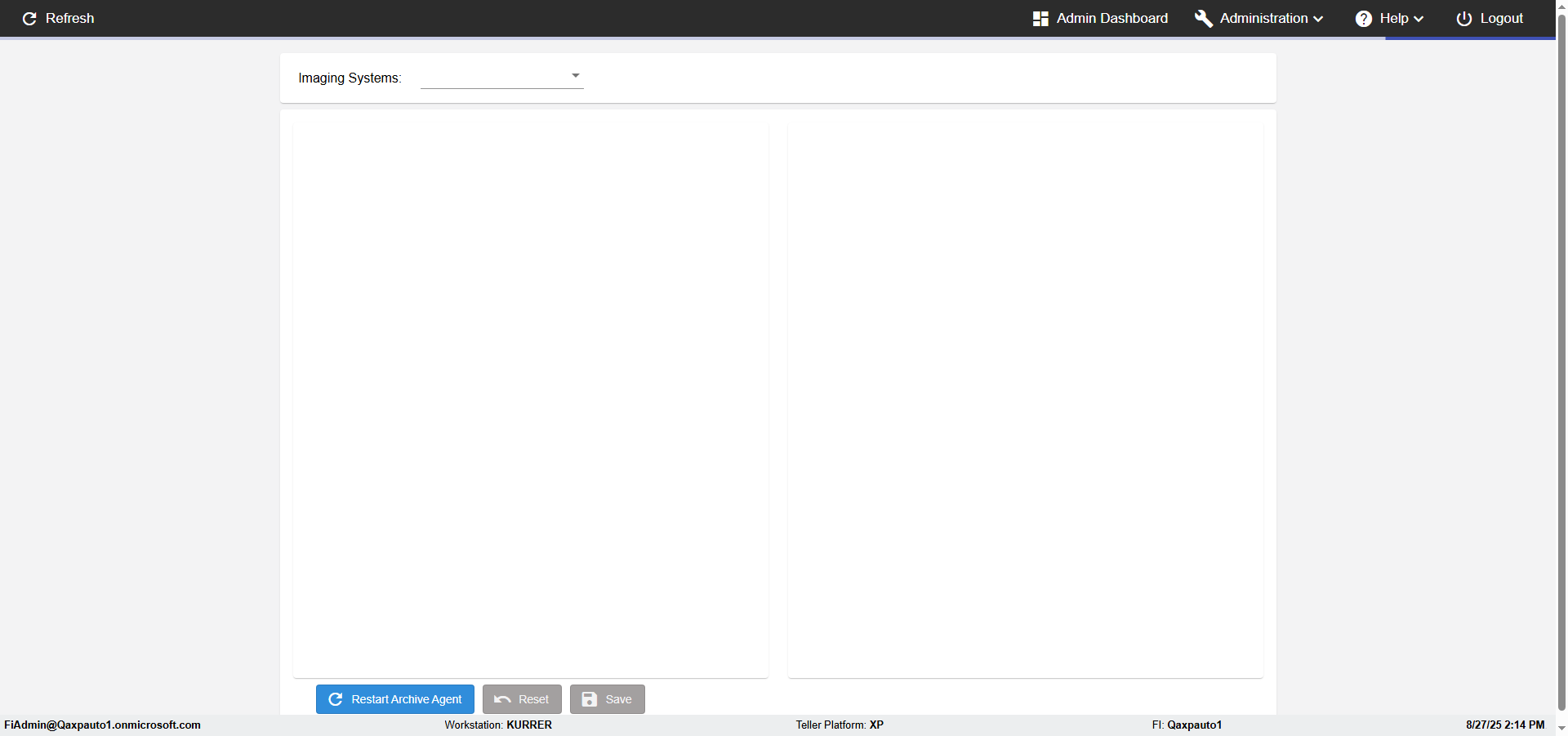 Control Panel, FI Management, Agents, Roles, Imaging Indexes, Member Import, Logging, Archives, About, Logout Actual(Passed): Successfully verified the Verfiy Administration menu has the following options- Control Panel, FI Management, Agents, Roles, Imaging Indexes, Member Import, Logging, Archives, About, Logout [ScreenShot] |