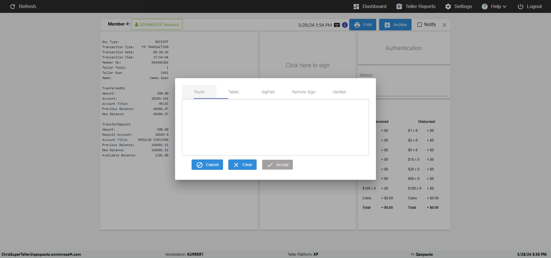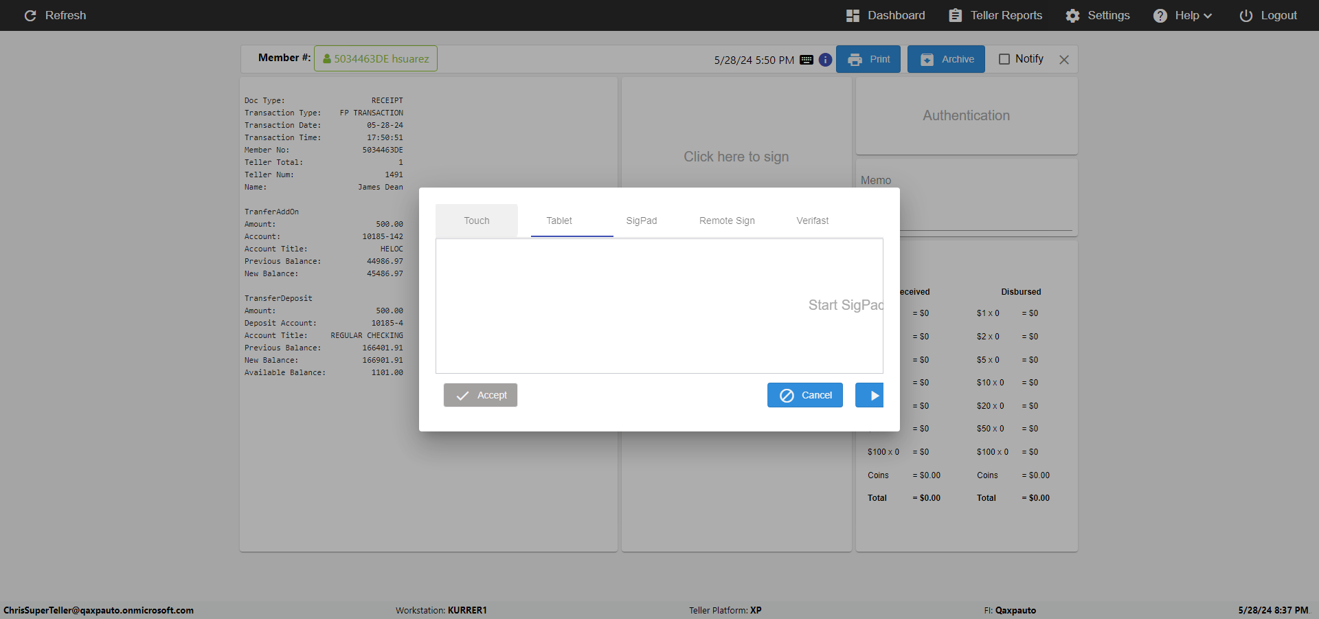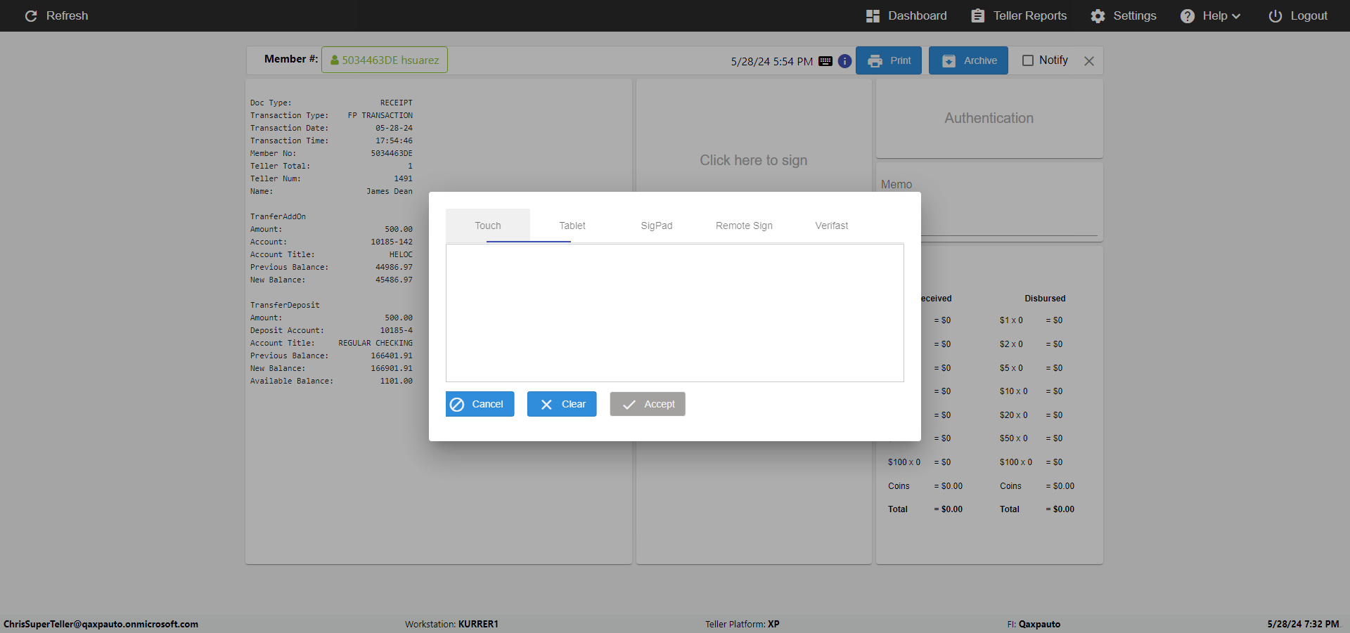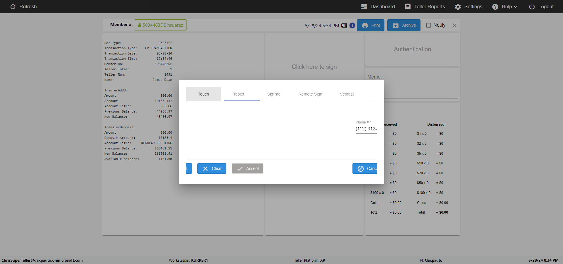 | {Toggel=, Archived Transactions=no, Description=verify touch signature in Receipt Page, Email=FALSE, Archive=FALSE, Document Type=, Notify=TRUE, SignatureTab=Touch,, DisbursedExpression=|-10*5, Operation=, Teller LastName=, Disbursed cash=, errorint=, TestID=verifyTouchSignatureEreceipt, Print=FALSE, DisbursedExpressionValue=TRUE, Phone=, ReceivedCashValue=FALSE, Member=, UserPwd=iMM2022!, Transtatus=Archived-false;Active-true;Error-false, Docment ID=, Teller=, Teller FirstName=Joe, errorMessage=, ReceivedExpressionValue=TRUE, Date=, Platfrom=, Received cash=, Transaction=, Header=, Expression=, Username=ChrisSuperTeller@Qaxpauto.onmicrosoft.com, DisbursedCashValue=FALSE, FullName=, ReceivedExpression=|+100*2, SMS=FALSE, Memo=} |