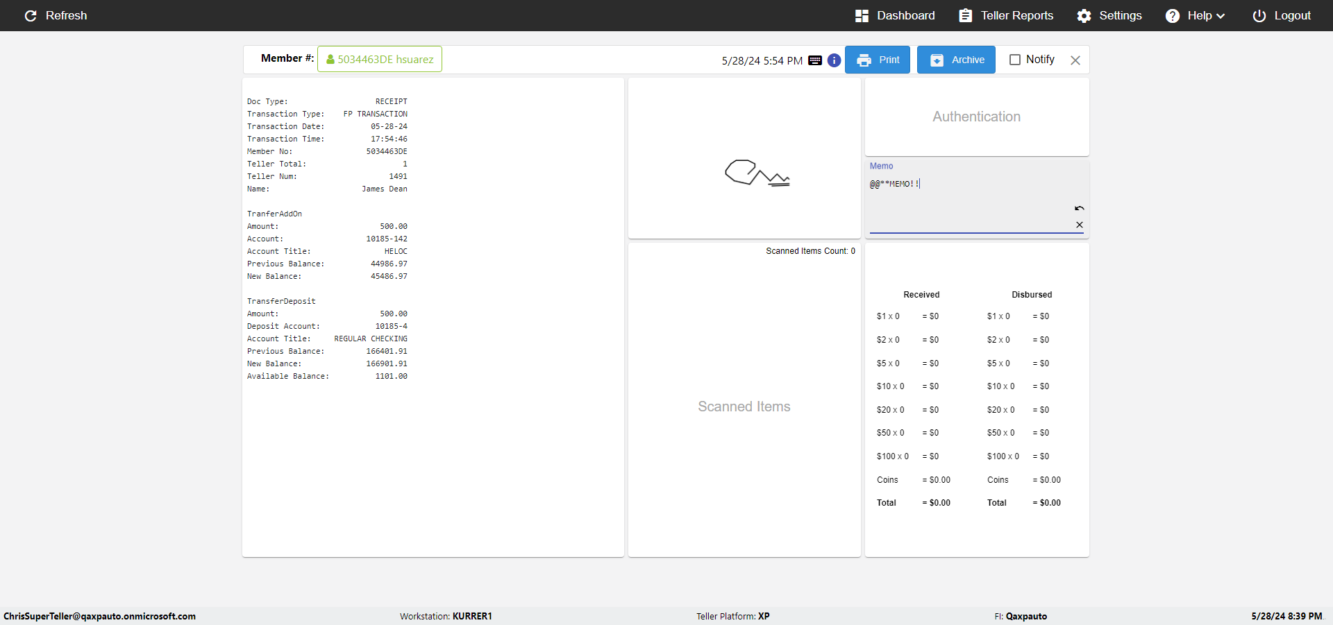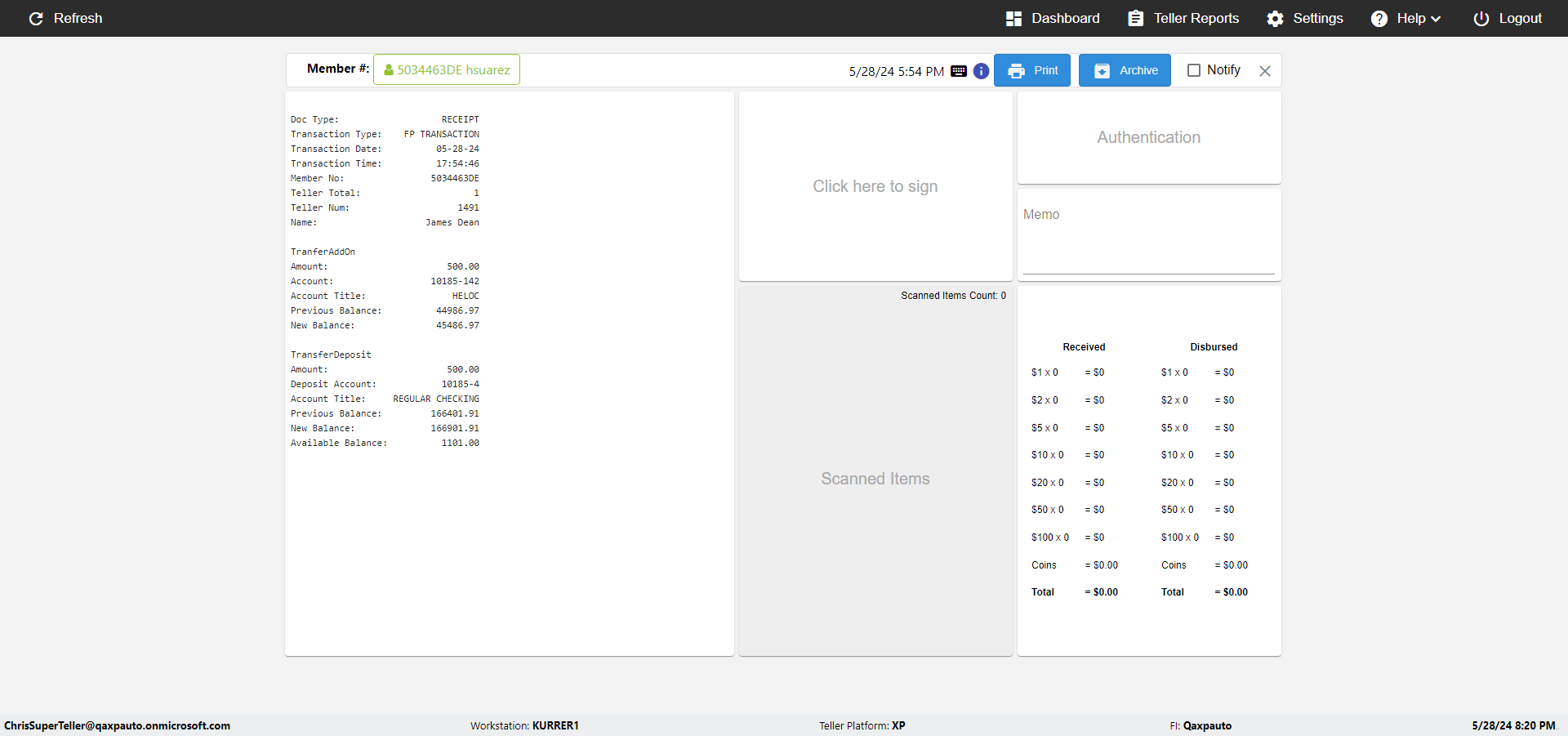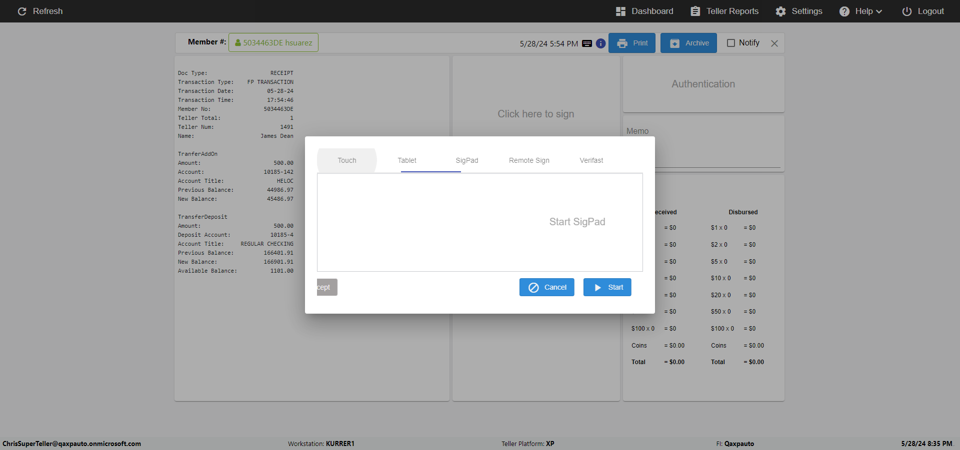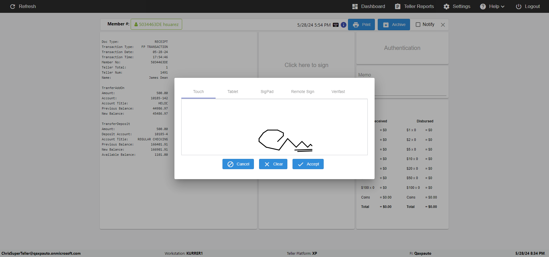 | {Toggel=, Archived Transactions=no, Description=verify touch signature in Receipt Page, Email=FALSE, Archive=FALSE, Document Type=, Notify=TRUE, SignatureTab=Touch,, DisbursedExpression=|-10*5, Operation=, Teller LastName=, Disbursed cash=, errorint=, TestID=verifyTouchSignatureEreceipt, Print=FALSE, DisbursedExpressionValue=TRUE, Phone=, ReceivedCashValue=FALSE, Member=, UserPwd=iMM2022!, Transtatus=Archived-false;Active-true;Error-false, Docment ID=, Teller=, Teller FirstName=Joe, errorMessage=, ReceivedExpressionValue=TRUE, Date=, Platfrom=, Received cash=, Transaction=, Header=, Expression=, Username=ChrisSuperTeller@Qaxpauto.onmicrosoft.com, DisbursedCashValue=FALSE, FullName=, ReceivedExpression=|+100*2, SMS=FALSE, Memo=} |