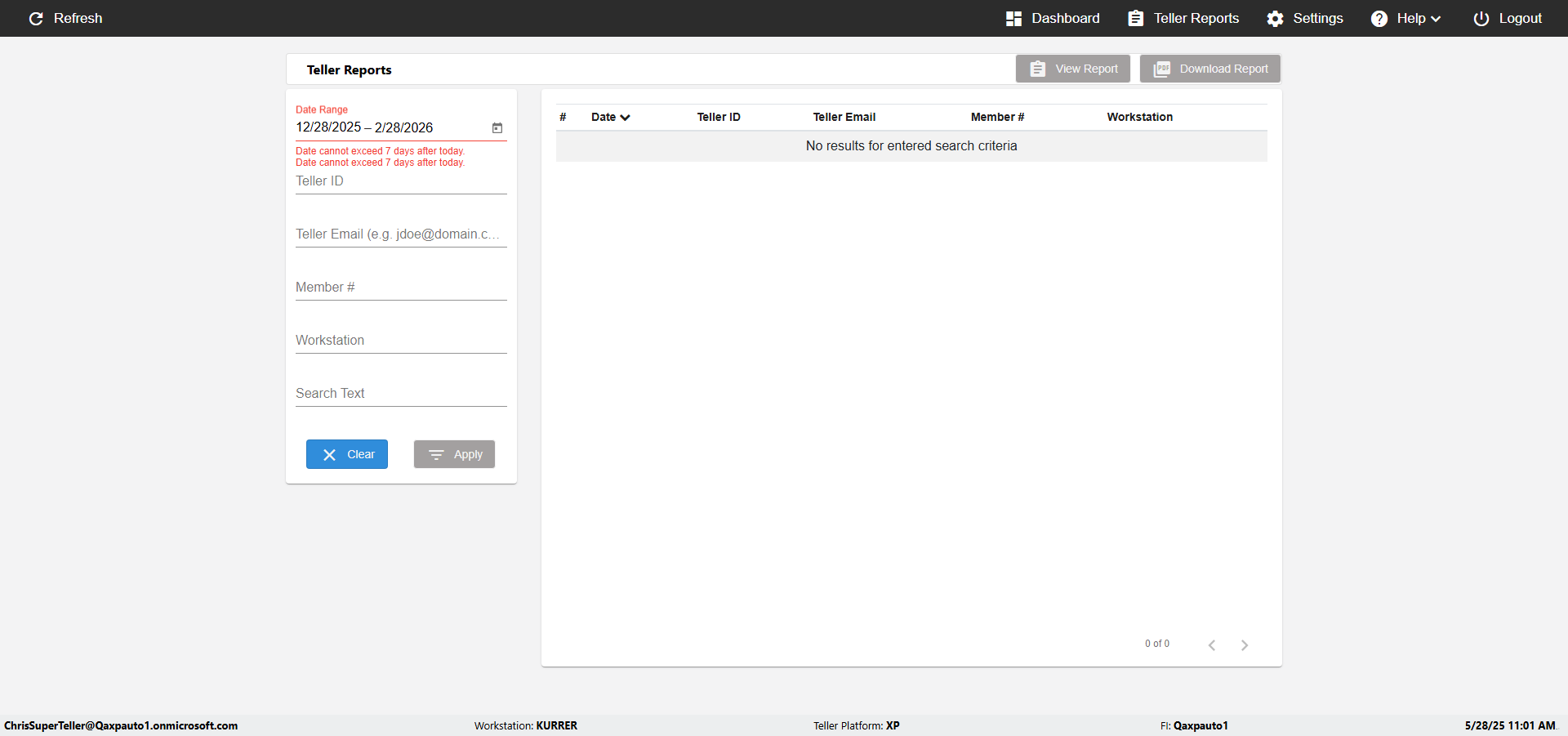 ({UserPwd=iMM2022!, Description=verify Error Messages in Report Page for Date, Teller ID=, errorMessage=Date cannot exceed 7 days after today.;Date cannot exceed 7 days after today., Teller Email=, View=, Date=12/28/2025 - 2/28/2026, Clear=, Workstation=, errorint=2, TestID=verifyErrorMessagesInReports, Transaction=, Header=, Username=ChrisSuperTeller@Qaxpauto1.onmicrosoft.com, Export=, Member #=, Search Text=, Level=})