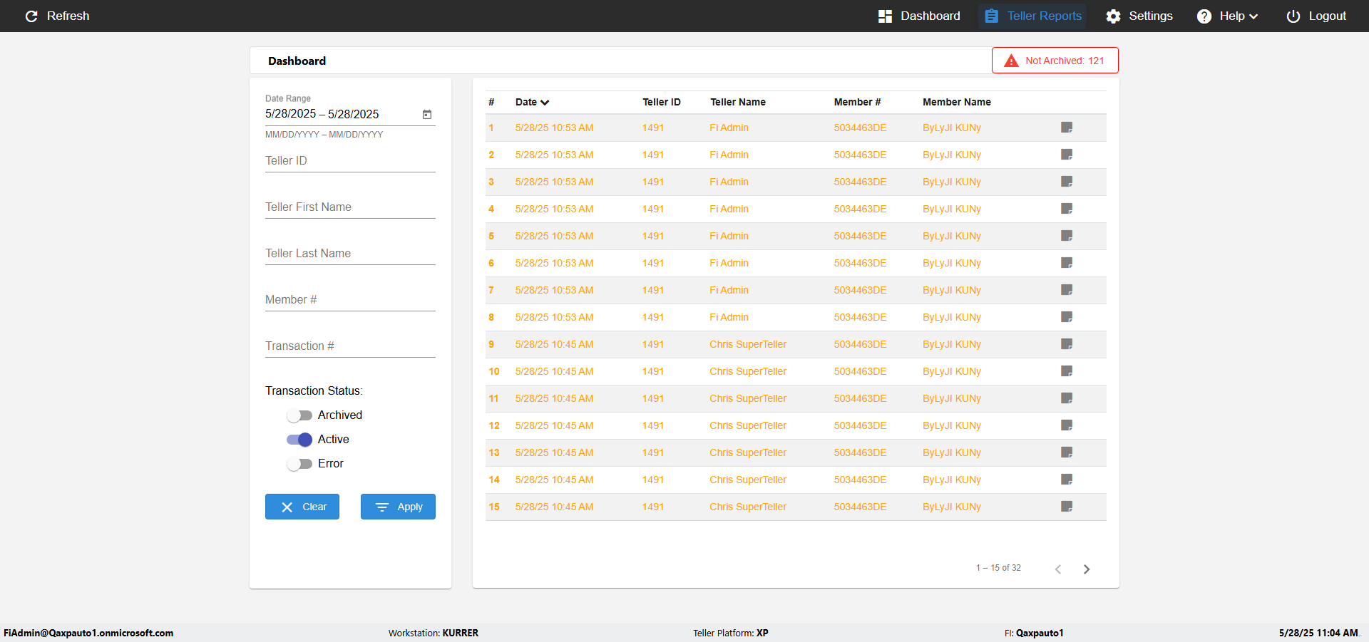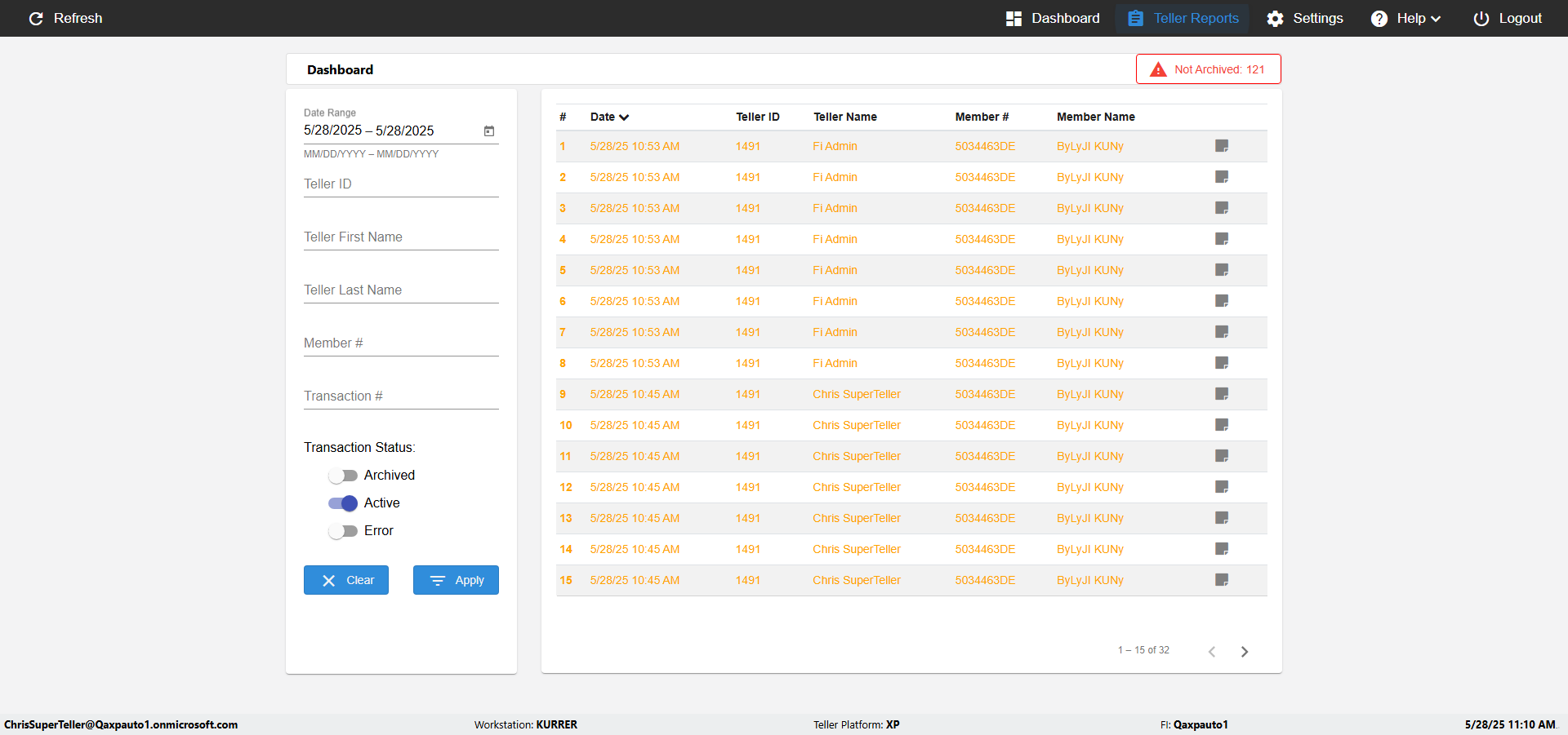 (Verify UI elements and Search the Date,Teller,Teller name,Member name in Reports page)