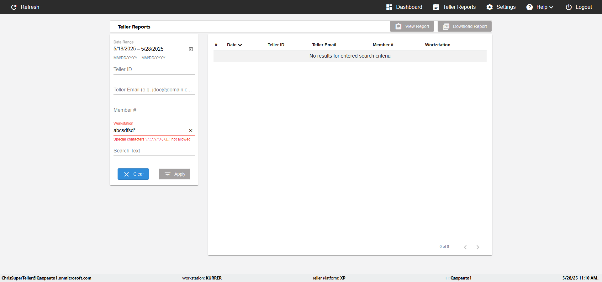 ({UserPwd=iMM2022!, Description=verify Error Messages in Report Page for Teller ID, Teller ID=%&^heg, errorMessage=Special characters not allowed., Teller Email=, View=, Date=, Clear=, Workstation=, errorint=1, TestID=verifyErrorMessagesInReports, Transaction=, Header=, Username=ChrisSuperTeller@Qaxpauto1.onmicrosoft.com, Export=, Member #=, Search Text=, Level=})