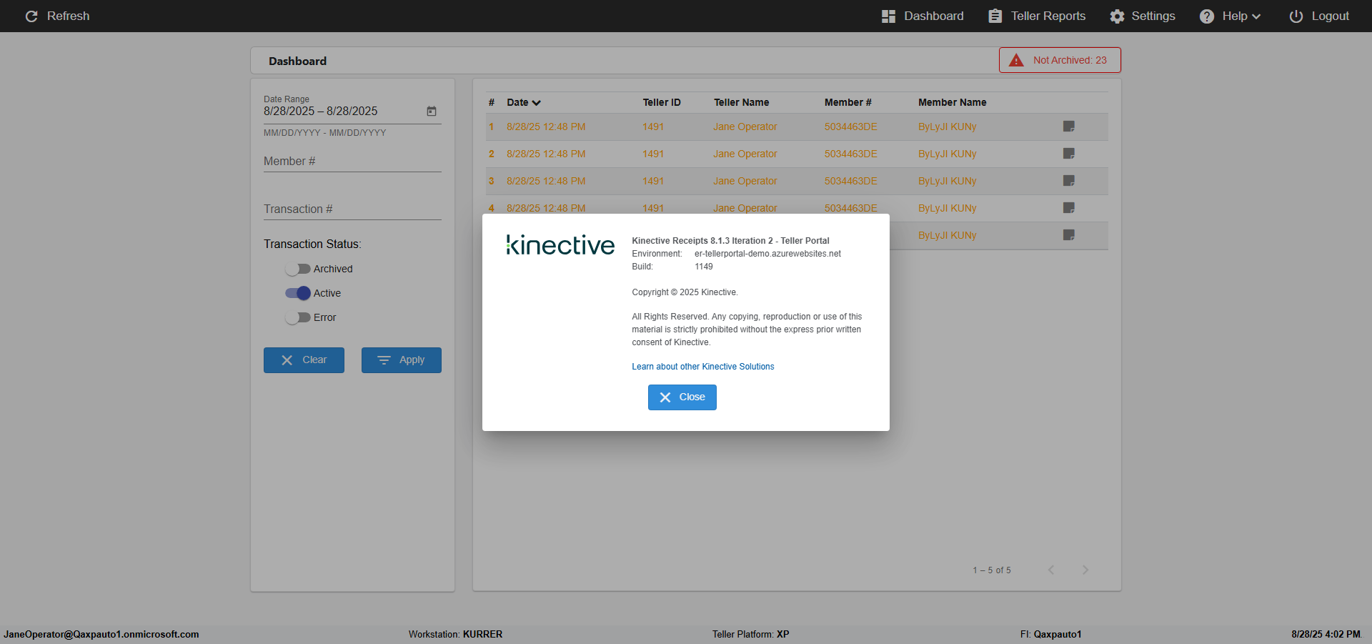 --- 28 Aug 16:01:08 966 - TestCaseID:: verifyDocumentationAboutInDashBoardPage --- 28 Aug 16:01:18 944 - 9 - Driver::initialize::Get - com.imm.ereceipt.support.WebDriverFactory.get(WebDriverFactory.java:565) verify Documentation About In DashBoard Page Steps: ***** verify Documentation About In DashBoard Page ***** --- 28 Aug 16:01:25 105 - Page URL:: https://login.microsoftonline.com/common/oauth2/v2.0/authorize?client_id=b1f00368-6c8e-4851-b2e7-1ec984ebf081&scope=https%3a%2f%2fimmapps.onmicrosoft.com%2fapiserver%2fall%20openid%20profile%20offline_access&redirect_uri=https%3a%2f%2fer-tellerportal-demo.azurewebsites.net&client-request-id=0198f245-4335-7ddb-b3fe-acbdea222800&response_mode=fragment&client_info=1&nonce=0198f245-4338-7c5b-8b11-b4b130848ca6&state=eyjpzci6ijaxothmmjq1ltqzmzgtnzyxmi1hodazltnlngflyzhjzwnjnyisim1ldgeionsiaw50zxjhy3rpb25uexblijoicmvkaxjly3qifx0%3d&x-client-sku=msal.js.browser&x-client-ver=4.11.1&response_type=code&code_challenge=iq9lgrjhorctgkjujgreea4bieobzhcitbgzqq7n2sg&code_challenge_method=s256&sso_reload=true --- 28 Aug 16:01:25 108 - 3 - Page Load Wait: (Sync) - com.imm.ereceipt.support.Utils.waitForPageLoad(Utils.java:112) --- 28 Aug 16:01:25 267 - Element is displayed:: [[RemoteWebDriver: chrome on Windows 10 (b3b11409a43ccb8c297fce1ee821292e)] -> xpath: //input[@id='i0116']] Successfully navigated to 'eReceipts FI Admin' Page --- 28 Aug 16:01:25 365 - Element is displayed:: [[RemoteWebDriver: chrome on Windows 10 (b3b11409a43ccb8c297fce1ee821292e)] -> xpath: //input[@id='i0116']] --- 28 Aug 16:01:25 489 - Element is displayed:: [[RemoteWebDriver: chrome on Windows 10 (b3b11409a43ccb8c297fce1ee821292e)] -> id: idSIButton9] Text field 'User ID', Password' and button 'Login, 'Cancel' are displayed in the 'Login' page --- 28 Aug 16:01:25 591 - Element is displayed:: [[RemoteWebDriver: chrome on Windows 10 (b3b11409a43ccb8c297fce1ee821292e)] -> xpath: //input[@id='i0116']] --- 28 Aug 16:01:25 697 - Element is displayed:: [[RemoteWebDriver: chrome on Windows 10 (b3b11409a43ccb8c297fce1ee821292e)] -> xpath: //input[@id='i0116']] --- 28 Aug 16:01:29 783 - Page URL:: https://login.microsoftonline.com/common/oauth2/v2.0/authorize?client_id=b1f00368-6c8e-4851-b2e7-1ec984ebf081&scope=https%3a%2f%2fimmapps.onmicrosoft.com%2fapiserver%2fall%20openid%20profile%20offline_access&redirect_uri=https%3a%2f%2fer-tellerportal-demo.azurewebsites.net&client-request-id=0198f245-4335-7ddb-b3fe-acbdea222800&response_mode=fragment&client_info=1&nonce=0198f245-4338-7c5b-8b11-b4b130848ca6&state=eyjpzci6ijaxothmmjq1ltqzmzgtnzyxmi1hodazltnlngflyzhjzwnjnyisim1ldgeionsiaw50zxjhy3rpb25uexblijoicmvkaxjly3qifx0%3d&x-client-sku=msal.js.browser&x-client-ver=4.11.1&response_type=code&code_challenge=iq9lgrjhorctgkjujgreea4bieobzhcitbgzqq7n2sg&code_challenge_method=s256&sso_reload=true --- 28 Aug 16:01:29 784 - 3 - Page Load Wait: (Sync) - com.imm.ereceipt.support.Utils.waitForPageLoad(Utils.java:112) --- 28 Aug 16:01:33 529 - Page URL:: https://login.microsoftonline.com/common/oauth2/v2.0/authorize?client_id=b1f00368-6c8e-4851-b2e7-1ec984ebf081&scope=https%3a%2f%2fimmapps.onmicrosoft.com%2fapiserver%2fall%20openid%20profile%20offline_access&redirect_uri=https%3a%2f%2fer-tellerportal-demo.azurewebsites.net&client-request-id=0198f245-4335-7ddb-b3fe-acbdea222800&response_mode=fragment&client_info=1&nonce=0198f245-4338-7c5b-8b11-b4b130848ca6&state=eyjpzci6ijaxothmmjq1ltqzmzgtnzyxmi1hodazltnlngflyzhjzwnjnyisim1ldgeionsiaw50zxjhy3rpb25uexblijoicmvkaxjly3qifx0%3d&x-client-sku=msal.js.browser&x-client-ver=4.11.1&response_type=code&code_challenge=iq9lgrjhorctgkjujgreea4bieobzhcitbgzqq7n2sg&code_challenge_method=s256&sso_reload=true --- 28 Aug 16:01:33 530 - 3 - Page Load Wait: (Sync) - com.imm.ereceipt.support.Utils.waitForPageLoad(Utils.java:112) Password text field is shown [ScreenShot] --- 28 Aug 16:01:37 332 - Element is displayed:: [[RemoteWebDriver: chrome on Windows 10 (b3b11409a43ccb8c297fce1ee821292e)] -> xpath: //input[@id='i0118']] --- 28 Aug 16:01:37 436 - Element is displayed:: [[RemoteWebDriver: chrome on Windows 10 (b3b11409a43ccb8c297fce1ee821292e)] -> xpath: //input[@id='i0118']] --- 28 Aug 16:01:40 873 - Page URL:: https://login.microsoftonline.com/common/oauth2/v2.0/authorize?client_id=b1f00368-6c8e-4851-b2e7-1ec984ebf081&scope=https%3a%2f%2fimmapps.onmicrosoft.com%2fapiserver%2fall%20openid%20profile%20offline_access&redirect_uri=https%3a%2f%2fer-tellerportal-demo.azurewebsites.net&client-request-id=0198f245-4335-7ddb-b3fe-acbdea222800&response_mode=fragment&client_info=1&nonce=0198f245-4338-7c5b-8b11-b4b130848ca6&state=eyjpzci6ijaxothmmjq1ltqzmzgtnzyxmi1hodazltnlngflyzhjzwnjnyisim1ldgeionsiaw50zxjhy3rpb25uexblijoicmvkaxjly3qifx0%3d&x-client-sku=msal.js.browser&x-client-ver=4.11.1&response_type=code&code_challenge=iq9lgrjhorctgkjujgreea4bieobzhcitbgzqq7n2sg&code_challenge_method=s256&sso_reload=true --- 28 Aug 16:01:40 874 - 3 - Page Load Wait: (Sync) - com.imm.ereceipt.support.Utils.waitForPageLoad(Utils.java:112) Entered values for the fields in 'Login' page [ScreenShot] logged with the Username:JaneOperator@Qaxpauto1.onmicrosoft.com --- 28 Aug 16:01:46 053 - Page URL:: https://login.microsoftonline.com/common/login --- 28 Aug 16:01:46 054 - 4 - Page Load Wait: (Sync) - com.imm.ereceipt.support.Utils.waitForPageLoad(Utils.java:112) --- 28 Aug 16:01:56 068 - Page URL:: https://er-tellerportal-demo.azurewebsites.net/dashboard --- 28 Aug 16:01:56 069 - 6 - Page Load Wait: (Sync) - com.imm.ereceipt.support.Utils.waitForPageLoad(Utils.java:112) --- 28 Aug 16:01:59 635 - Page URL:: https://er-tellerportal-demo.azurewebsites.net/dashboard --- 28 Aug 16:01:59 636 - 3 - Page Load Wait: (Sync) - com.imm.ereceipt.support.Utils.waitForPageLoad(Utils.java:112) --- 28 Aug 16:01:59 784 - Element is displayed:: [[RemoteWebDriver: chrome on Windows 10 (b3b11409a43ccb8c297fce1ee821292e)] -> id: immOnFilter] --- 28 Aug 16:02:03 064 - Page URL:: https://er-tellerportal-demo.azurewebsites.net/dashboard 