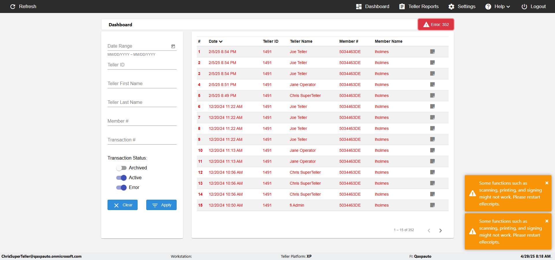 ({Toggel=, Archived Transactions=yes, Description=verify End TO End Test OF Normal Teller In Ereceipt Page, Email=FALSE, Archive=TRUE, Document Type=SSN, Notify=TRUE, SignatureTab=Touch,, DisbursedExpression=|-10*5, Operation=, Teller LastName=, Disbursed cash=1-1|2-2|5-2|10-1|20-2|50-1|100-1|Coins-3, errorint=, TestID=verifyEndTOEndTestOFNormalTellerInEreceipt, Print=FALSE, DisbursedExpressionValue=FALSE, Phone=(555) 021-3315, ReceivedCashValue=FALSE, Member=, UserPwd=iMM2022!, Transtatus=Archived-false;Active-true;Error-false, Docment ID=216554, Teller=, Teller FirstName=, errorMessage=, ReceivedExpressionValue=TRUE, Date=, Platfrom=, Received cash=1-1|2-2|5-2|10-1|20-2|50-1|100-1|Coins-3, Transaction=, Header=, Expression=, Username=ChrisSuperTeller@Qaxpauto.onmicrosoft.com, DisbursedCashValue=TRUE, FullName=, ReceivedExpression=|+100*2, SMS=FALSE, Memo=eReceipts Demo})