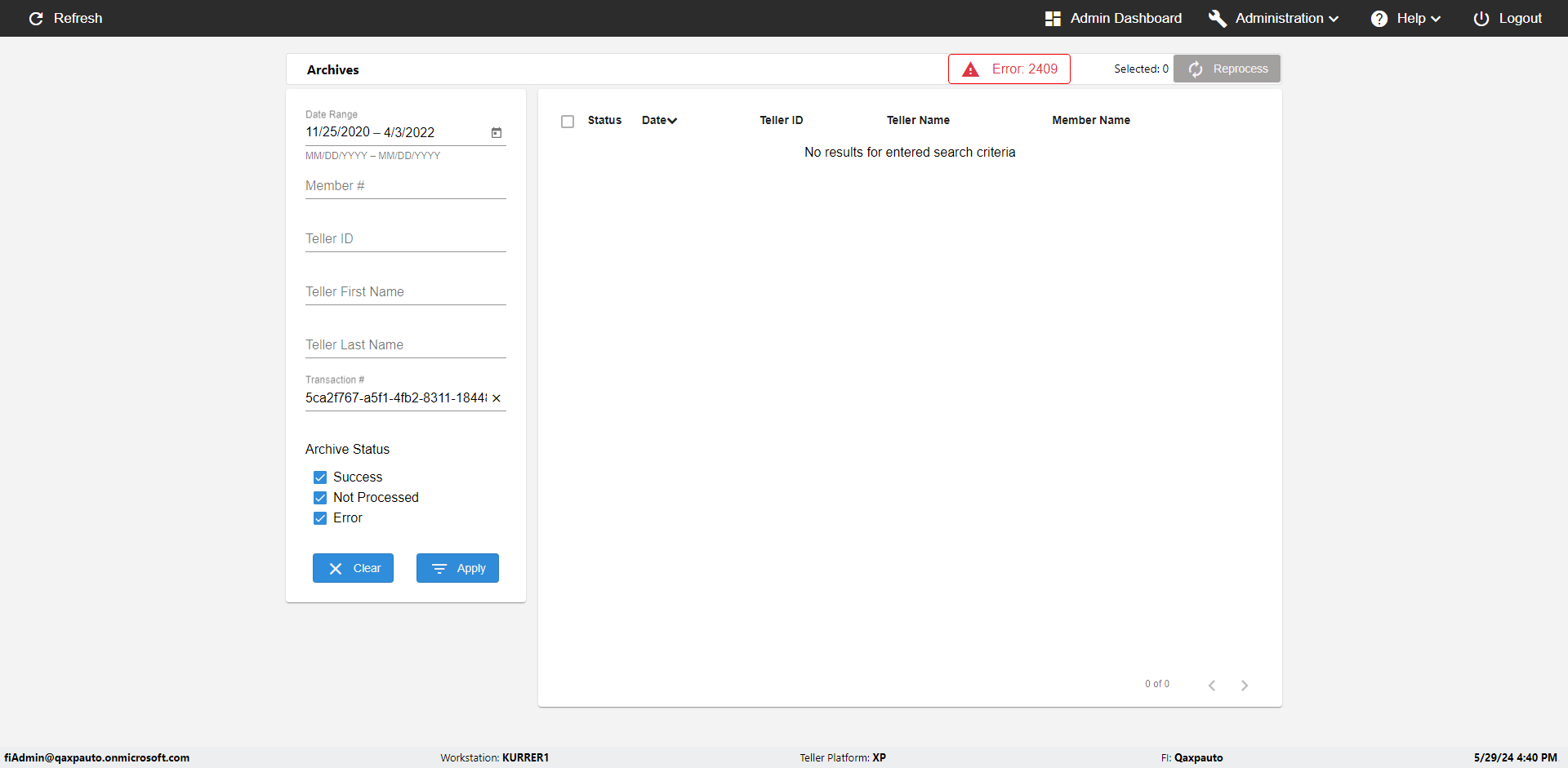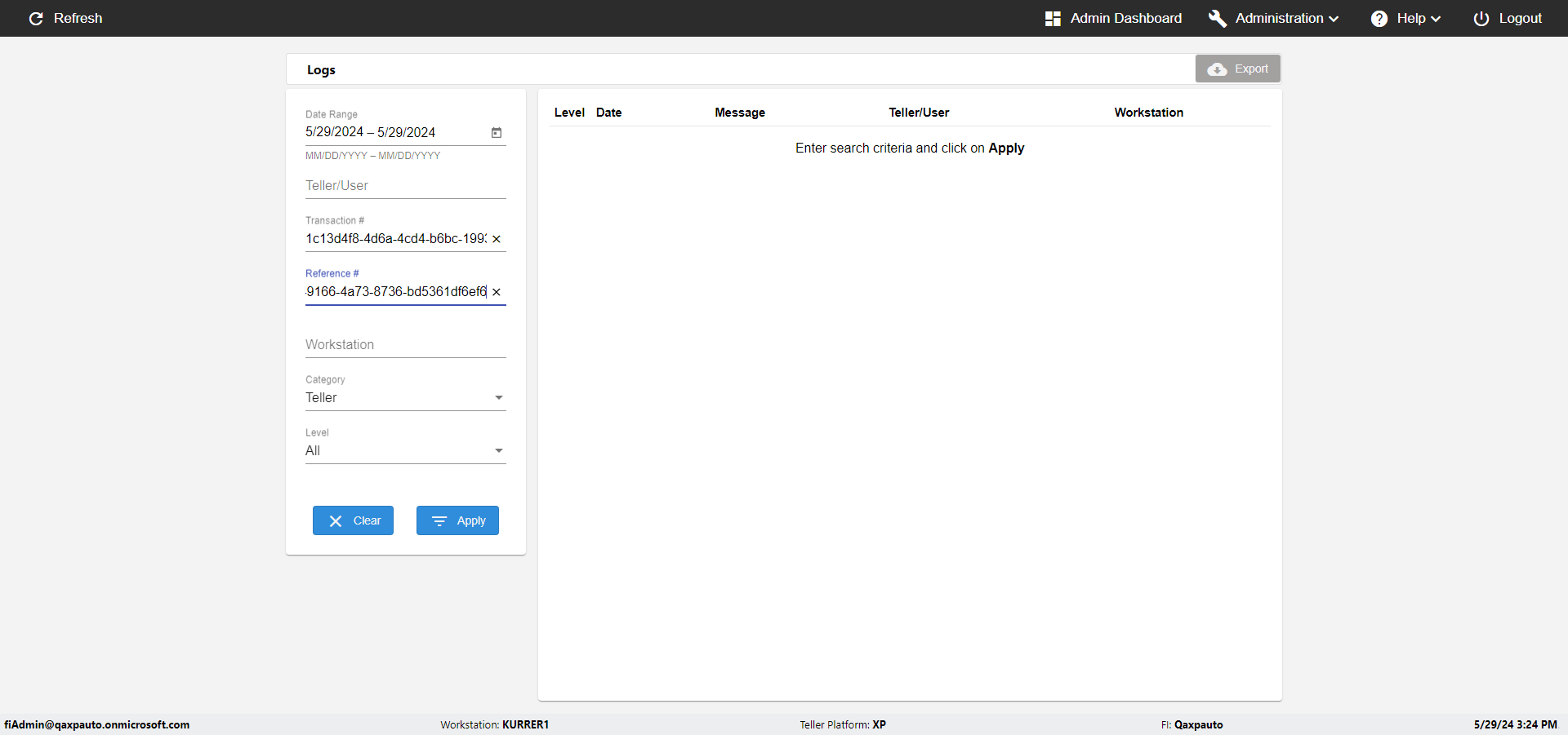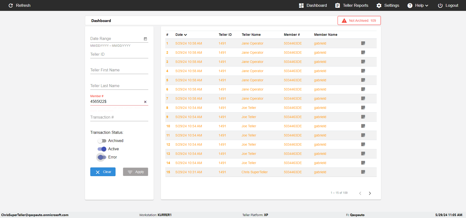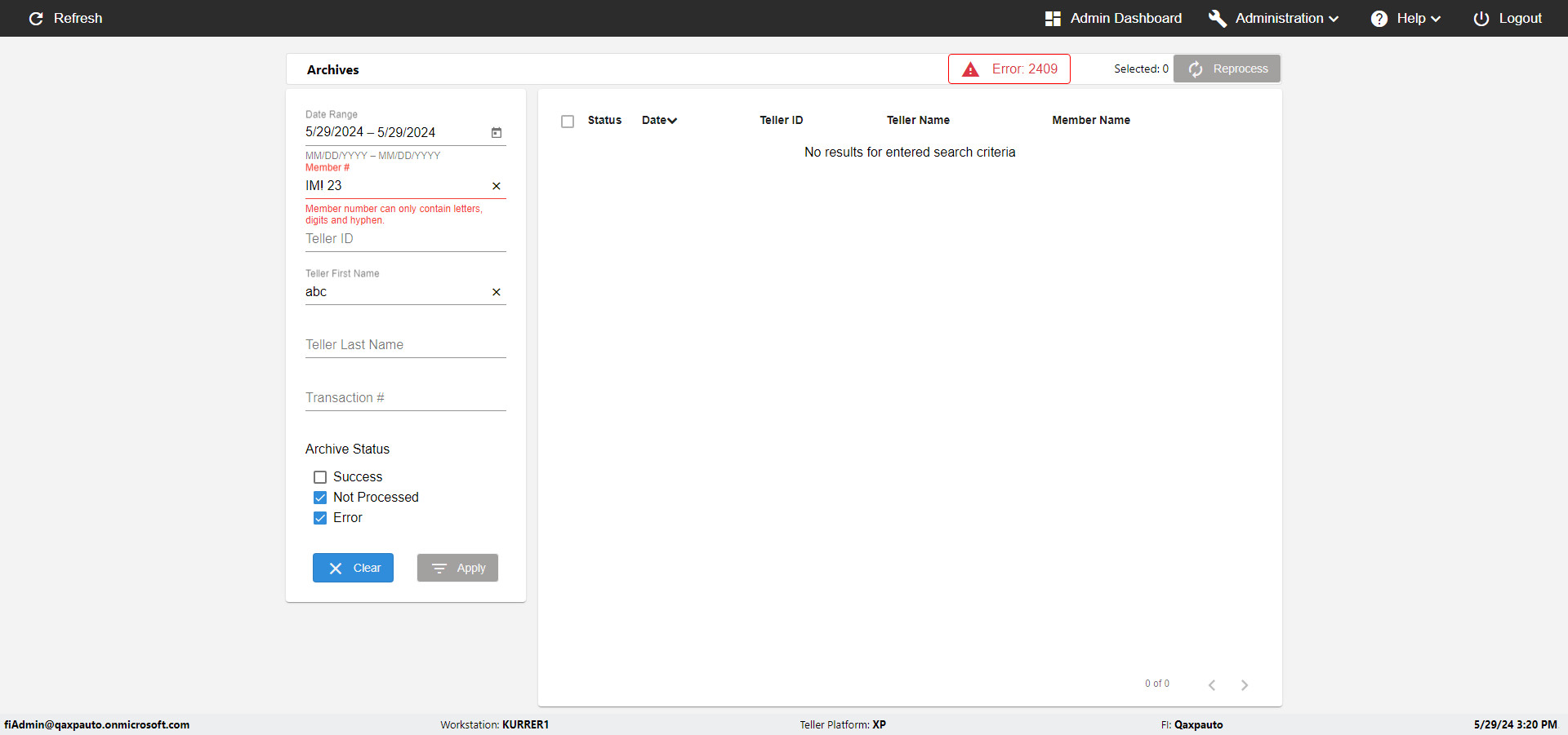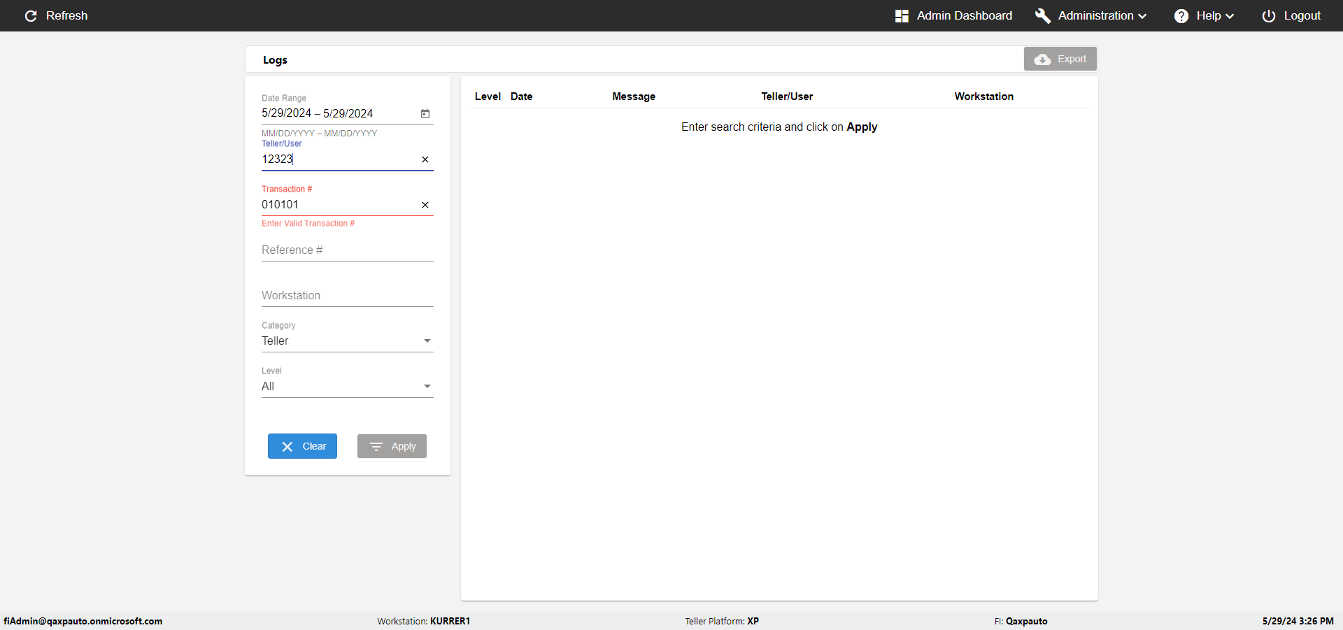 | {UserPwd=iMM2022!, Description=verify Error Messages in Report Page for Teller ID, Teller ID=%&^heg, errorMessage=Special characters not allowed., Teller Email=, View=, Date=, Clear=, Workstation=, errorint=1, TestID=verifyErrorMessagesInReports, Transaction=, Header=, Username=ChrisSuperTeller@Qaxpauto.onmicrosoft.com, Export=, Member #=, Search Text=, Level=} |