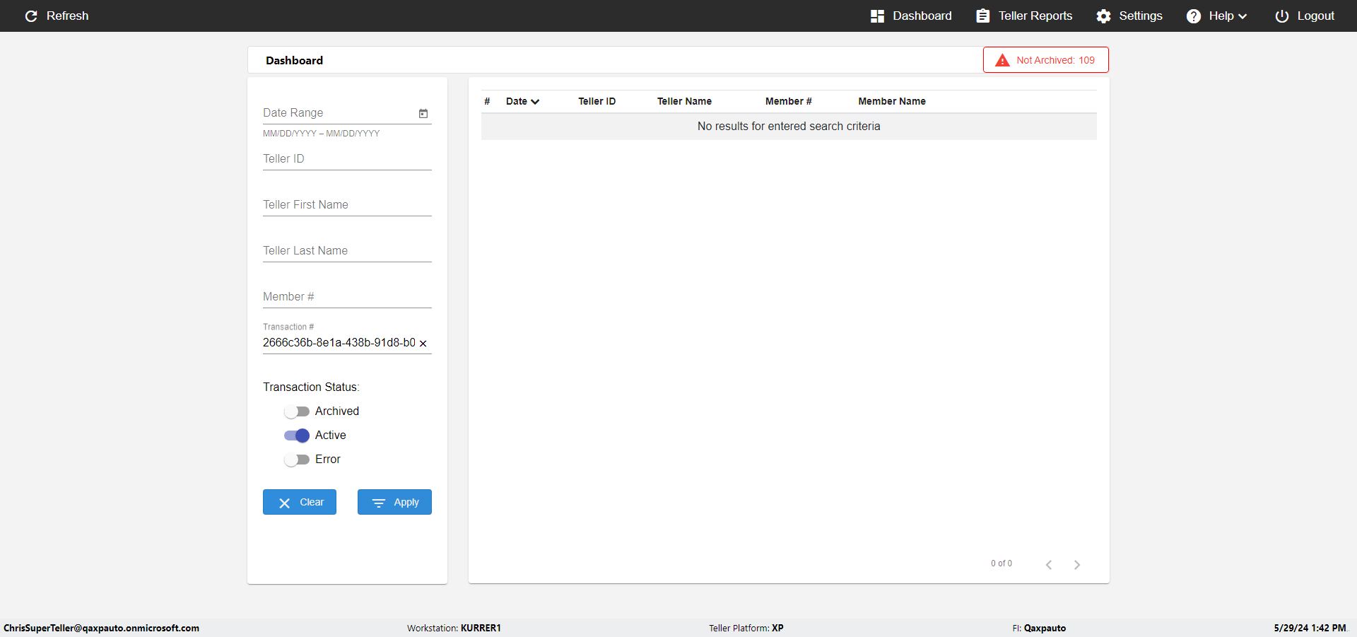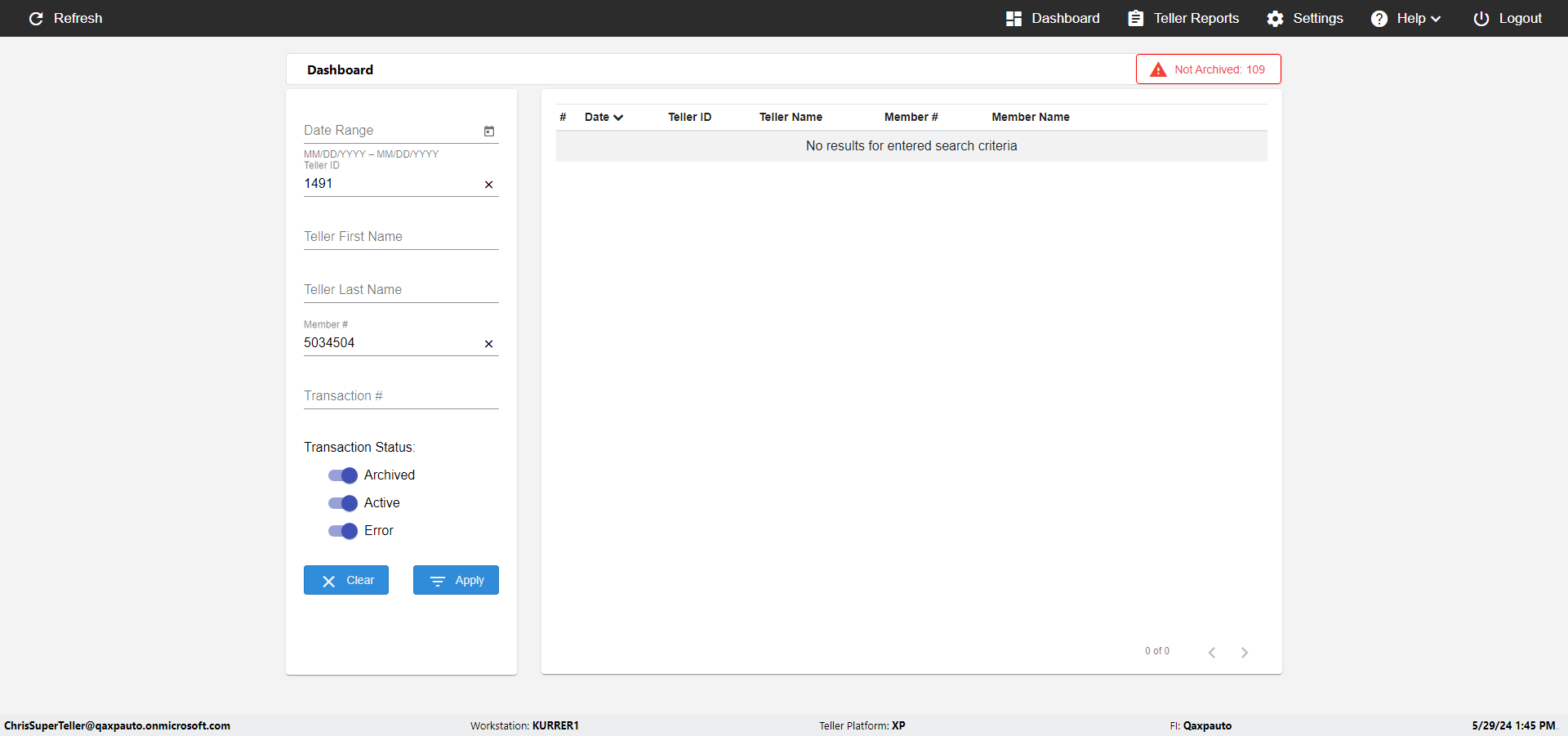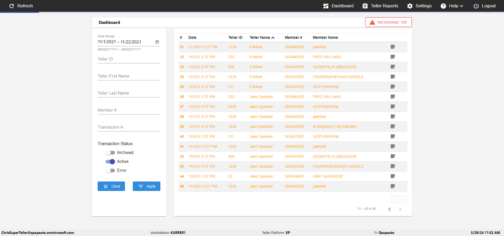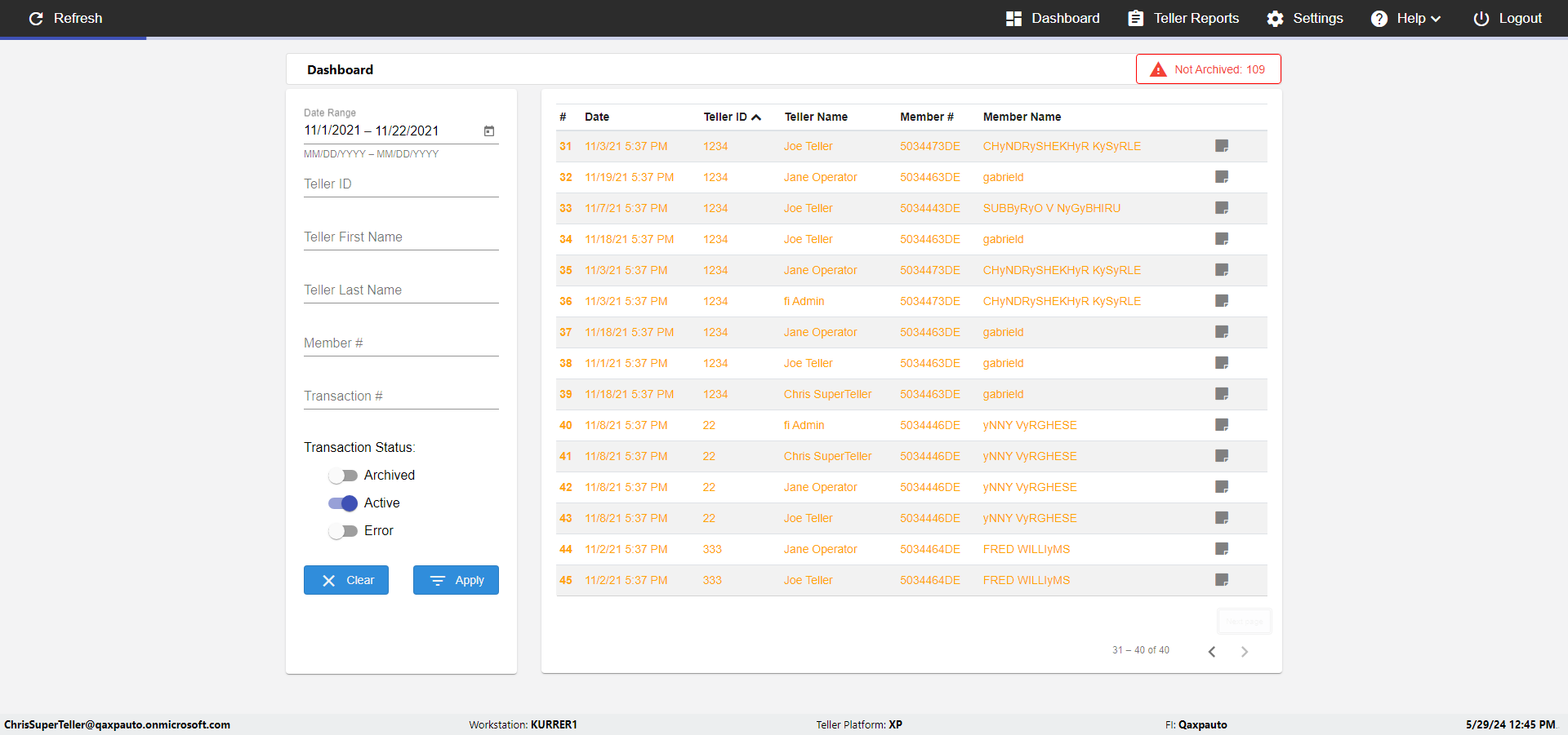 | {UserPwd=iMM2022!, Description=verify Error Messages in Report Page for Teller ID, Teller ID=%&^heg, errorMessage=Special characters not allowed., Teller Email=, View=, Date=, Clear=, Workstation=, errorint=1, TestID=verifyErrorMessagesInReports, Transaction=, Header=, Username=ChrisSuperTeller@Qaxpauto.onmicrosoft.com, Export=, Member #=, Search Text=, Level=} |