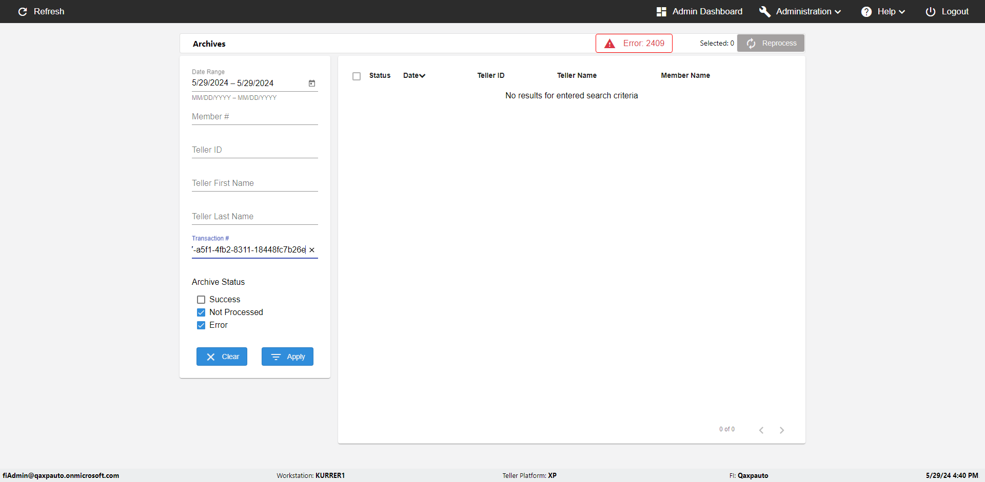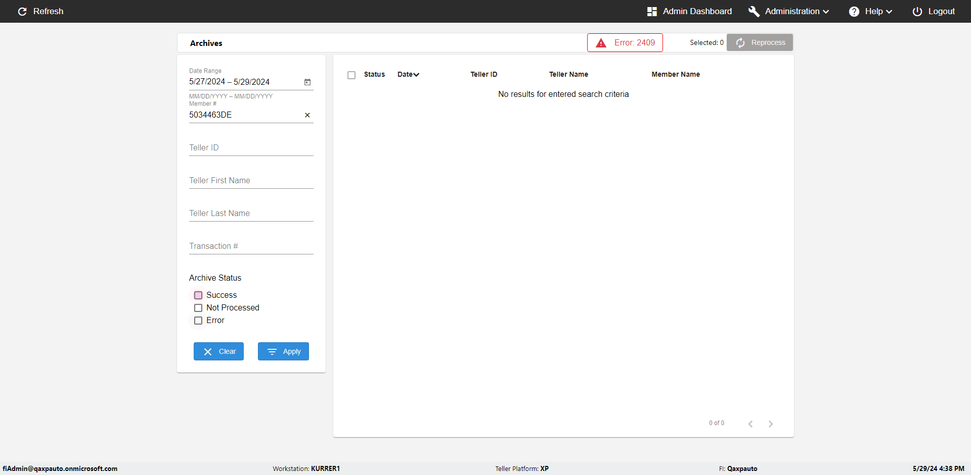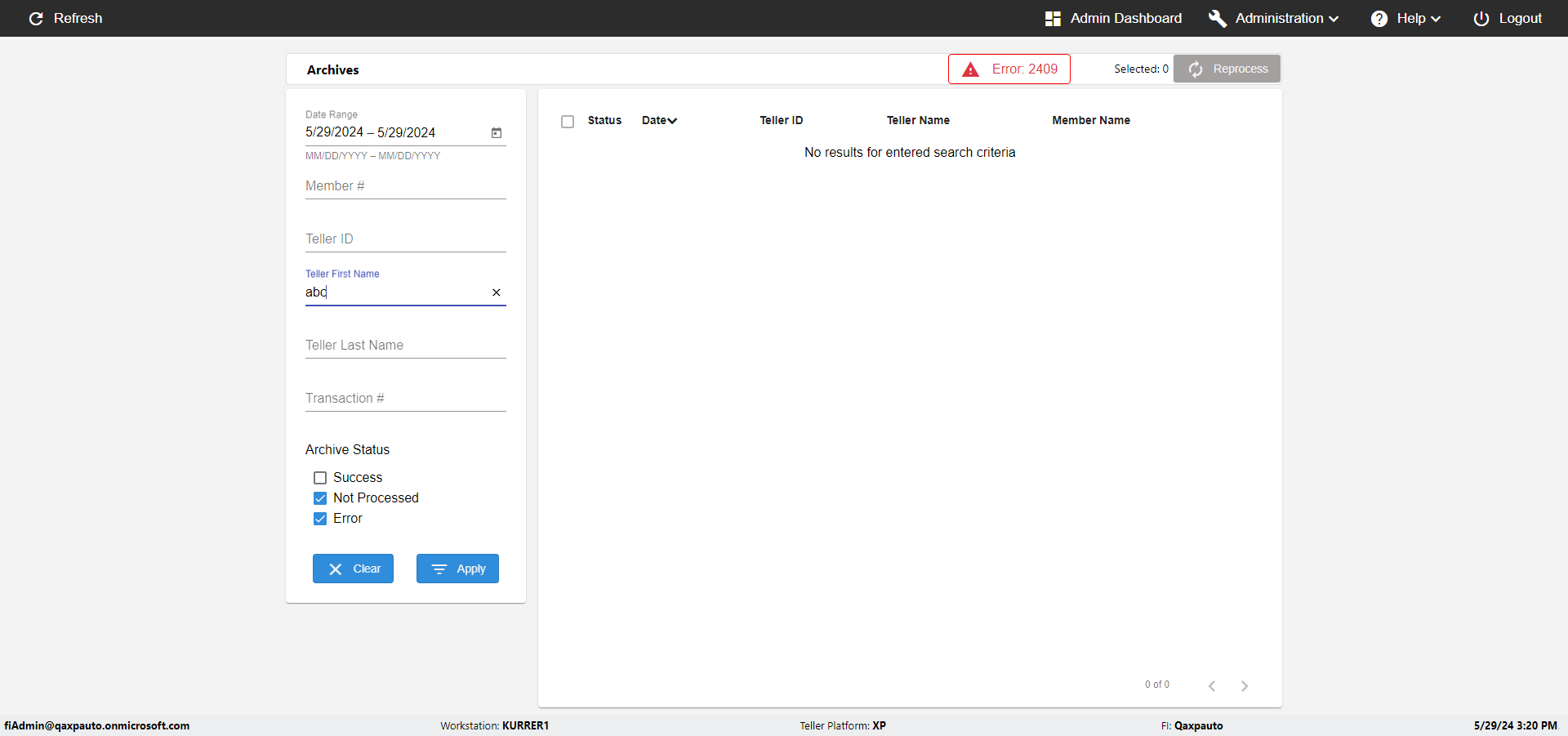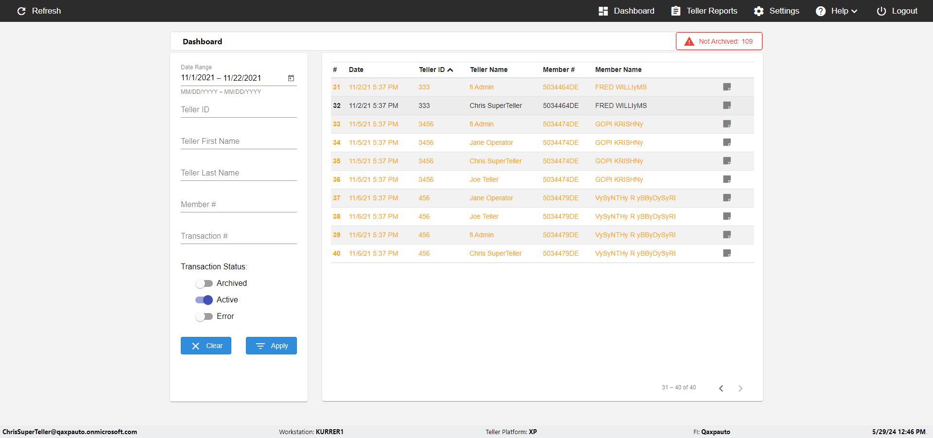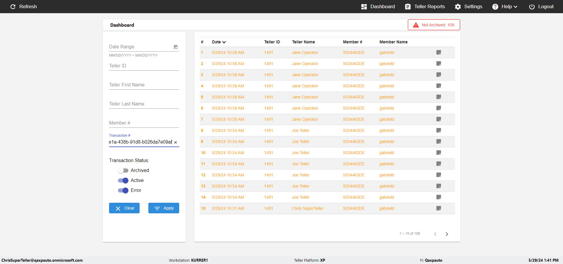 | {UserPwd=iMM2022!, Description=verify Error Messages in Report Page for Teller ID, Teller ID=%&^heg, errorMessage=Special characters not allowed., Teller Email=, View=, Date=, Clear=, Workstation=, errorint=1, TestID=verifyErrorMessagesInReports, Transaction=, Header=, Username=ChrisSuperTeller@Qaxpauto.onmicrosoft.com, Export=, Member #=, Search Text=, Level=} |