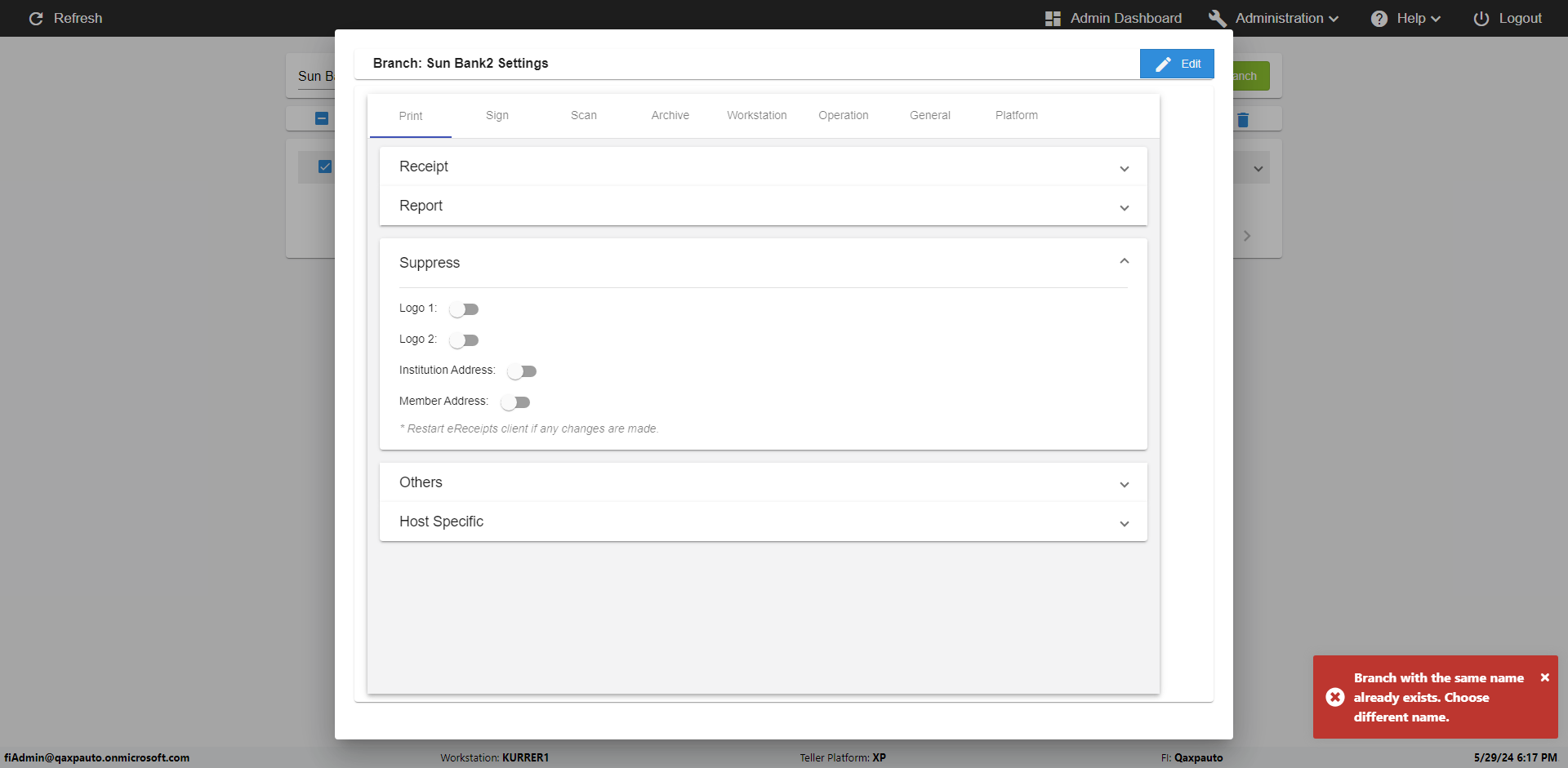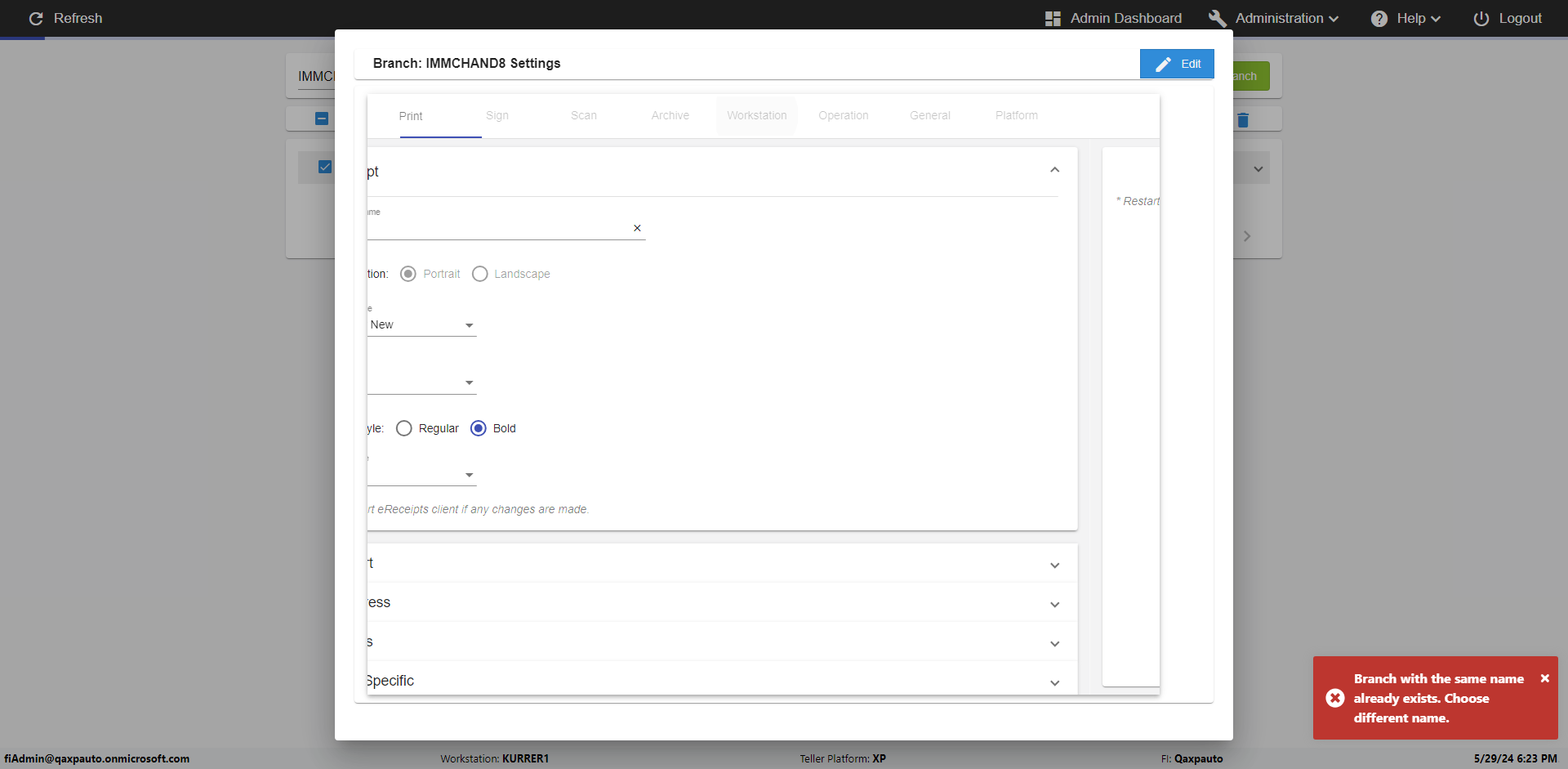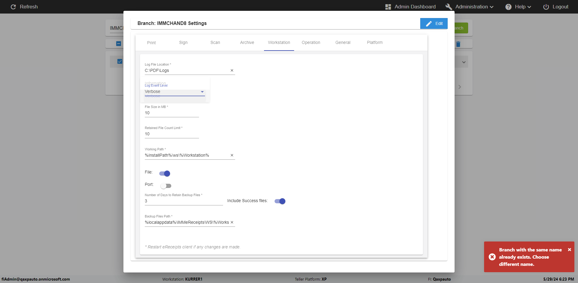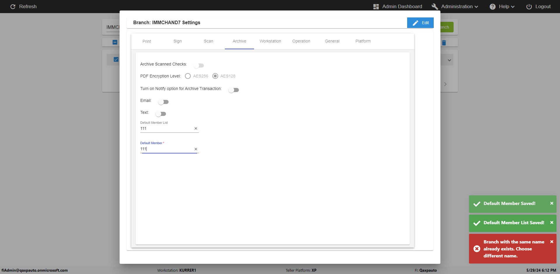 | {Archived Transactions=, Archive=, print signatur=, Name=, MultipleWorkstation=, WorkstationDeleteOption=, BranchName=QABranch, Agent=, UserPwd=iMM2022!, BranchDeleteOption=, Receipt=, Role=, Brand=, Print signature line=, TimeZone=, Header=, MappedOption=, Scan=, PortNumber=, FromWks=, FromBranch=Sun National, Description=verify Branch In Branches Page, weeks=, Operation=, Clear=, TestID=verifyBranchInBranchesPage, Phone=, WorkstationName=, ToBranch=Test Branch, ToWks=, Subscription Names=, FilePath=, Transtatus=Archived-false;Active-true;Error-false, Report=, Index_Field_Name=, Agents=, Text=, Hold Notice=, Suppress=, SchedualType=, Date=, Platfrom=, GroupId=, print Disburstments=, SMTP=, Imaging System=, MultipleBranches=, Username=fiAdmin@Qaxpauto.onmicrosoft.com, Sign=} |