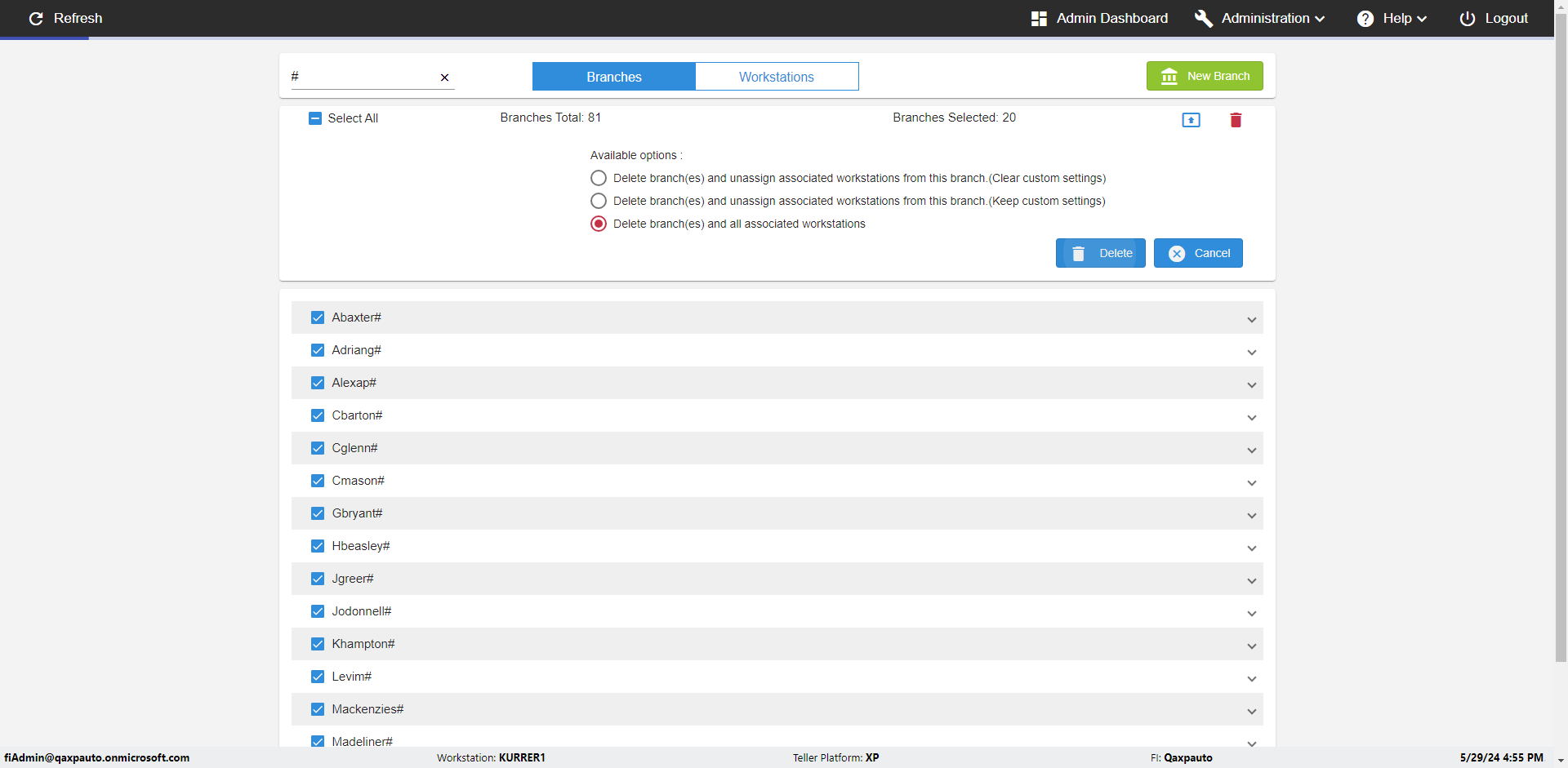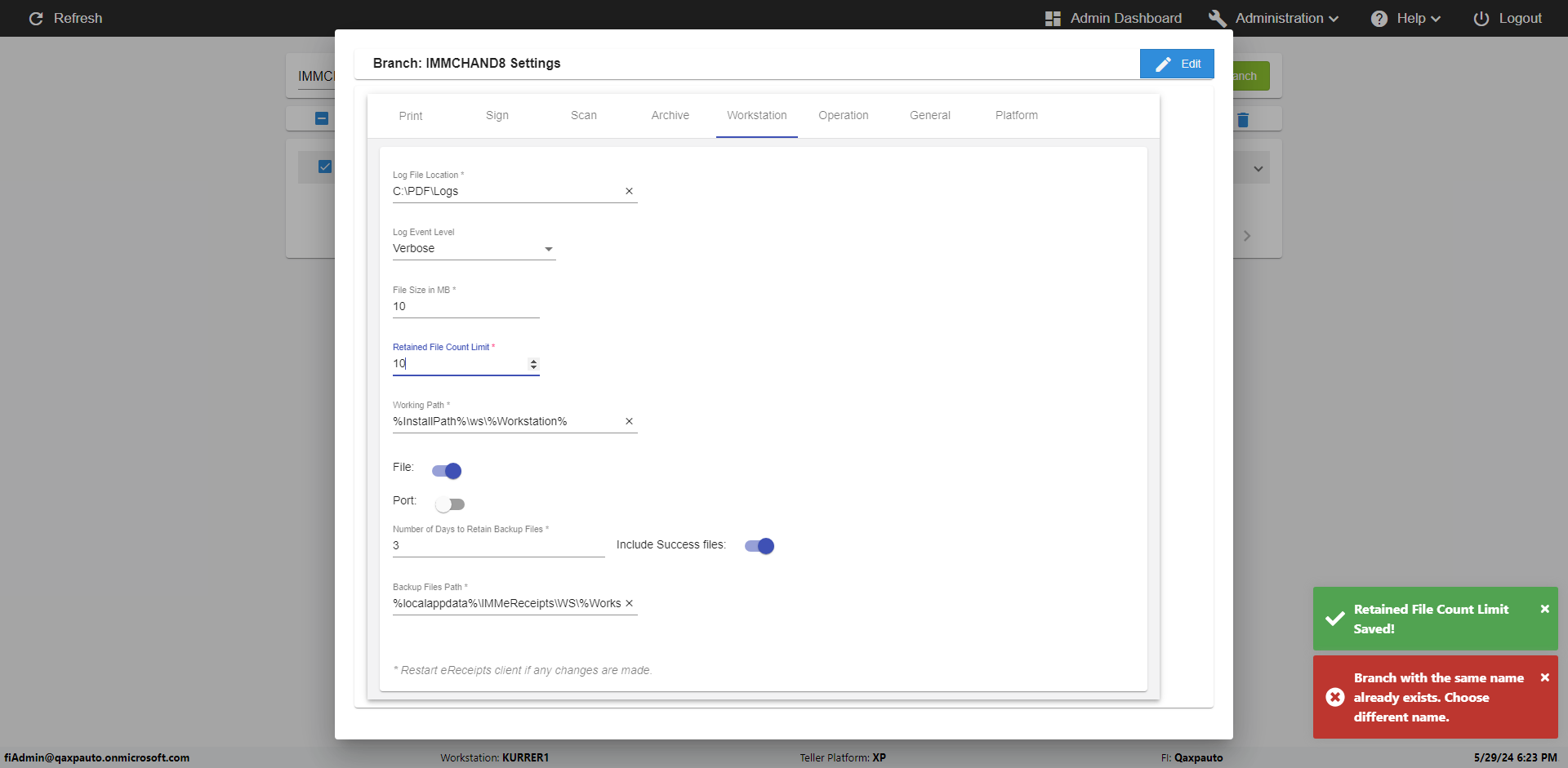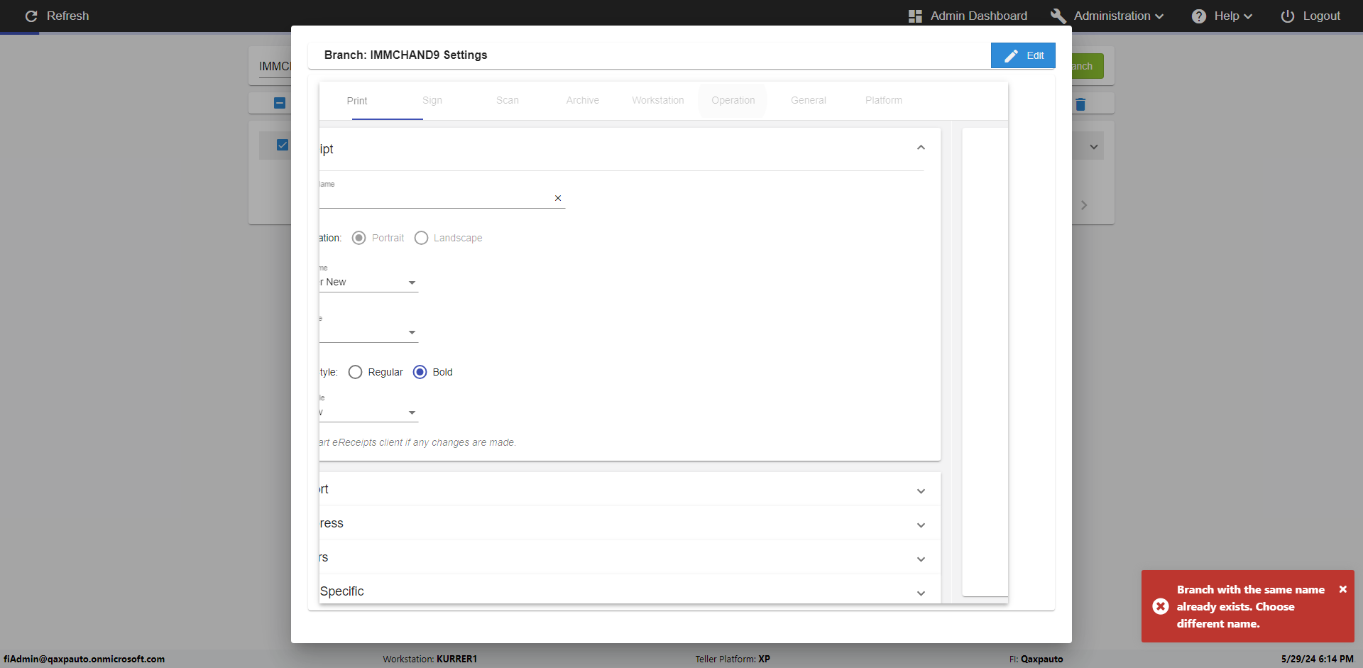 | {Archived Transactions=, Archive=, print signatur=, Name=, MultipleWorkstation=, WorkstationDeleteOption=, BranchName=QABranch, Agent=, UserPwd=iMM2022!, BranchDeleteOption=, Receipt=, Role=, Brand=, Print signature line=, TimeZone=, Header=, MappedOption=, Scan=, PortNumber=, FromWks=, FromBranch=Sun National, Description=verify Branch In Branches Page, weeks=, Operation=, Clear=, TestID=verifyBranchInBranchesPage, Phone=, WorkstationName=, ToBranch=Test Branch, ToWks=, Subscription Names=, FilePath=, Transtatus=Archived-false;Active-true;Error-false, Report=, Index_Field_Name=, Agents=, Text=, Hold Notice=, Suppress=, SchedualType=, Date=, Platfrom=, GroupId=, print Disburstments=, SMTP=, Imaging System=, MultipleBranches=, Username=fiAdmin@Qaxpauto.onmicrosoft.com, Sign=} |
