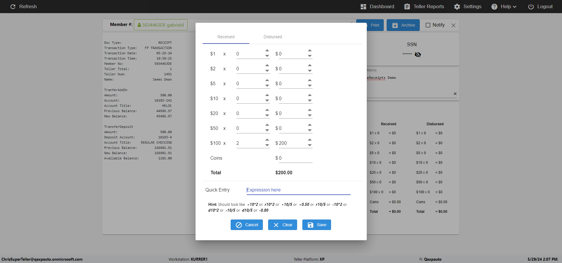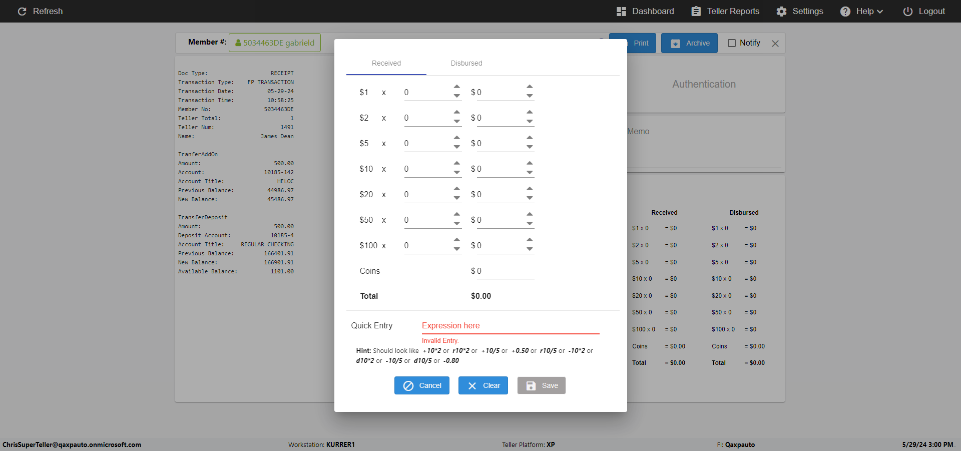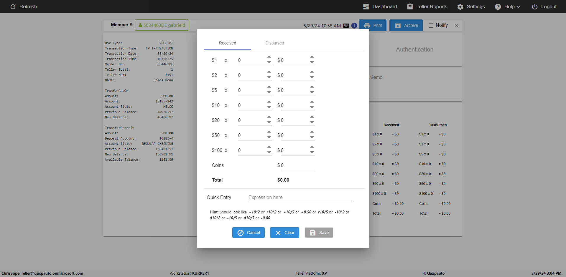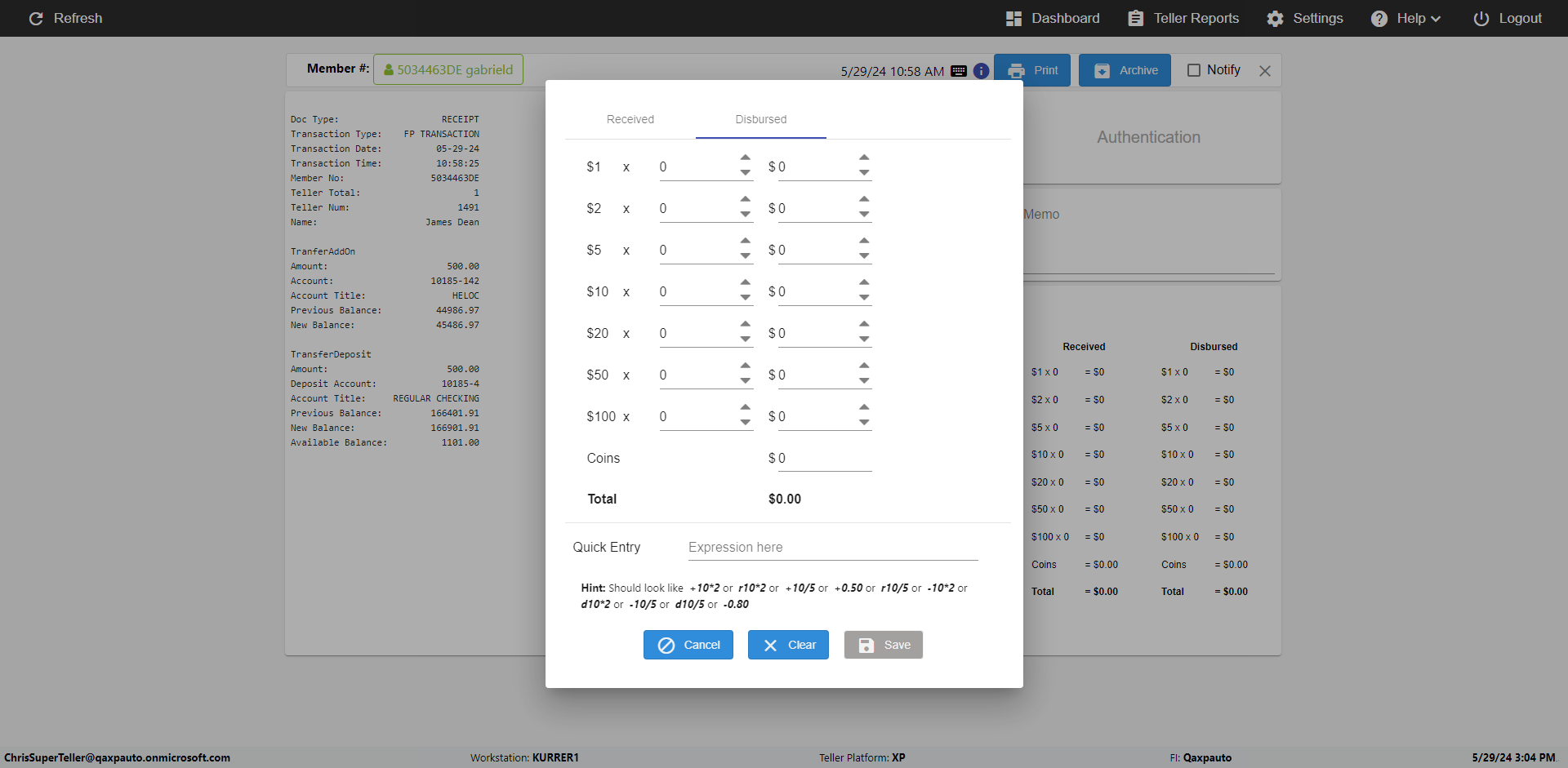 | {Toggel=, Archived Transactions=yes, Description=verify End TO End Test OF Normal Teller In Ereceipt Page, Email=FALSE, Archive=TRUE, Document Type=SSN, Notify=TRUE, SignatureTab=Touch,, DisbursedExpression=|-10*5, Operation=, Teller LastName=, Disbursed cash=1-1|2-2|5-2|10-1|20-2|50-1|100-1|Coins-3, errorint=, TestID=verifyEndTOEndTestOFNormalTellerInEreceipt, Print=FALSE, DisbursedExpressionValue=FALSE, Phone=(555) 021-3315, ReceivedCashValue=FALSE, Member=, UserPwd=iMM2022!, Transtatus=Archived-false;Active-true;Error-false, Docment ID=216554, Teller=, Teller FirstName=, errorMessage=, ReceivedExpressionValue=TRUE, Date=, Platfrom=, Received cash=1-1|2-2|5-2|10-1|20-2|50-1|100-1|Coins-3, Transaction=, Header=, Expression=, Username=ChrisSuperTeller@Qaxpauto.onmicrosoft.com, DisbursedCashValue=TRUE, FullName=, ReceivedExpression=|+100*2, SMS=FALSE, Memo=eReceipts Demo} |