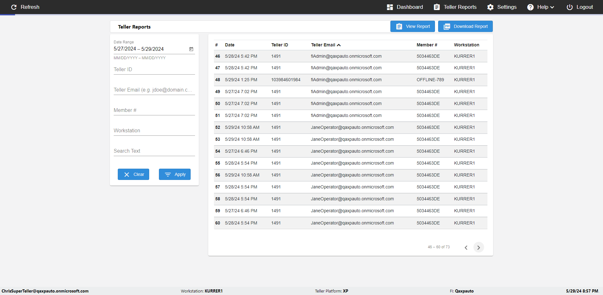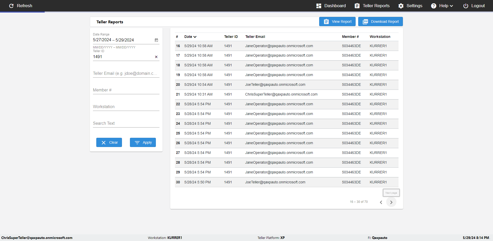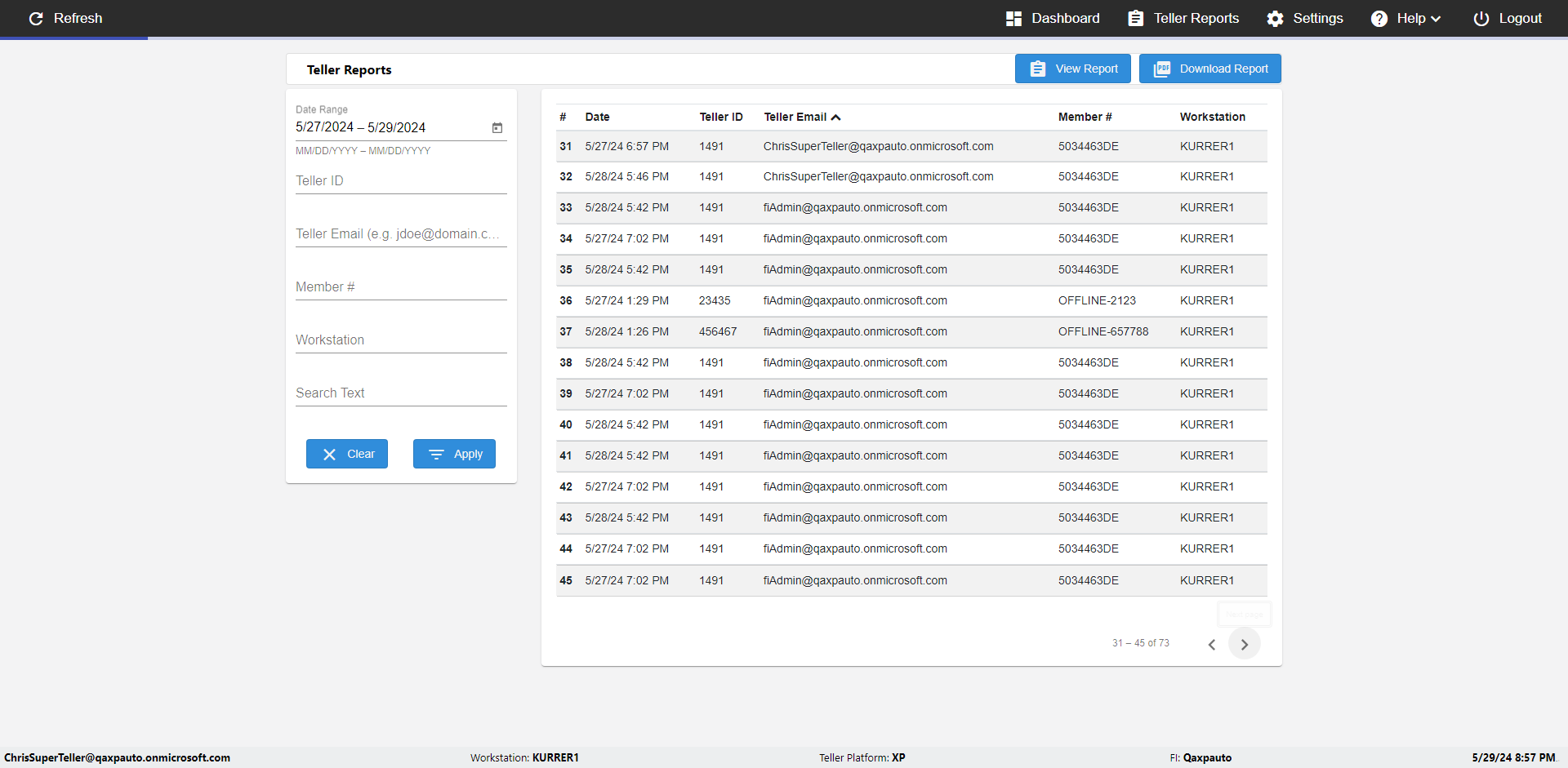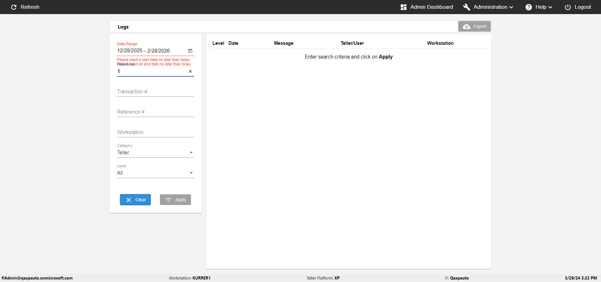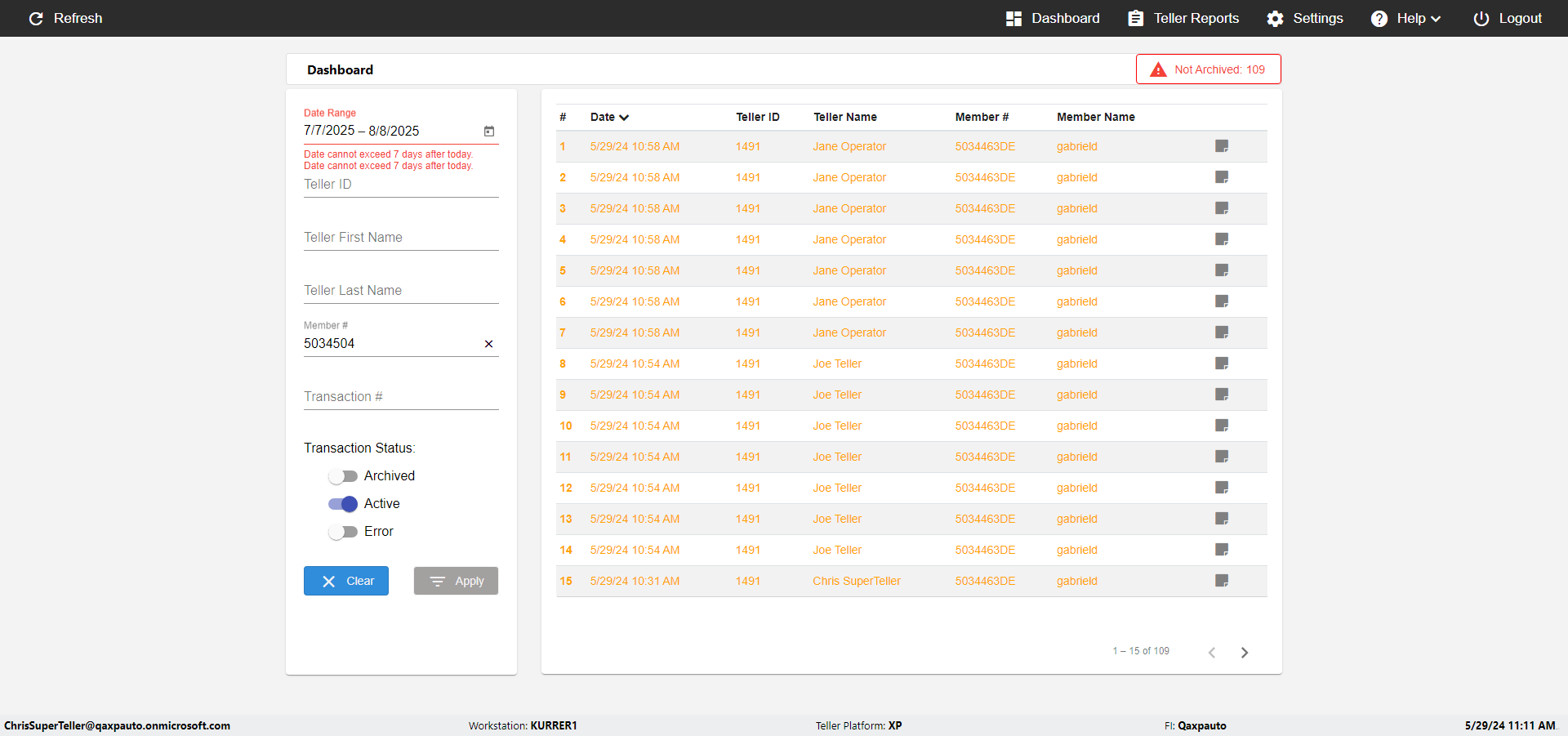 | {UserPwd=iMM2022!, Description=verify Error Messages in Report Page for Date, Teller ID=, errorMessage=Date cannot exceed 7 days after today.;Date cannot exceed 7 days after today., Teller Email=, View=, Date=12/28/2025 - 2/28/2026, Clear=, Workstation=, errorint=2, TestID=verifyErrorMessagesInReports, Transaction=, Header=, Username=ChrisSuperTeller@Qaxpauto.onmicrosoft.com, Export=, Member #=, Search Text=, Level=} |