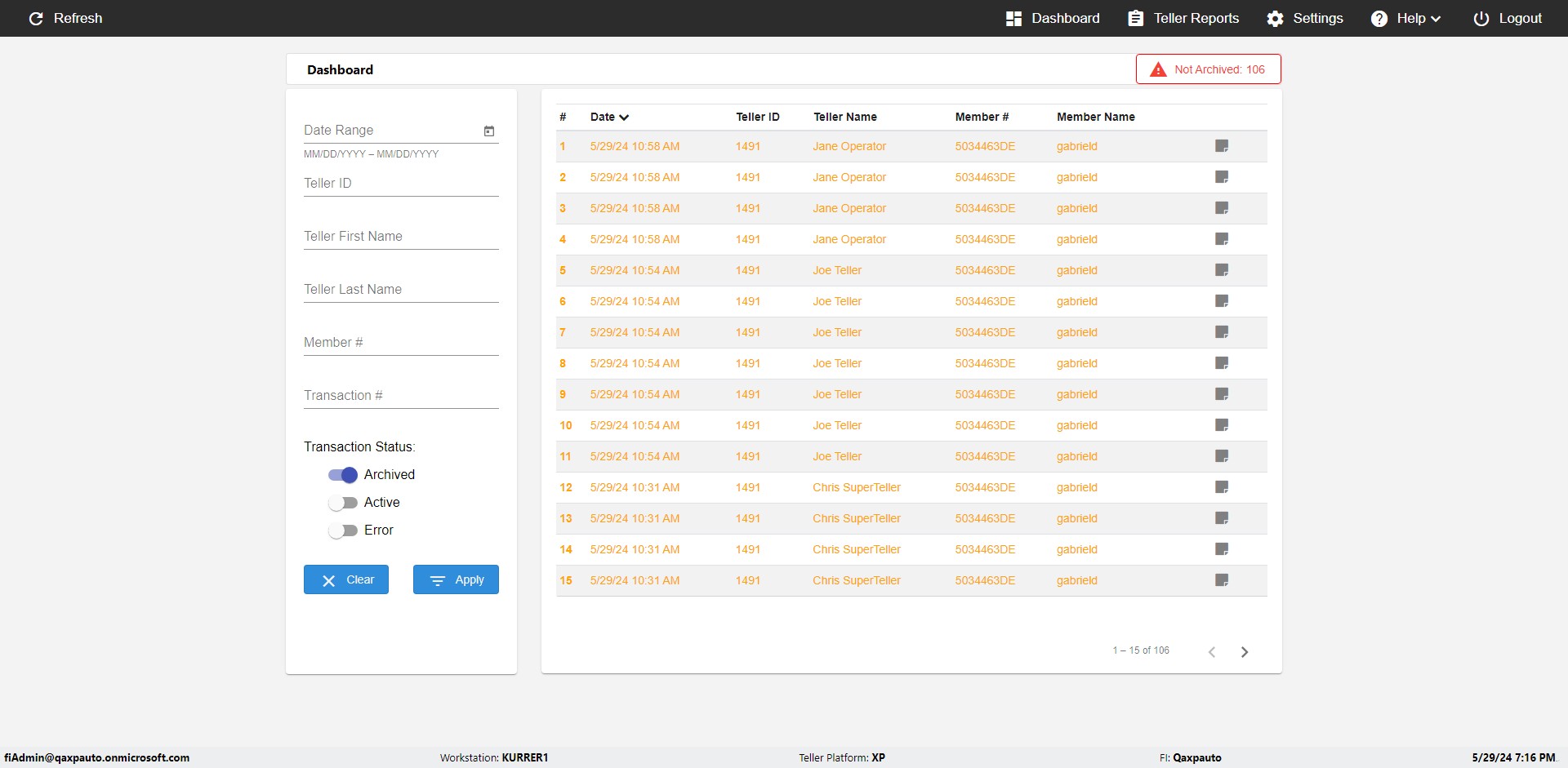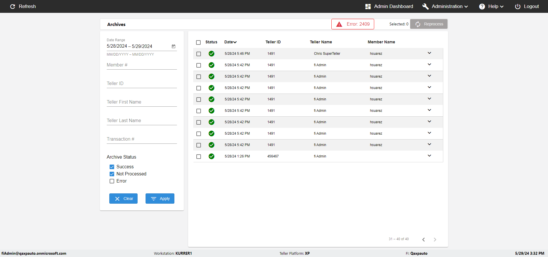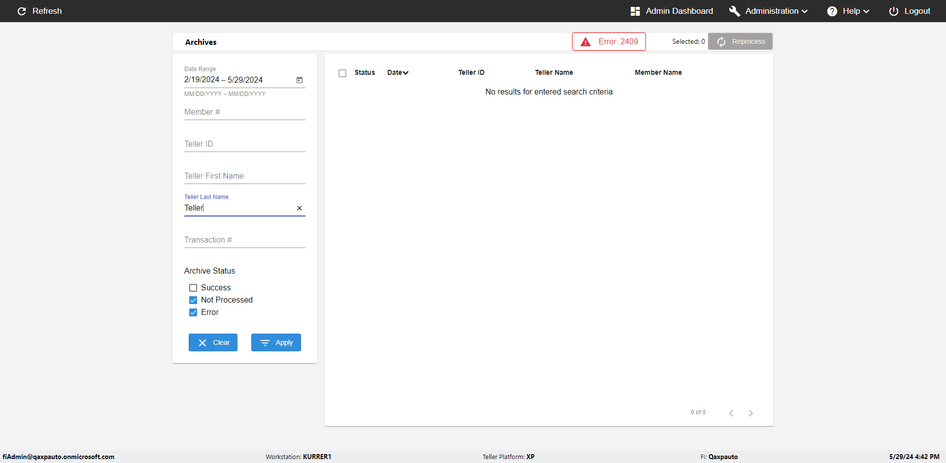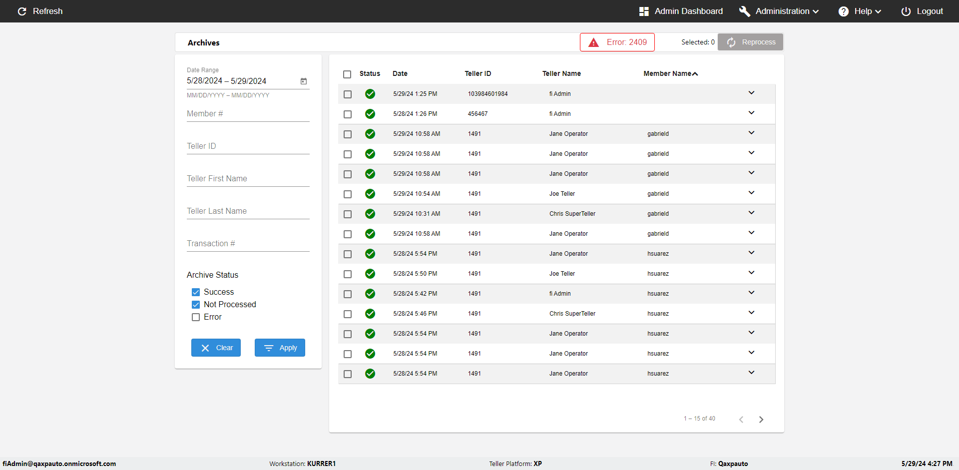 | {UserPwd=iMM2022!, Description=verify Error Messages in Report Page for Date, Teller ID=, errorMessage=Date cannot exceed 7 days after today.;Date cannot exceed 7 days after today., Teller Email=, View=, Date=12/28/2025 - 2/28/2026, Clear=, Workstation=, errorint=2, TestID=verifyErrorMessagesInReports, Transaction=, Header=, Username=ChrisSuperTeller@Qaxpauto.onmicrosoft.com, Export=, Member #=, Search Text=, Level=} |