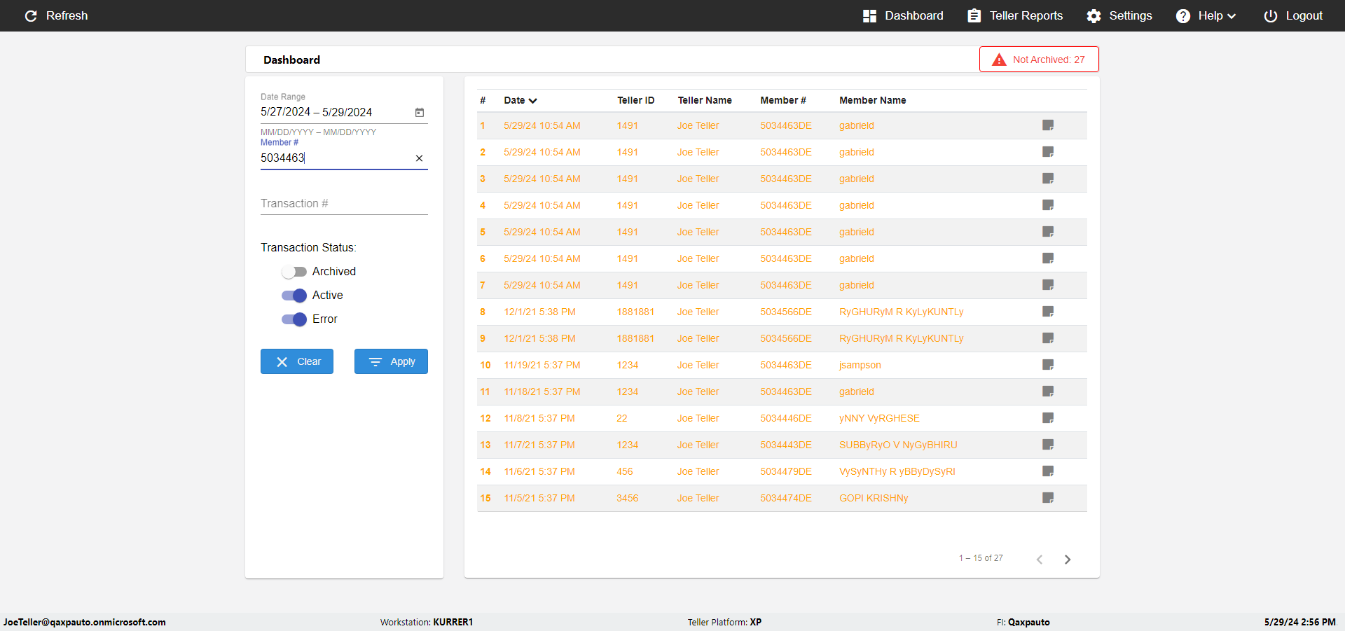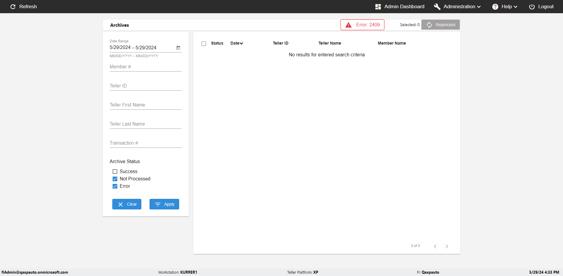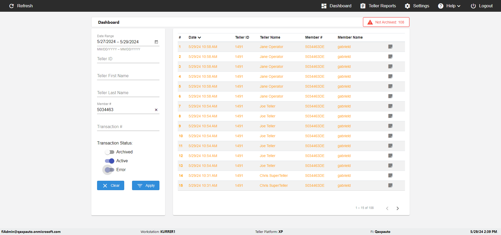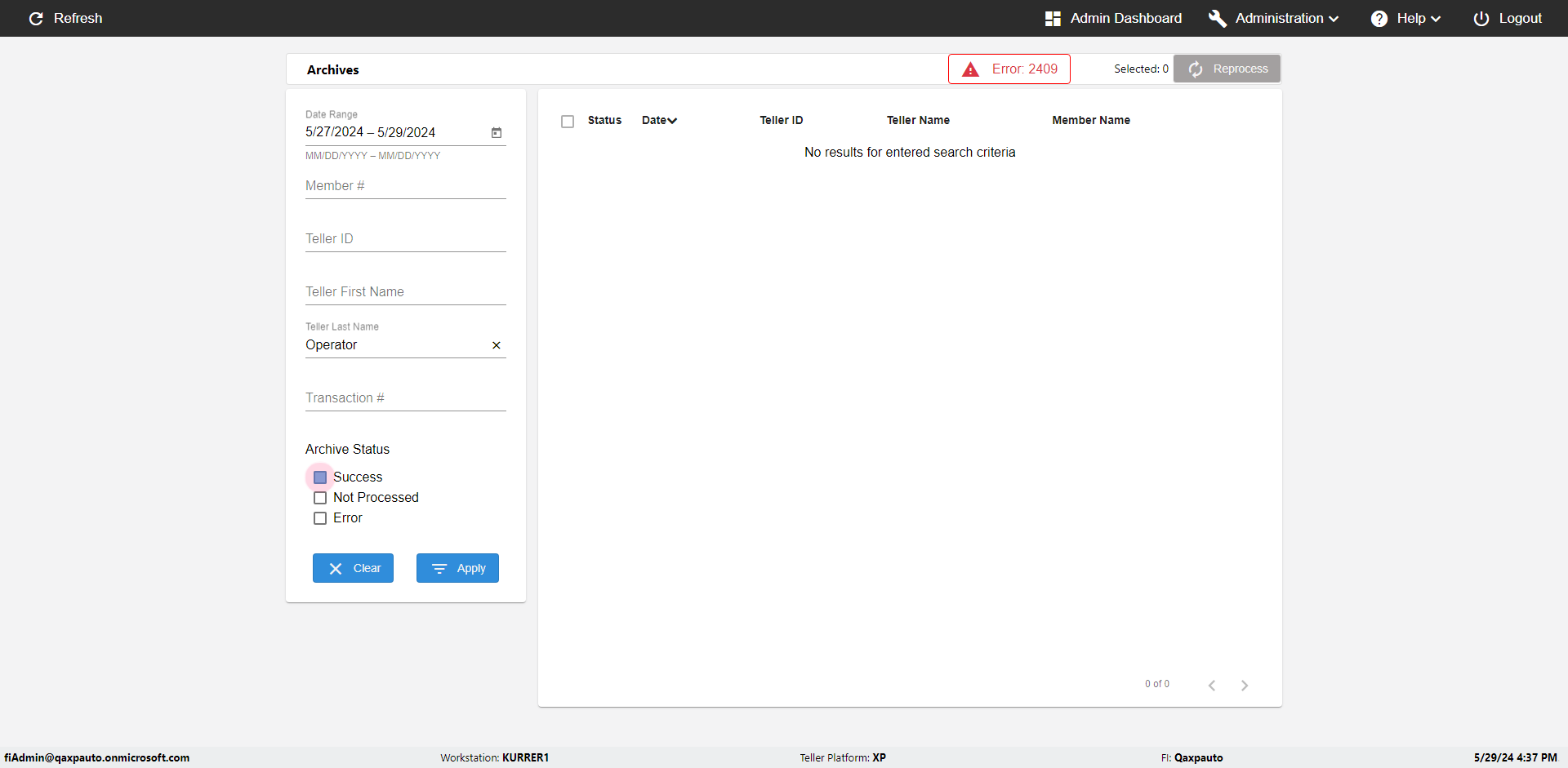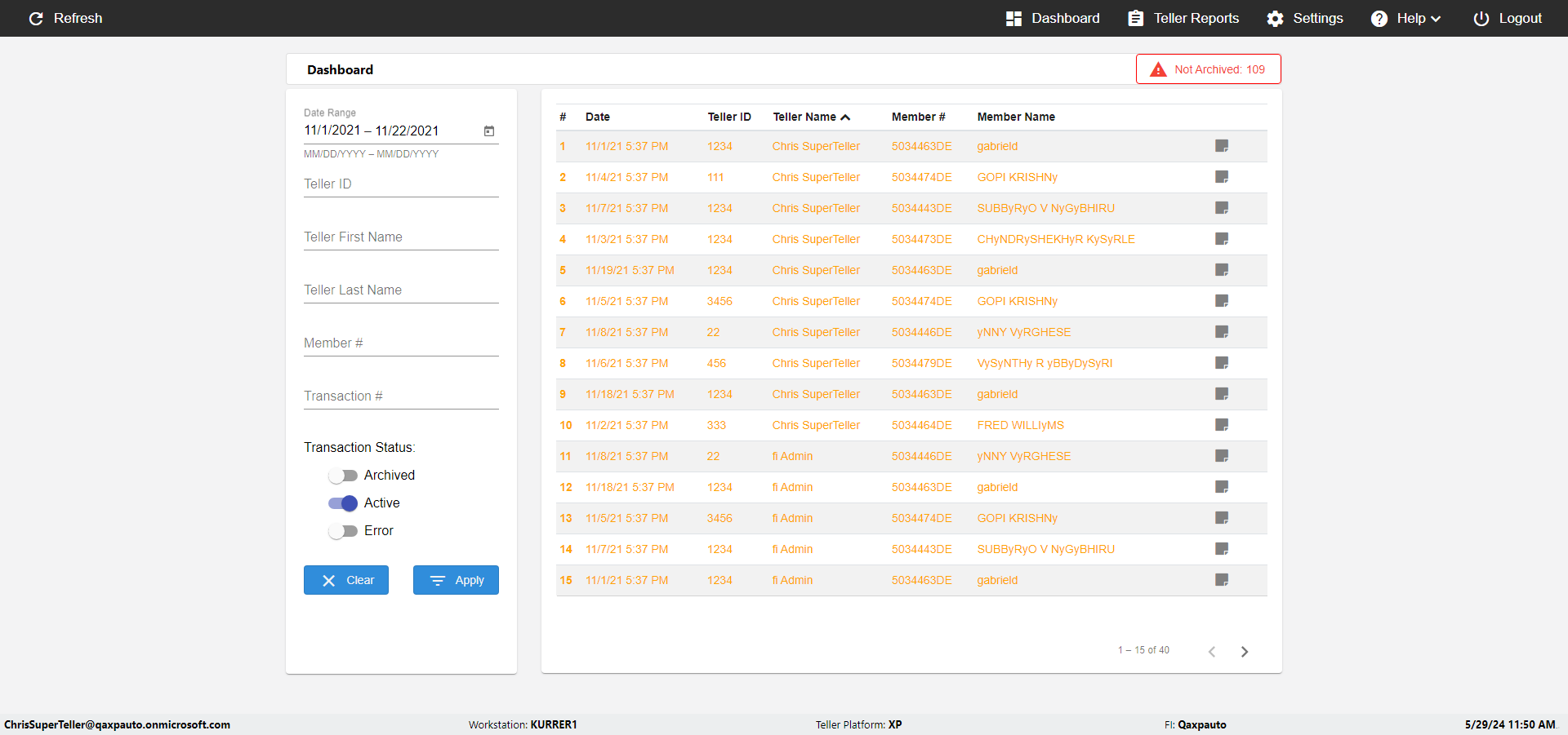 | {UserPwd=iMM2022!, Description=verify Error Messages in Report Page for Date, Teller ID=, errorMessage=Date cannot exceed 7 days after today.;Date cannot exceed 7 days after today., Teller Email=, View=, Date=12/28/2025 - 2/28/2026, Clear=, Workstation=, errorint=2, TestID=verifyErrorMessagesInReports, Transaction=, Header=, Username=ChrisSuperTeller@Qaxpauto.onmicrosoft.com, Export=, Member #=, Search Text=, Level=} |