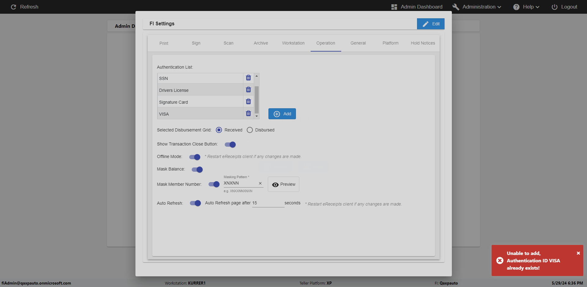 | {Toggel=, Archived Transactions=no, Description=, Email=, Archive=, Document Type=SSN, Notify=, SignatureTab=, DisbursedExpression=, Operation=, Teller LastName=, Disbursed cash=, errorint=1, TestID=verifyErrorMessagesInReceiptPage, Print=, DisbursedExpressionValue=, Phone=, ReceivedCashValue=, Member=, UserPwd=iMM2022!, Transtatus=Archived-false;Active-true;Error-false, Docment ID=sds! 122323, Teller=, Teller FirstName=, errorMessage=Special characters allowed are -,#,:,space;, ReceivedExpressionValue=, Date=, Platfrom=, Received cash=, Transaction=, Header=, Expression=, Username=ChrisSuperTeller@Qaxpauto.onmicrosoft.com, DisbursedCashValue=, FullName=, ReceivedExpression=, SMS=, Memo=} |