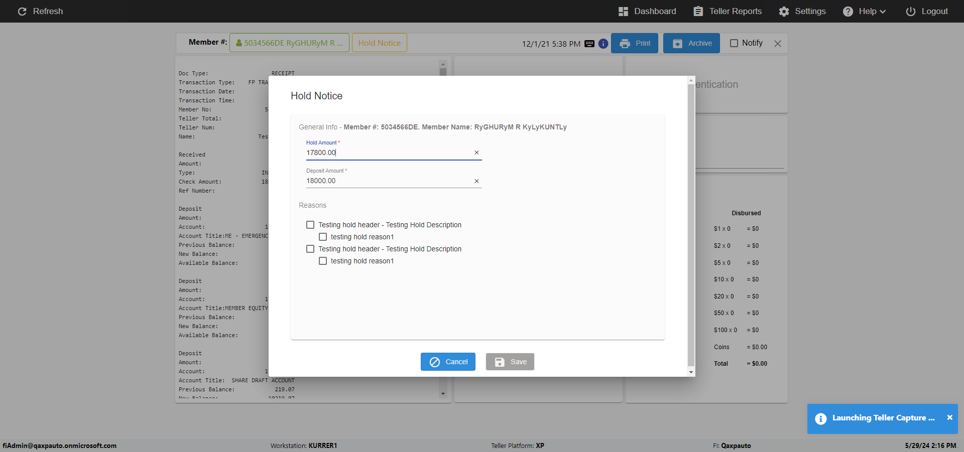 | {Toggel=, Archived Transactions=no, Description=verify Hold Notic Tab In Ereceipt Page, Email=, Archive=, Document Type=, Notify=, SignatureTab=, DisbursedExpression=, Operation=, Teller LastName=, Disbursed cash=, errorint=, TestID=verifyHoldNoticTabInEreceipt, Print=, DisbursedExpressionValue=, Phone=, ReceivedCashValue=, Member=5034566, UserPwd=iMM2022!, Transtatus=Archived-false;Active-true;Error-false, Docment ID=, Teller=1881881, Teller FirstName=, errorMessage=, ReceivedExpressionValue=, Date=, Platfrom=Enable Hold Notice-true;, Received cash=, Transaction=, Header=, Expression=, Username=fiAdmin@Qaxpauto.onmicrosoft.com, DisbursedCashValue=, FullName=, ReceivedExpression=, SMS=, Memo=} |