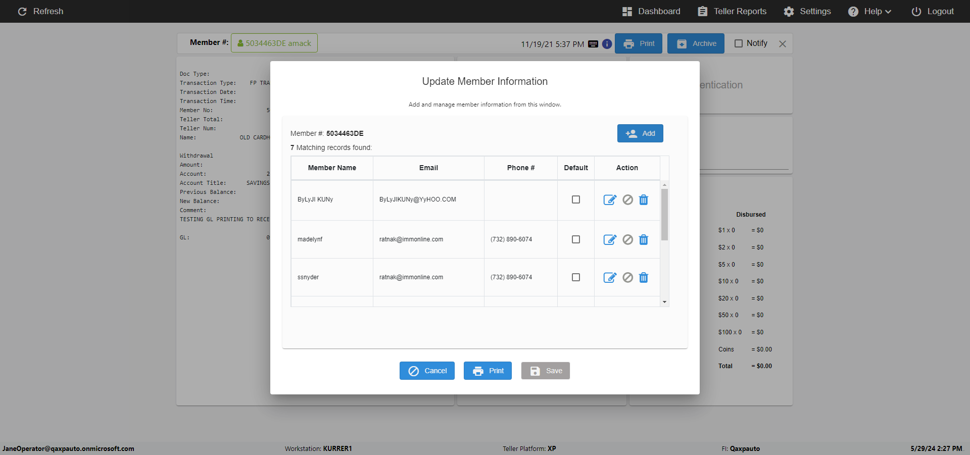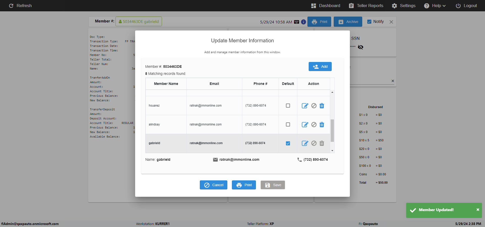 | {Toggel=TRUE, Archived Transactions=no, Description=verify MemberID And Archive Information Update (duplicate), Email=Hohn@email.com, Archive=, Document Type=, Notify=, SignatureTab=, DisbursedExpression=, Operation=, Teller LastName=, Disbursed cash=, errorint=, TestID=verifyMemberAddUpdateContactInfo, Print=, DisbursedExpressionValue=, Phone=(555) 021-3315, ReceivedCashValue=, Member=5034463, UserPwd=iMM2022!, Transtatus=Archived-false;Active-true;Error-false, Docment ID=, Teller=, Teller FirstName=, errorMessage=, ReceivedExpressionValue=, Date=11/01/2021 - 11/20/2021, Platfrom=, Received cash=, Transaction=, Header=, Expression=, Username=JaneOperator@Qaxpauto.onmicrosoft.com, DisbursedCashValue=, FullName=John, ReceivedExpression=, SMS=, Memo=} |