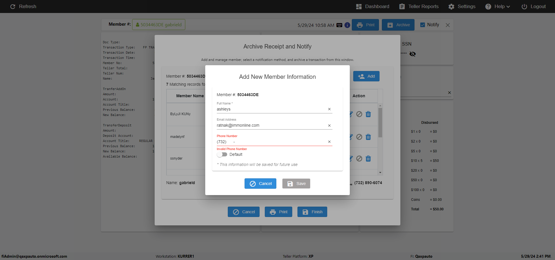 | {Description=Verify Member Name error in Offline Transaction demo, From Account #=1212, Teller ID=3456, To Account #=1414, Amount=555, errorMessage=Letters, digits & only space,.,',-,_,&,/ are allowed., Transaction Type=Deposit, userpwd=iMM2022!, # of Checks=5, Member#=345, Member Name=Rahim!@, Cash Received=2233, From Account Type=checking, Date=, To Account Type=savings, errorint=1, TestID=verifyOfflineErrorMessagesMemberNameDetails, offlineurl=/offlinereceipt/demo, Cash Disbursed=3000, Account Type=Saving, Checks Total=221, username=fiAdmin@Qaxpauto.onmicrosoft.com} |