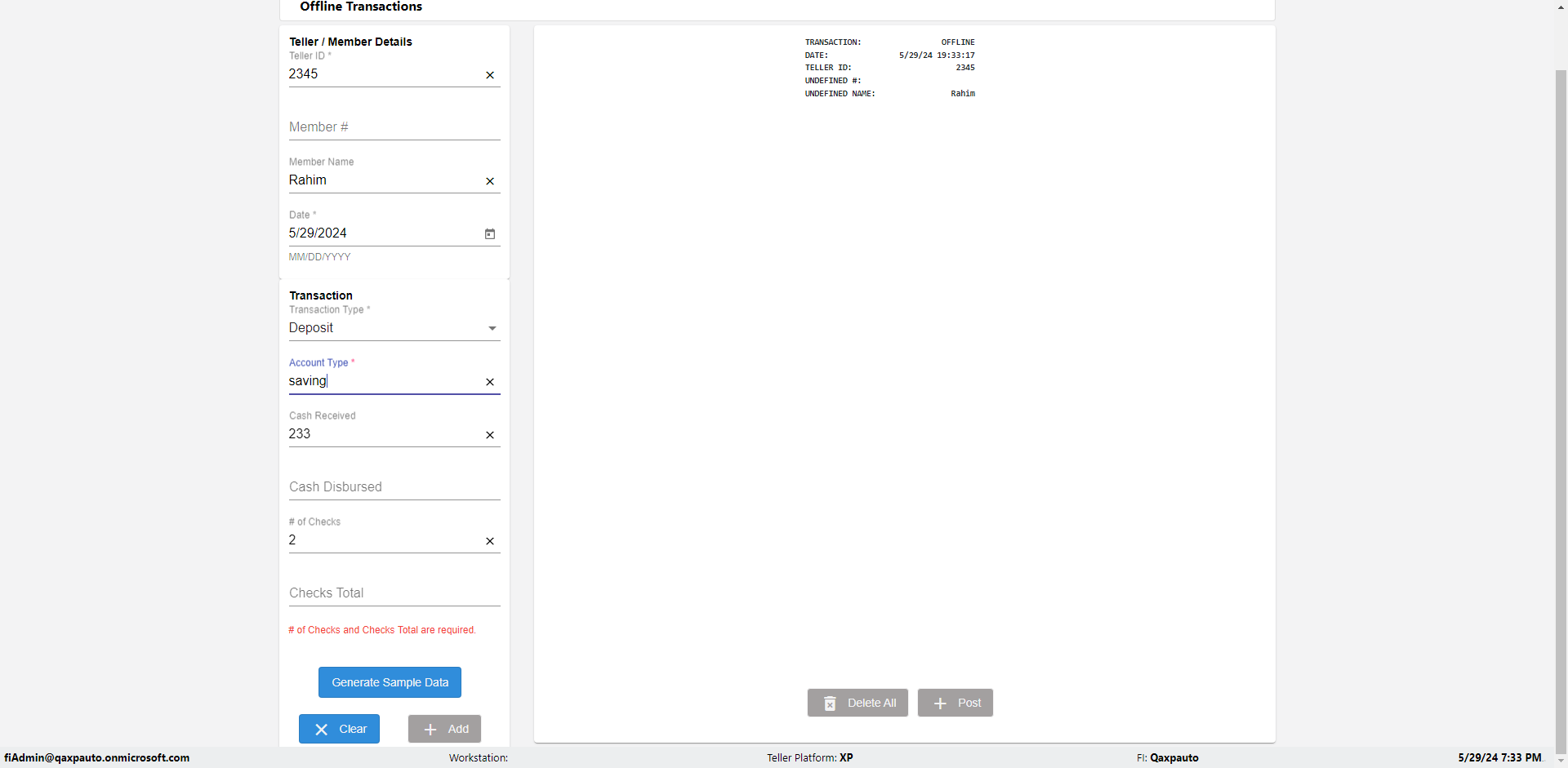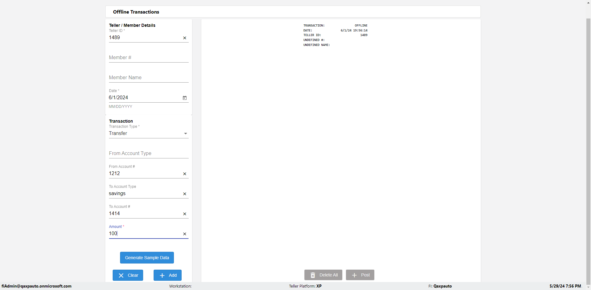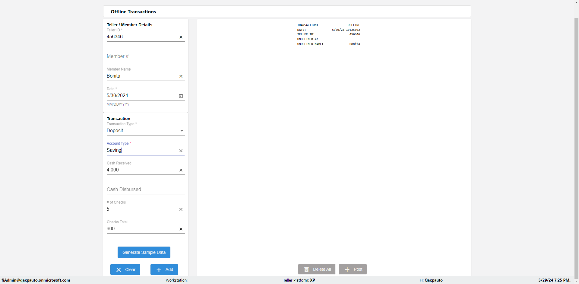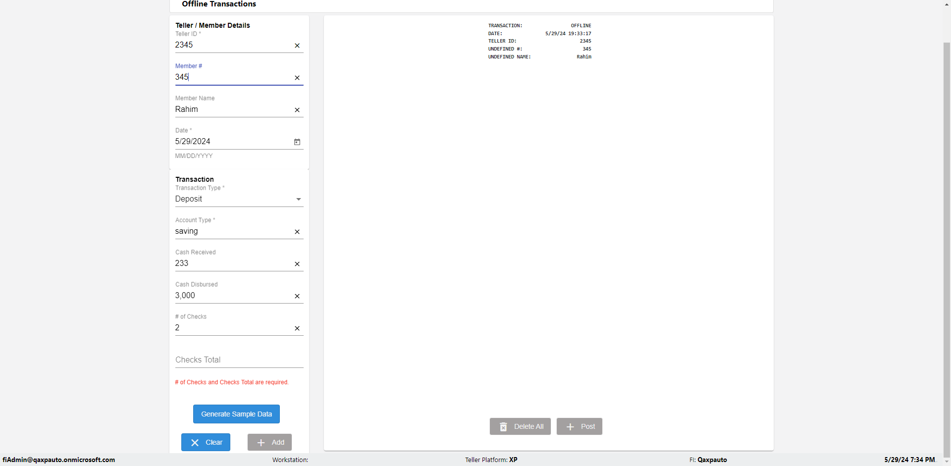 | {Description=Verify generate sample data in Offline Transaction demo, From Account #=1212, Teller ID=1488, To Account #=1414, Amount=565, errorMessage=, Transaction Type=Deposit, userpwd=iMM2022!, # of Checks=5, Member#=8888, Member Name=Alla, Cash Received=5000, From Account Type=checking, Date=3, To Account Type=savings, errorint=, TestID=verifyOfflineTranGenerateSample, offlineurl=/offlinereceipt/demo, Cash Disbursed=3000, Account Type=Checking, Checks Total=999, username=fiAdmin@Qaxpauto.onmicrosoft.com} |