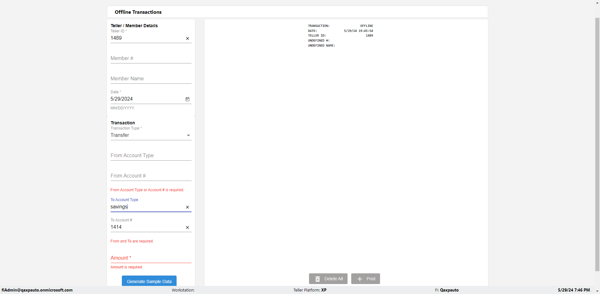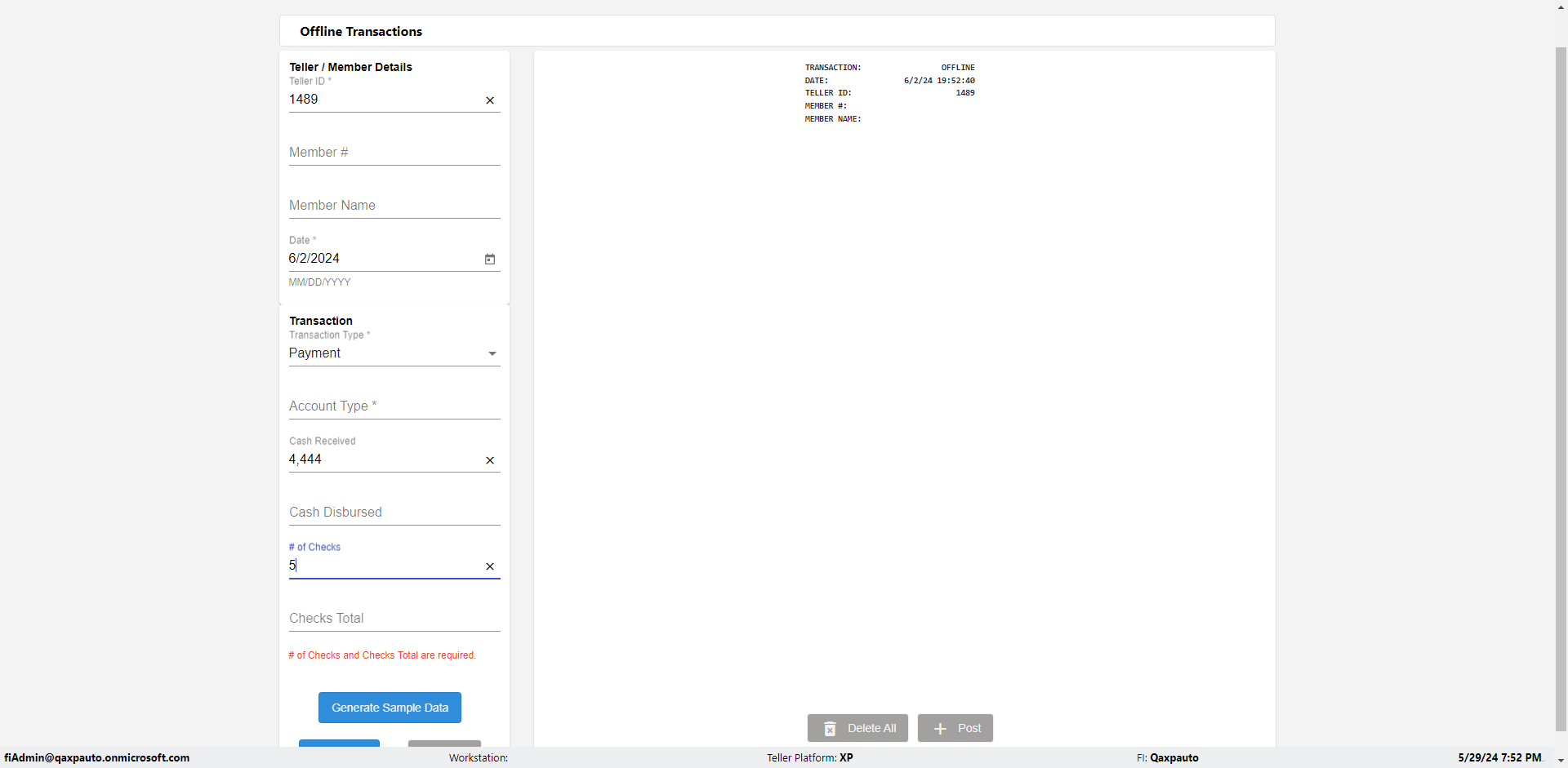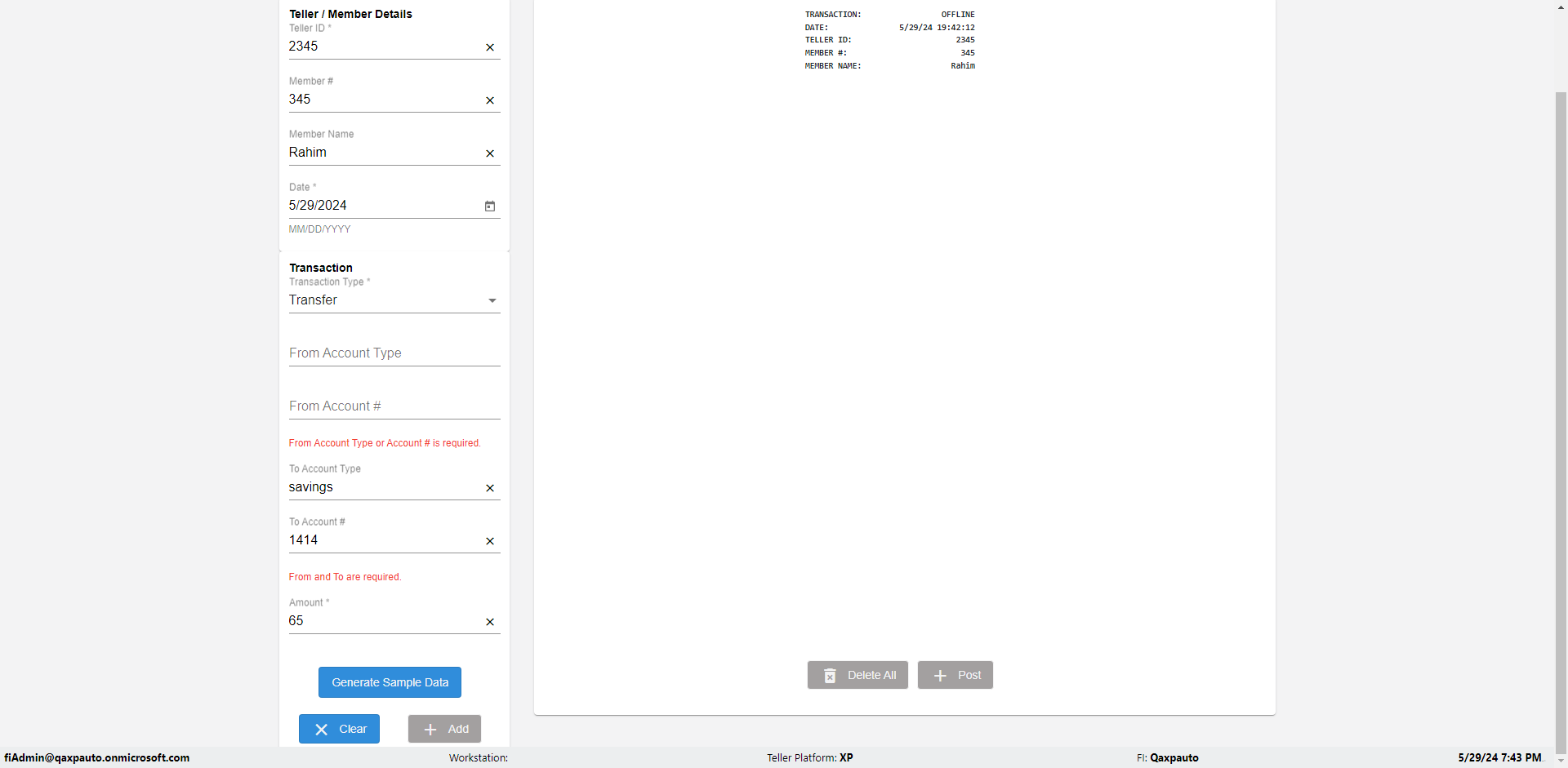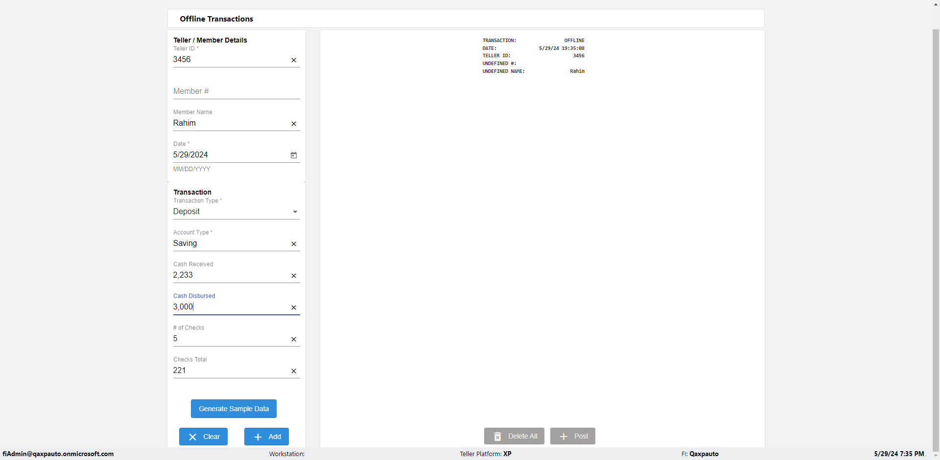 | {Description=Verify generate sample data in Offline Transaction demo, From Account #=1212, Teller ID=1488, To Account #=1414, Amount=565, errorMessage=, Transaction Type=Deposit, userpwd=iMM2022!, # of Checks=5, Member#=8888, Member Name=Alla, Cash Received=5000, From Account Type=checking, Date=3, To Account Type=savings, errorint=, TestID=verifyOfflineTranGenerateSample, offlineurl=/offlinereceipt/demo, Cash Disbursed=3000, Account Type=Checking, Checks Total=999, username=fiAdmin@Qaxpauto.onmicrosoft.com} |