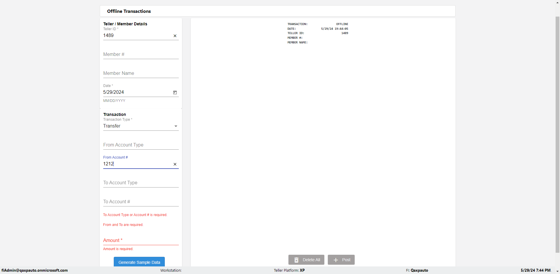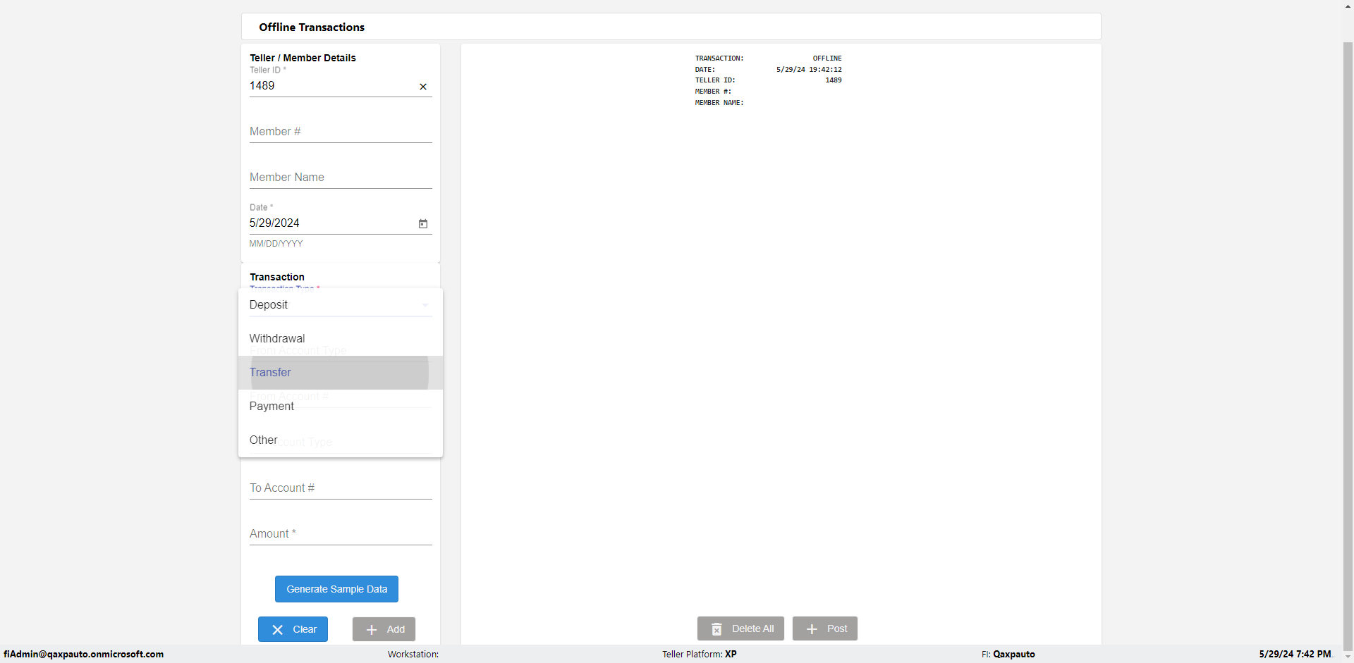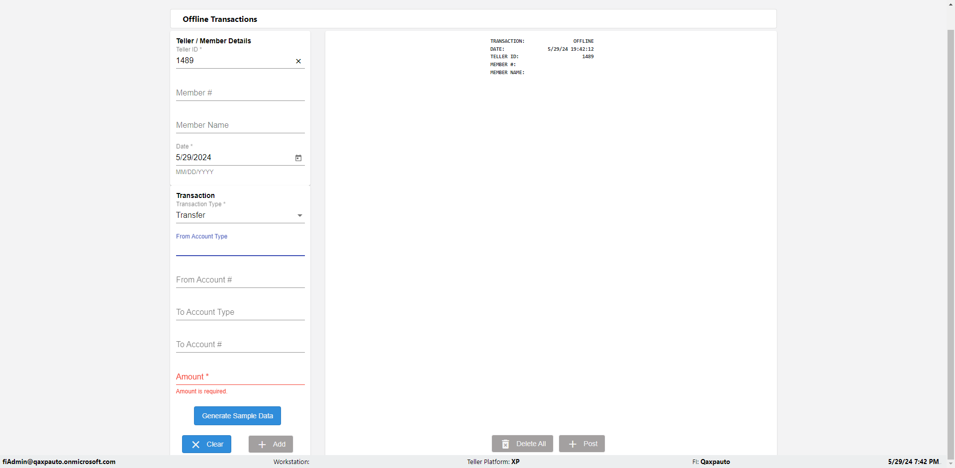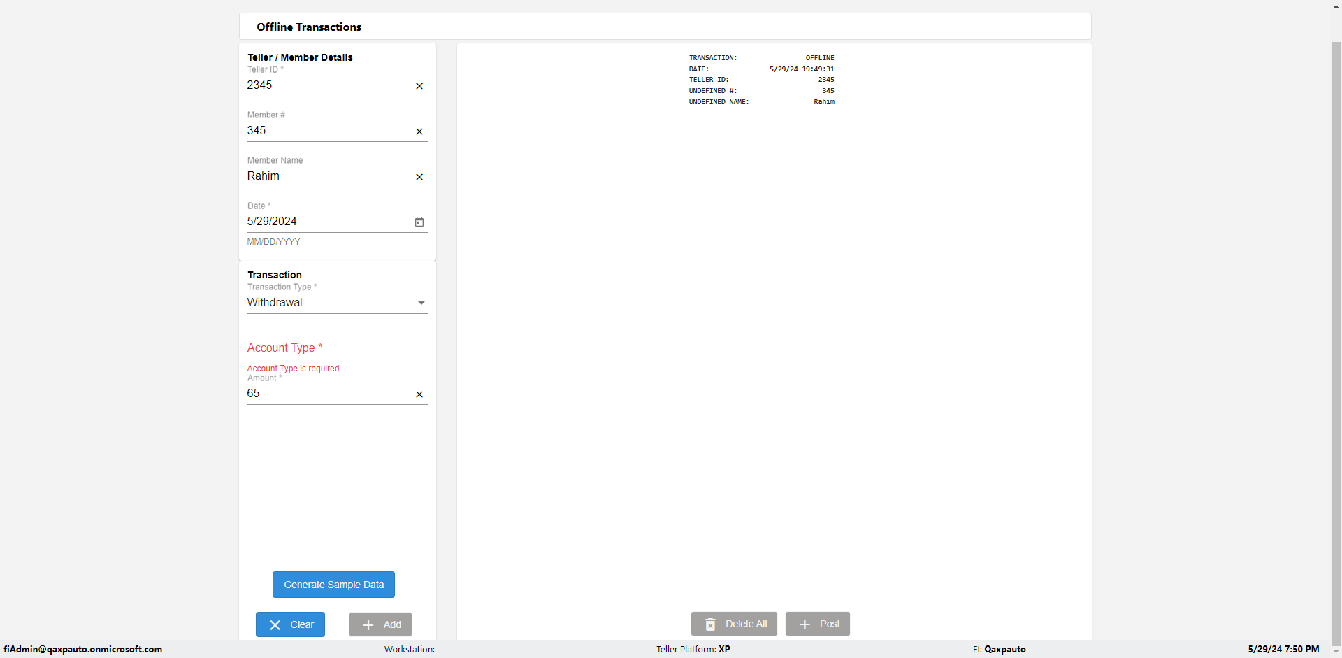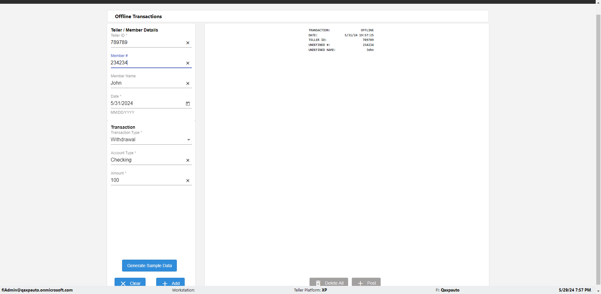 | {Description=Verify generate sample data in Offline Transaction demo, From Account #=1212, Teller ID=1488, To Account #=1414, Amount=565, errorMessage=, Transaction Type=Deposit, userpwd=iMM2022!, # of Checks=5, Member#=8888, Member Name=Alla, Cash Received=5000, From Account Type=checking, Date=3, To Account Type=savings, errorint=, TestID=verifyOfflineTranGenerateSample, offlineurl=/offlinereceipt/demo, Cash Disbursed=3000, Account Type=Checking, Checks Total=999, username=fiAdmin@Qaxpauto.onmicrosoft.com} |