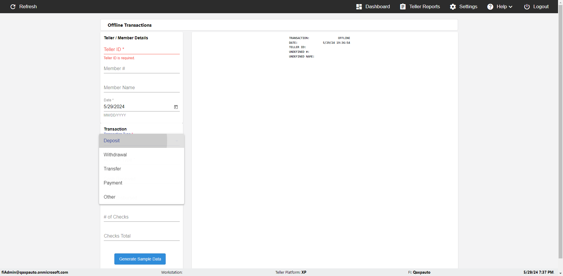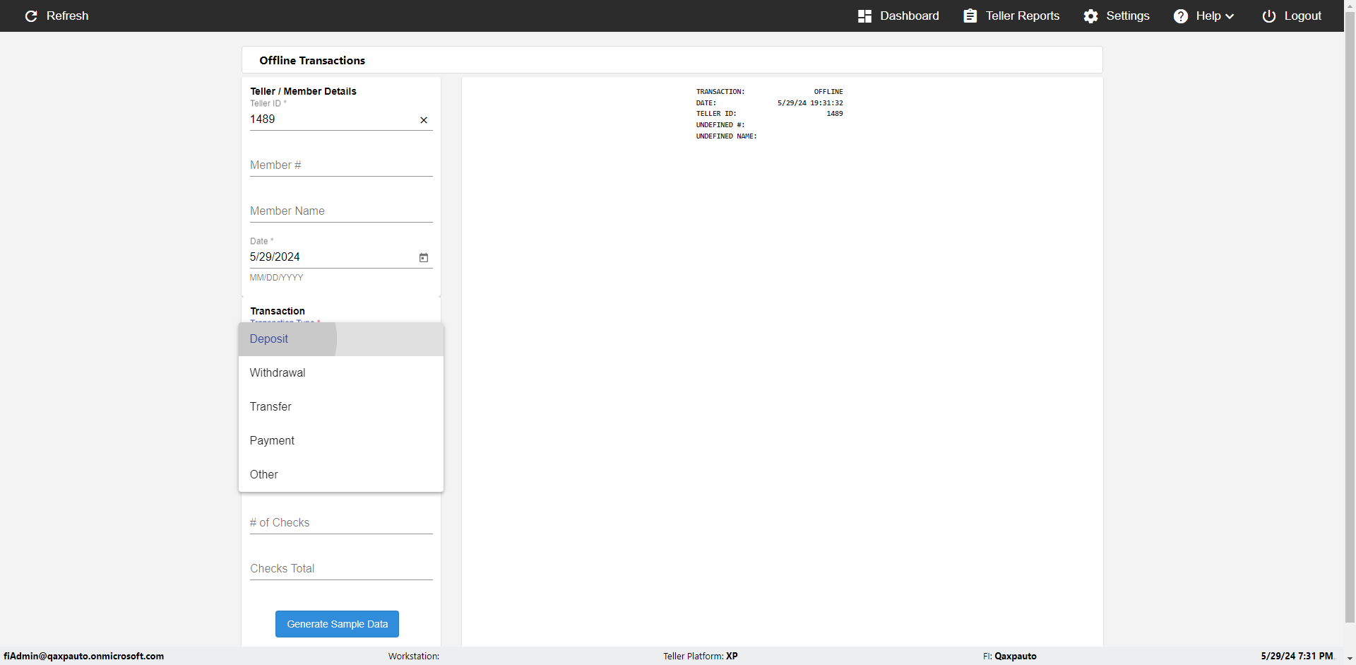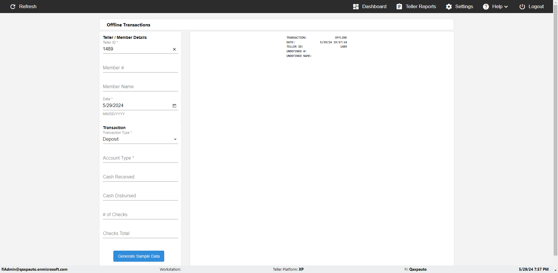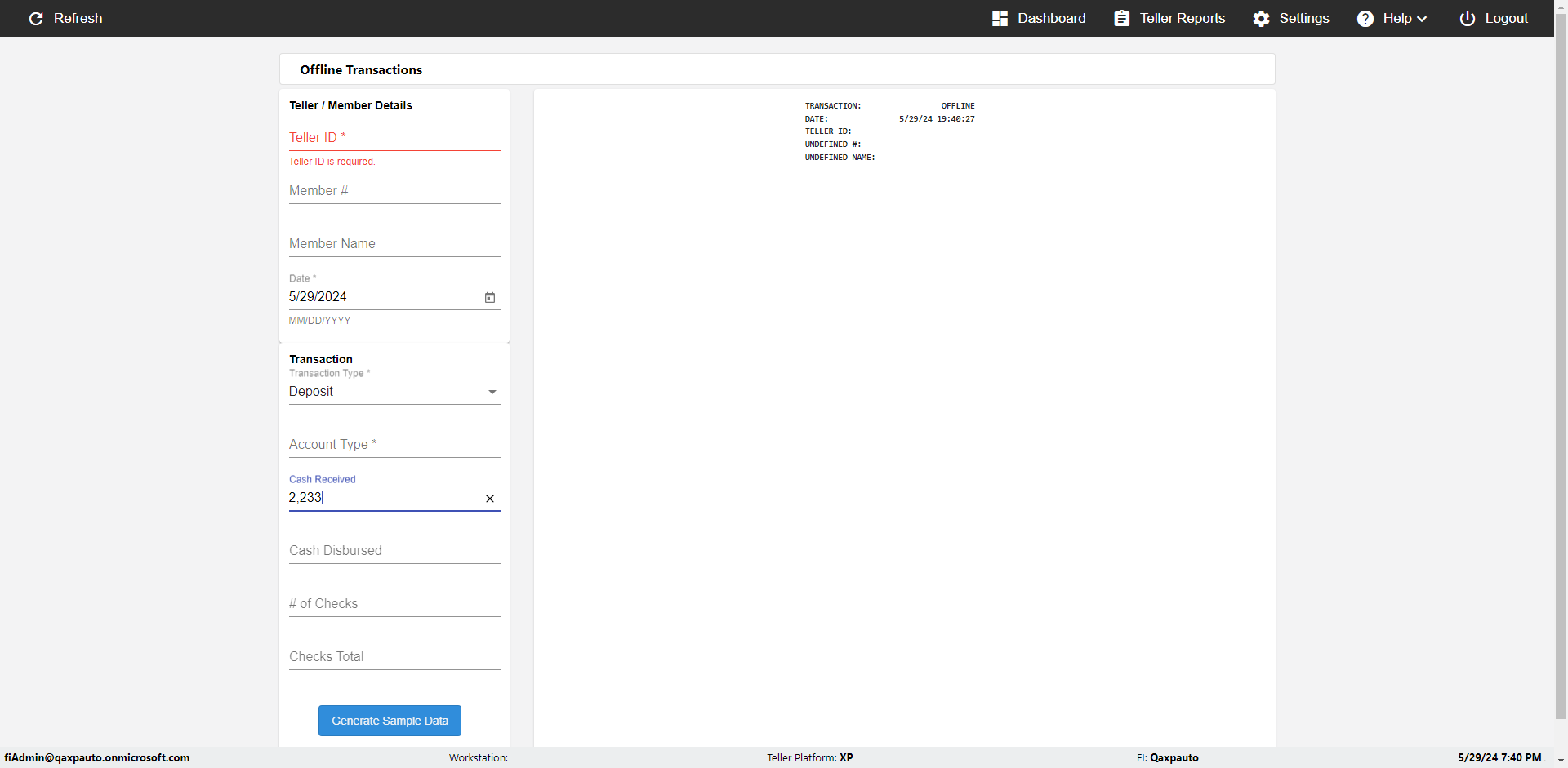 | {Description=Verify generate sample data in Offline Transaction demo, From Account #=1212, Teller ID=1488, To Account #=1414, Amount=565, errorMessage=, Transaction Type=Deposit, userpwd=iMM2022!, # of Checks=5, Member#=8888, Member Name=Alla, Cash Received=5000, From Account Type=checking, Date=3, To Account Type=savings, errorint=, TestID=verifyOfflineTranGenerateSample, offlineurl=/offlinereceipt/demo, Cash Disbursed=3000, Account Type=Checking, Checks Total=999, username=fiAdmin@Qaxpauto.onmicrosoft.com} |