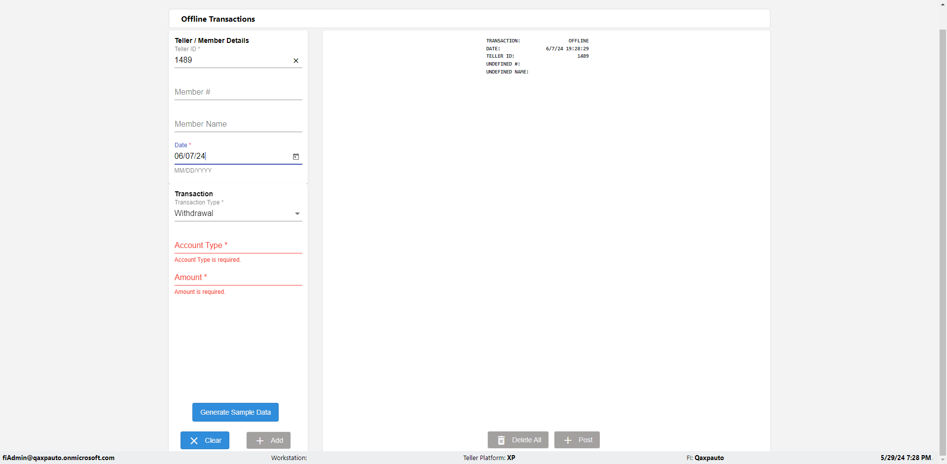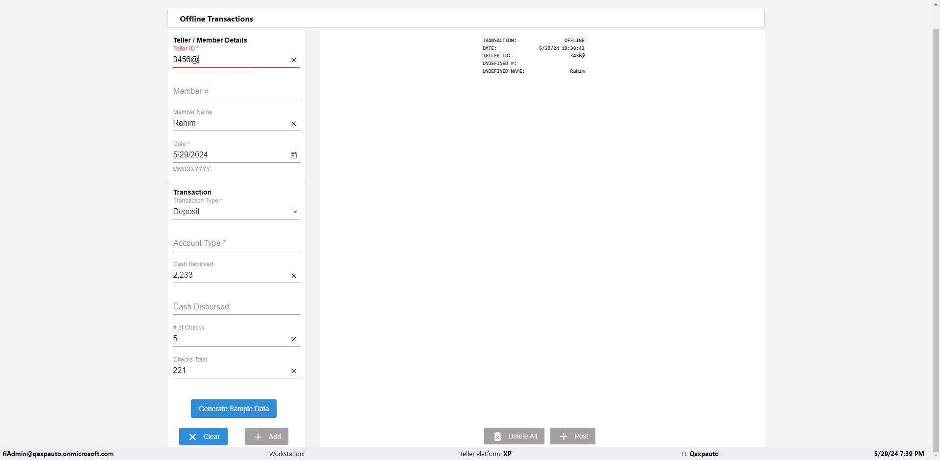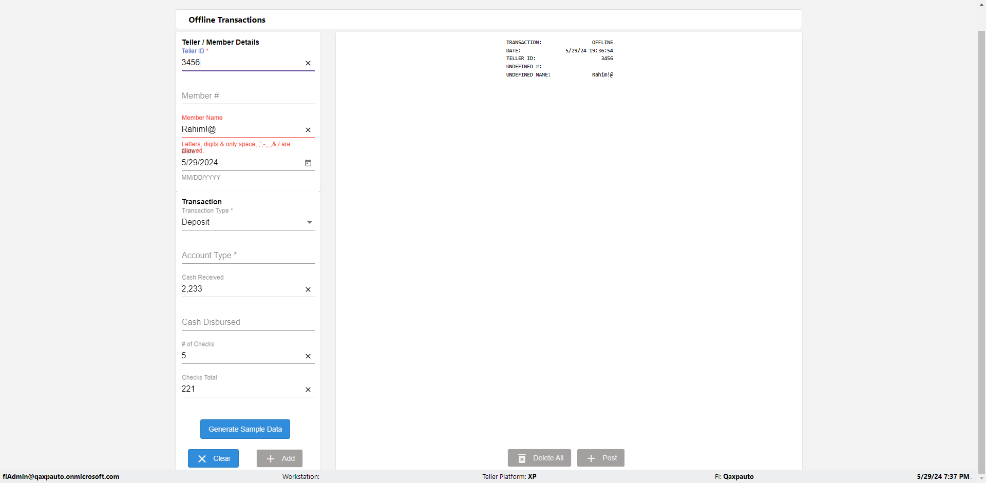 | {Description=Verify Teller ID error in Offline Transaction demo, From Account #=1212, Teller ID=3456@, To Account #=1414, Amount=555, errorMessage=Special characters not allowed.;, Transaction Type=Deposit, userpwd=iMM2022!, # of Checks=5, Member#=789, Member Name=Rahim, Cash Received=2233, From Account Type=checking, Date=, To Account Type=savings, errorint=1, TestID=verifyOfflineErrorMessagesTellerIDDetails, offlineurl=/offlinereceipt/demo, Cash Disbursed=3000, Account Type=Saving, Checks Total=221, username=fiAdmin@Qaxpauto.onmicrosoft.com} |