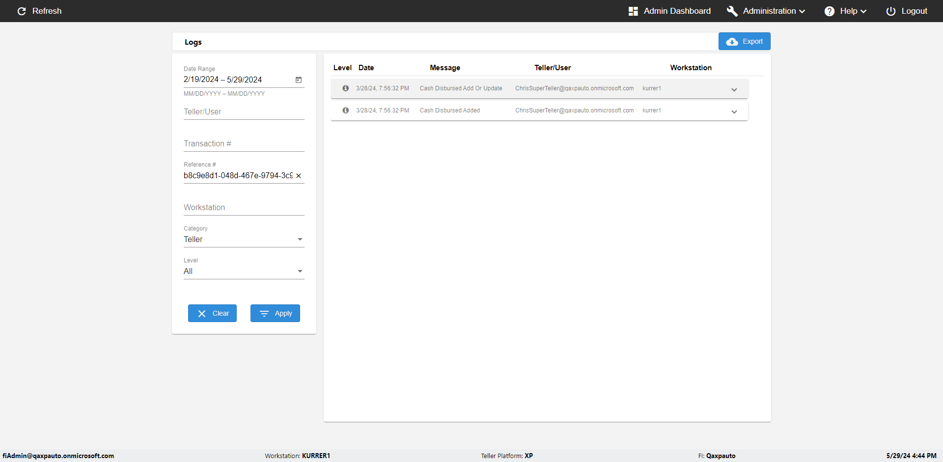 | {UserPwd=iMM2022!, Description=verify Search Elements In Report Page with Date and Email, Teller ID=, errorMessage=, Teller Email=ChrisSuperTeller@Qaxpauto.onmicrosoft.com, View=, Date=2, Clear=, Workstation=, errorint=, TestID=verifySearchInReports, Transaction=, Header=, Username=ChrisSuperTeller@Qaxpauto.onmicrosoft.com, Export=, Member #=, Search Text=, Level=} |