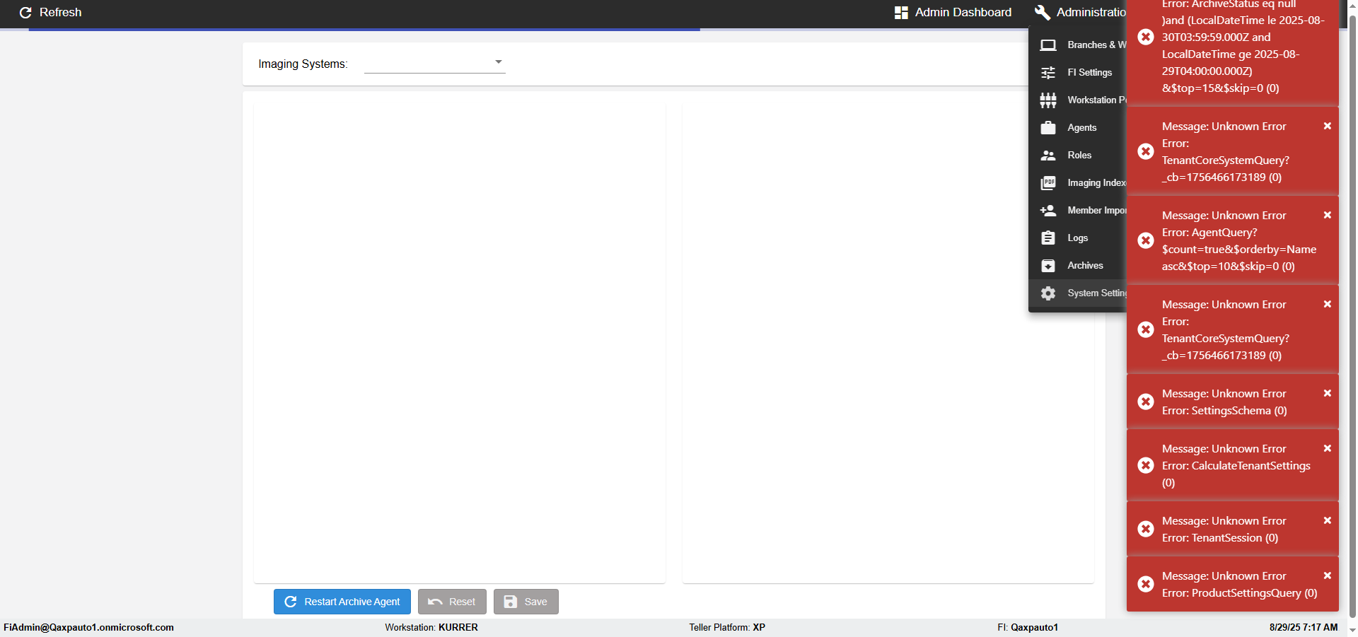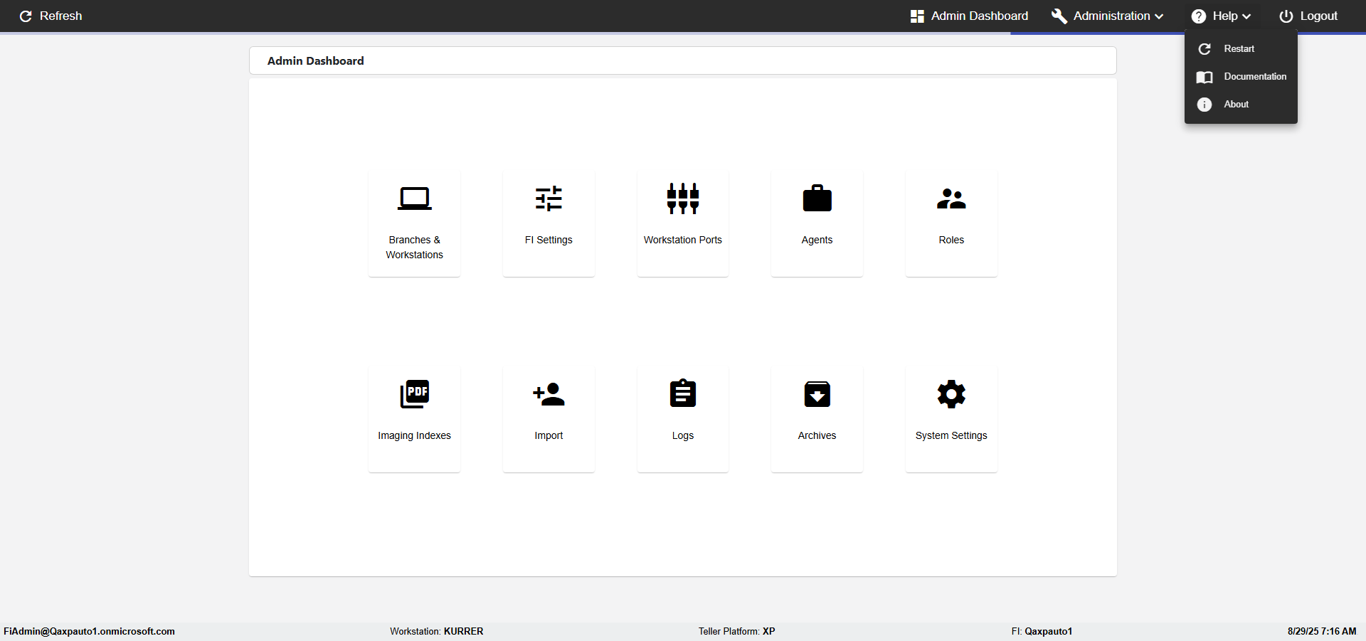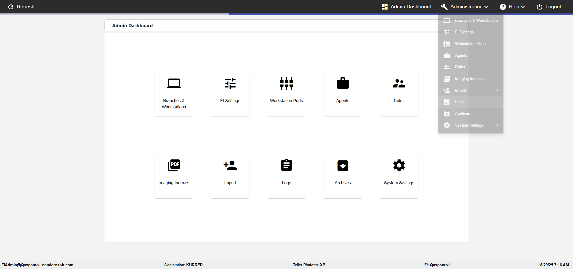 Control Panel, FI Management, Agents, Roles, Imaging Indexes, Member Import, Logging, Archives, About, Logout