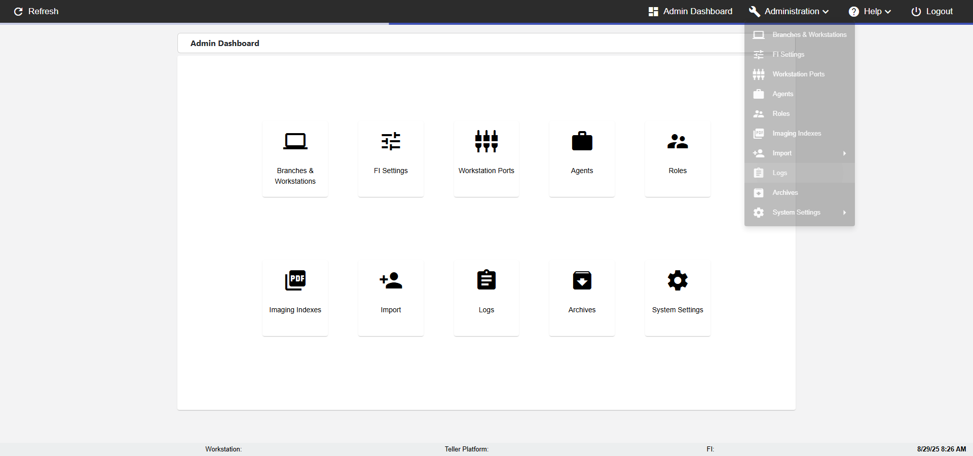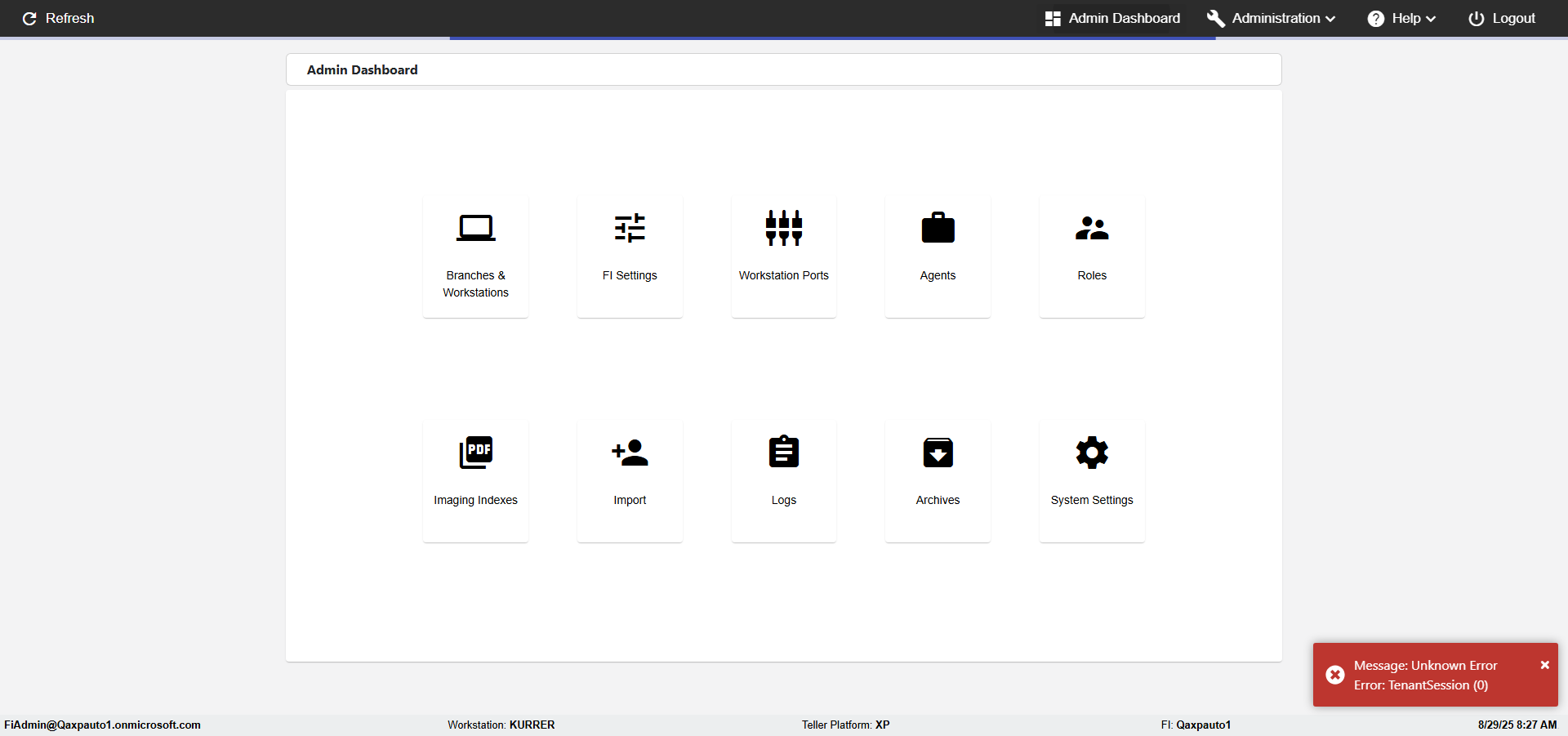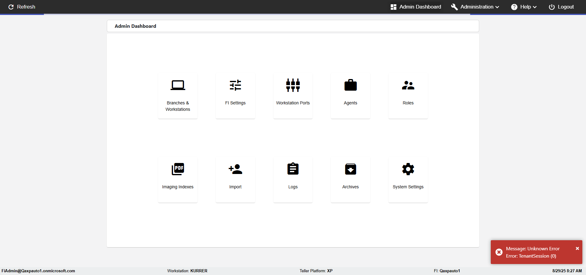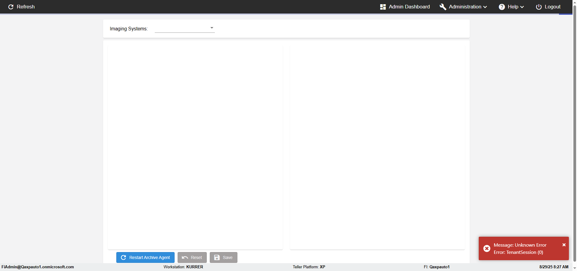 Control Panel, FI Management, Agents, Roles, Imaging Indexes, Member Import, Logging, Archives, About, Logout Actual(Passed): Successfully verified the Verfiy Administration menu has the following options- Control Panel, FI Management, Agents, Roles, Imaging Indexes, Member Import, Logging, Archives, About, Logout [ScreenShot] --- 29 Aug 08:26:09 411 - Element is displayed:: [[RemoteWebDriver: chrome on Windows 10 (2d75e071599815b149fe28d2f2104216)] -> id: immAdministration] --- 29 Aug 08:26:11 602 - Element is displayed:: [[RemoteWebDriver: chrome on Windows 10 (2d75e071599815b149fe28d2f2104216)] -> id: immAdministration] --- 29 Aug 08:26:13 871 - Element is displayed:: [[RemoteWebDriver: chrome on Windows 10 (2d75e071599815b149fe28d2f2104216)] -> id: immMenuLogging] Successfully navigated to the 'Logging' page [ScreenShot] --- 29 Aug 08:26:15 041 - Element is displayed:: [[RemoteWebDriver: chrome on Windows 10 (2d75e071599815b149fe28d2f2104216)] -> id: immRefresh] Successfully navigated to the 'Logging' page after refresh [ScreenShot] --- 29 Aug 08:26:15 434 - Element is displayed:: [[RemoteWebDriver: chrome on Windows 10 (2d75e071599815b149fe28d2f2104216)] -> id: immAdministration] --- 29 Aug 08:26:17 666 - Element is displayed:: [[RemoteWebDriver: chrome on Windows 10 (2d75e071599815b149fe28d2f2104216)] -> id: immAdministration] --- 29 Aug 08:26:18 577 - Element is displayed:: [[RemoteWebDriver: chrome on Windows 10 (2d75e071599815b149fe28d2f2104216)] -> id: immMenuAgents] Successfully navigated to the 'Agent' page [ScreenShot] --- 29 Aug 08:26:21 401 - Element is displayed:: [[RemoteWebDriver: chrome on Windows 10 (2d75e071599815b149fe28d2f2104216)] -> id: immRefresh] Successfully navigated to the 'Agent' page after refresh [ScreenShot] --- 29 Aug 08:26:21 762 - Element is displayed:: [[RemoteWebDriver: chrome on Windows 10 (2d75e071599815b149fe28d2f2104216)] -> id: immAdministration] --- 29 Aug 08:26:23 945 - Element is displayed:: [[RemoteWebDriver: chrome on Windows 10 (2d75e071599815b149fe28d2f2104216)] -> id: immAdministration] --- 29 Aug 08:26:26 278 - Element is displayed:: [[RemoteWebDriver: chrome on Windows 10 (2d75e071599815b149fe28d2f2104216)] -> id: immMenuArchive] Successfully navigated to the 'Archives' page [ScreenShot] --- 29 Aug 08:26:29 131 - Element is displayed:: [[RemoteWebDriver: chrome on Windows 10 (2d75e071599815b149fe28d2f2104216)] -> id: immRefresh] Successfully navigated to the 'Archives' page after refresh [ScreenShot] --- 29 Aug 08:26:29 527 - Element is displayed:: [[RemoteWebDriver: chrome on Windows 10 (2d75e071599815b149fe28d2f2104216)] -> id: immAdministration] --- 29 Aug 08:26:31 735 - Element is displayed:: [[RemoteWebDriver: chrome on Windows 10 (2d75e071599815b149fe28d2f2104216)] -> id: immAdministration] --- 29 Aug 08:26:32 203 - Element is displayed:: [[RemoteWebDriver: chrome on Windows 10 (2d75e071599815b149fe28d2f2104216)] -> id: immMenuRoles] Successfully navigated to the 'Roles' page [ScreenShot] --- 29 Aug 08:26:34 981 - Element is displayed:: [[RemoteWebDriver: chrome on Windows 10 (2d75e071599815b149fe28d2f2104216)] -> id: immRefresh] Successfully navigated to the 'Roles' page after refresh [ScreenShot] --- 29 Aug 08:26:35 396 - Element is displayed:: [[RemoteWebDriver: chrome on Windows 10 (2d75e071599815b149fe28d2f2104216)] -> id: immAdministration] --- 29 Aug 08:26:37 600 - Element is displayed:: [[RemoteWebDriver: chrome on Windows 10 (2d75e071599815b149fe28d2f2104216)] -> id: immAdministration] --- 29 Aug 08:26:40 380 - Element is displayed:: [[RemoteWebDriver: chrome on Windows 10 (2d75e071599815b149fe28d2f2104216)] -> id: immMenuMemberImportOnDemand] Successfully navigated to the 'Member Import On Demand' page [ScreenShot] --- 29 Aug 08:26:43 328 - Element is displayed:: [[RemoteWebDriver: chrome on Windows 10 (2d75e071599815b149fe28d2f2104216)] -> id: immRefresh] Successfully navigated to the 'Member Import On Demand' page after refresh [ScreenShot] --- 29 Aug 08:26:43 758 - Element is displayed:: [[RemoteWebDriver: chrome on Windows 10 (2d75e071599815b149fe28d2f2104216)] -> id: immAdministration] --- 29 Aug 08:26:46 041 - Element is displayed:: [[RemoteWebDriver: chrome on Windows 10 (2d75e071599815b149fe28d2f2104216)] -> id: immAdministration] --- 29 Aug 08:26:48 631 - Element is displayed:: [[RemoteWebDriver: chrome on Windows 10 (2d75e071599815b149fe28d2f2104216)] -> id: immMenuMemberImportSchedule] Successfully navigated to the 'Member Import Schedule' page [ScreenShot] --- 29 Aug 08:26:51 353 - Element is displayed:: [[RemoteWebDriver: chrome on Windows 10 (2d75e071599815b149fe28d2f2104216)] -> id: immRefresh] Successfully navigated to the 'Member Import Schedule' page after refresh [ScreenShot] --- 29 Aug 08:26:51 725 - Element is displayed:: [[RemoteWebDriver: chrome on Windows 10 (2d75e071599815b149fe28d2f2104216)] -> id: immAdministration] --- 29 Aug 08:26:53 907 - Element is displayed:: [[RemoteWebDriver: chrome on Windows 10 (2d75e071599815b149fe28d2f2104216)] -> id: immAdministration] --- 29 Aug 08:26:54 239 - Element is displayed:: [[RemoteWebDriver: chrome on Windows 10 (2d75e071599815b149fe28d2f2104216)] -> id: immMenuImagingIndexes] Successfully navigated to the 'Imaging Indexes' page [ScreenShot] --- 29 Aug 08:26:57 100 - Element is displayed:: [[RemoteWebDriver: chrome on Windows 10 (2d75e071599815b149fe28d2f2104216)] -> id: immRefresh] Successfully navigated to the 'Imaging Indexes' page after refresh [ScreenShot] --- 29 Aug 08:26:57 449 - Element is displayed:: [[RemoteWebDriver: chrome on Windows 10 (2d75e071599815b149fe28d2f2104216)] -> id: immAdministration] --- 29 Aug 08:26:59 621 - Element is displayed:: [[RemoteWebDriver: chrome on Windows 10 (2d75e071599815b149fe28d2f2104216)] -> id: immAdministration] --- 29 Aug 08:27:04 196 - Element is displayed:: [[RemoteWebDriver: chrome on Windows 10 (2d75e071599815b149fe28d2f2104216)] -> id: immMenuSystemSettingsSMTP] Successfully navigated to the 'System Se