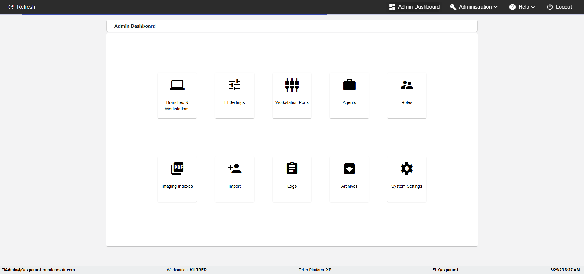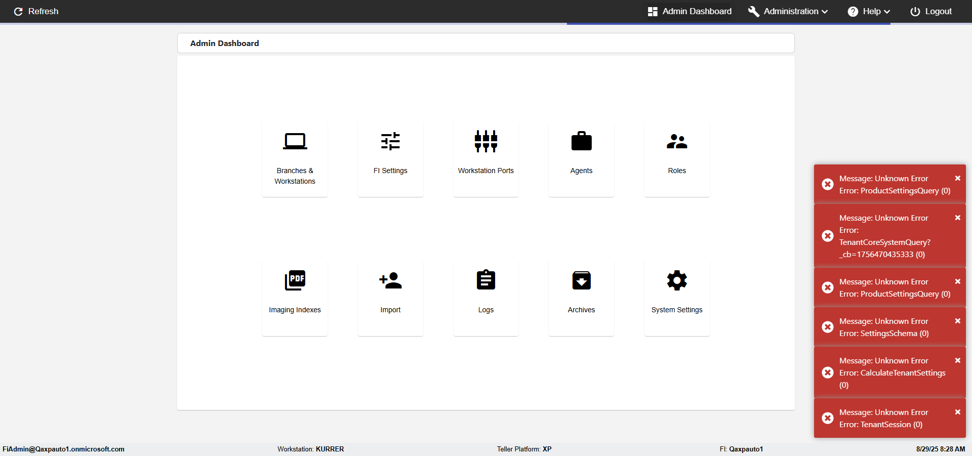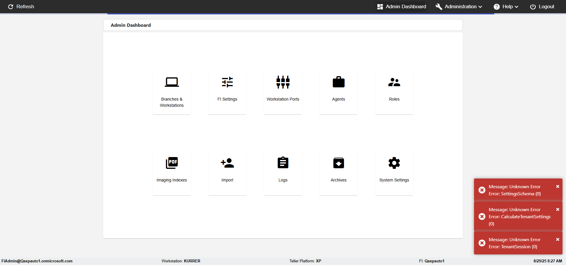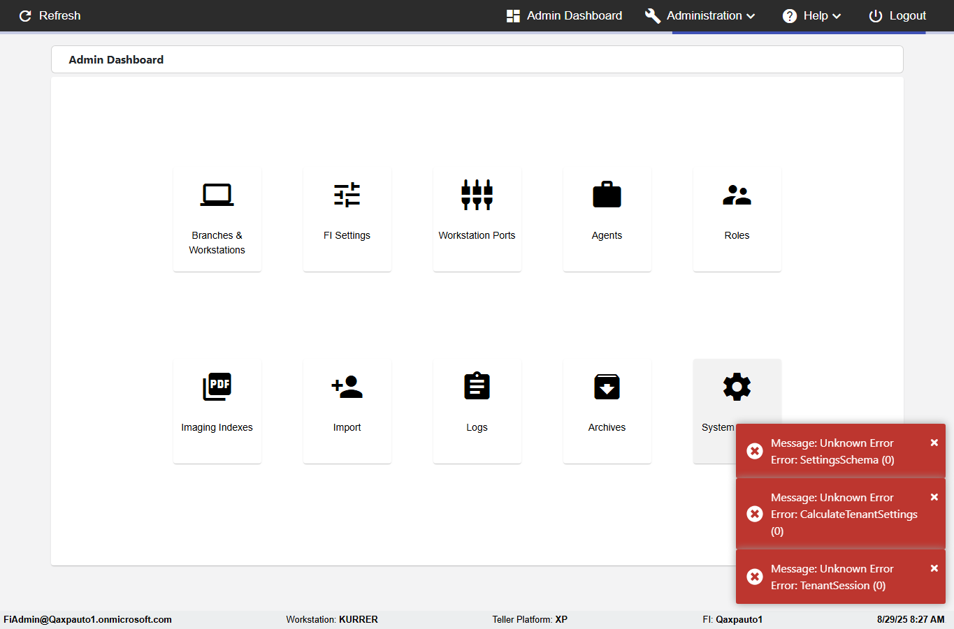 Control Panel, FI Management, Agents, Roles, Imaging Indexes, Member Import, Logging, Archives, About, Logout Actual(Passed): Successfully verified the Verfiy Administration menu has the following options- Control Panel, FI Management, Agents, Roles, Imaging Indexes, Member Import, Logging, Archives, About, Logout [ScreenShot] --- 29 Aug 08:26:09 411 - Element is displayed:: [[RemoteWebDriver: chrome on Windows 10 (2d75e071599815b149fe28d2f2104216)] -> id: immAdministration] --- 29 Aug 08:26:11 602 - Element is displayed:: [[RemoteWebDriver: chrome on Windows 10 (2d75e071599815b149fe28d2f2104216)] -> id: immAdministration] --- 29 Aug 08:26:13 871 - Element is displayed:: [[RemoteWebDriver: chrome on Windows 10 (2d75e071599815b149fe28d2f2104216)] -> id: immMenuLogging] Successfully navigated to the 'Logging' page [ScreenShot] --- 29 Aug 08:26:15 041 - Element is displayed:: [[RemoteWebDriver: chrome on Windows 10 (2d75e071599815b149fe28d2f2104216)] -> id: immRefresh] Successfully navigated to the 'Logging' page after refresh [ScreenShot] --- 29 Aug 08:26:15 434 - Element is displayed:: [[RemoteWebDriver: chrome on Windows 10 (2d75e071599815b149fe28d2f2104216)] -> id: immAdministration] --- 29 Aug 08:26:17 666 - Element is displayed:: [[RemoteWebDriver: chrome on Windows 10 (2d75e071599815b149fe28d2f2104216)] -> id: immAdministration] --- 29 Aug 08:26:18 577 - Element is displayed:: [[RemoteWebDriver: chrome on Windows 10 (2d75e071599815b149fe28d2f2104216)] -> id: immMenuAgents] Successfully navigated to the 'Agent' page [ScreenShot] --- 29 Aug 08:26:21 401 - Element is displayed:: [[RemoteWebDriver: chrome on Windows 10 (2d75e071599815b149fe28d2f2104216)] -> id: immRefresh] Successfully navigated to the 'Agent' page after refresh [ScreenShot] --- 29 Aug 08:26:21 762 - Element is displayed:: [[RemoteWebDriver: chrome on Windows 10 (2d75e071599815b149fe28d2f2104216)] -> id: immAdministration] --- 29 Aug 08:26:23 945 - Element is displayed:: [[RemoteWebDriver: chrome on Windows 10 (2d75e071599815b149fe28d2f2104216)] -> id: immAdministration] --- 29 Aug 08:26:26 278 - Element is displayed:: [[RemoteWebDriver: chrome on Windows 10 (2d75e071599815b149fe28d2f2104216)] -> id: immMenuArchive] Successfully navigated to the 'Archives' page [ScreenShot] --- 29 Aug 08:26:29 131 - Element is displayed:: [[RemoteWebDriver: chrome on Windows 10 (2d75e071599815b149fe28d2f2104216)] -> id: immRefresh] Successfully navigated to the 'Archives' page after refresh [ScreenShot] --- 29 Aug 08:26:29 527 - Element is displayed:: [[RemoteWebDriver: chrome on Windows 10 (2d75e071599815b149fe28d2f2104216)] -> id: immAdministration] --- 29 Aug 08:26:31 735 - Element is displayed:: [[RemoteWebDriver: chrome on Windows 10 (2d75e071599815b149fe28d2f2104216)] -> id: immAdministration] --- 29 Aug 08:26:32 203 - Element is displayed:: [[RemoteWebDriver: chrome on Windows 10 (2d75e071599815b149fe28d2f2104216)] -> id: immMenuRoles] Successfully navigated to the 'Roles' page [ScreenShot] --- 29 Aug 08:26:34 981 - Element is displayed:: [[RemoteWebDriver: chrome on Windows 10 (2d75e071599815b149fe28d2f2104216)] -> id: immRefresh] Successfully navigated to the 'Roles' page after refresh [ScreenShot] --- 29 Aug 08:26:35 396 - Element is displayed:: [[RemoteWebDriver: chrome on Windows 10 (2d75e071599815b149fe28d2f2104216)] -> id: immAdministration] --- 29 Aug 08:26:37 600 - Element is displayed:: [[RemoteWebDriver: chrome on Windows 10 (2d75e071599815b149fe28d2f2104216)] -> id: immAdministration] --- 29 Aug 08:26:40 380 - Element is displayed:: [[RemoteWebDriver: chrome on Windows 10 (2d75e071599815b149fe28d2f2104216)] -> id: immMenuMemberImportOnDemand] Successfully navigated to the 'Member Import On Demand' page [ScreenShot] --- 29 Aug 08:26:43 328 - Element is displayed:: [[RemoteWebDriver: chrome on Windows 10 (2d75e071599815b149fe28d2f2104216)] -> id: immRefresh] Successfully navigated to the 'Member Import On Demand' page after refresh [ScreenShot] --- 29 Aug 08:26:43 758 - Element is displayed:: [[RemoteWebDriver: chrome on Windows 10 (2d75e071599815b149fe28d2f2104216)] -> id: immAdministration] --- 29 Aug 08:26:46 041 - Element is displayed:: [[RemoteWebDriver: chrome on Windows 10 (2d75e071599815b149fe28d2f2104216)] -> id: immAdministration] --- 29 Aug 08:26:48 631 - Element is displayed:: [[RemoteWebDriver: chrome on Windows 10 (2d75e071599815b149fe28d2f2104216)] -> id: immMenuMemberImportSchedule] Successfully navigated to the 'Member Import Schedule' page [ScreenShot] --- 29 Aug 08:26:51 353 - Element is displayed:: [[RemoteWebDriver: chrome on Windows 10 (2d75e071599815b149fe28d2f2104216)] -> id: immRefresh] Successfully navigated to the 'Member Import Schedule' page after refresh [ScreenShot] --- 29 Aug 08:26:51 725 - Element is displayed:: [[RemoteWebDriver: chrome on Windows 10 (2d75e071599815b149fe28d2f2104216)] -> id: immAdministration] --- 29 Aug 08:26:53 907 - Element is displayed:: [[RemoteWebDriver: chrome on Windows 10 (2d75e071599815b149fe28d2f2104216)] -> id: immAdministration] --- 29 Aug 08:26:54 239 - Element is displayed:: [[RemoteWebDriver: chrome on Windows 10 (2d75e071599815b149fe28d2f2104216)] -> id: immMenuImagingIndexes] Successfully navigated to the 'Imaging Indexes' page [ScreenShot] --- 29 Aug 08:26:57 100 - Element is displayed:: [[RemoteWebDriver: chrome on Windows 10 (2d75e071599815b149fe28d2f2104216)] -> id: immRefresh] Successfully navigated to the 'Imaging Indexes' page after refresh [ScreenShot] --- 29 Aug 08:26:57 449 - Element is displayed:: [[RemoteWebDriver: chrome on Windows 10 (2d75e071599815b149fe28d2f2104216)] -> id: immAdministration] --- 29 Aug 08:26:59 621 - Element is displayed:: [[RemoteWebDriver: chrome on Windows 10 (2d75e071599815b149fe28d2f2104216)] -> id: immAdministration] --- 29 Aug 08:27:04 196 - Element is displayed:: [[RemoteWebDriver: chrome on Windows 10 (2d75e071599815b149fe28d2f2104216)] -> id: immMenuSystemSettingsSMTP] Successfully navigated to the 'System Se