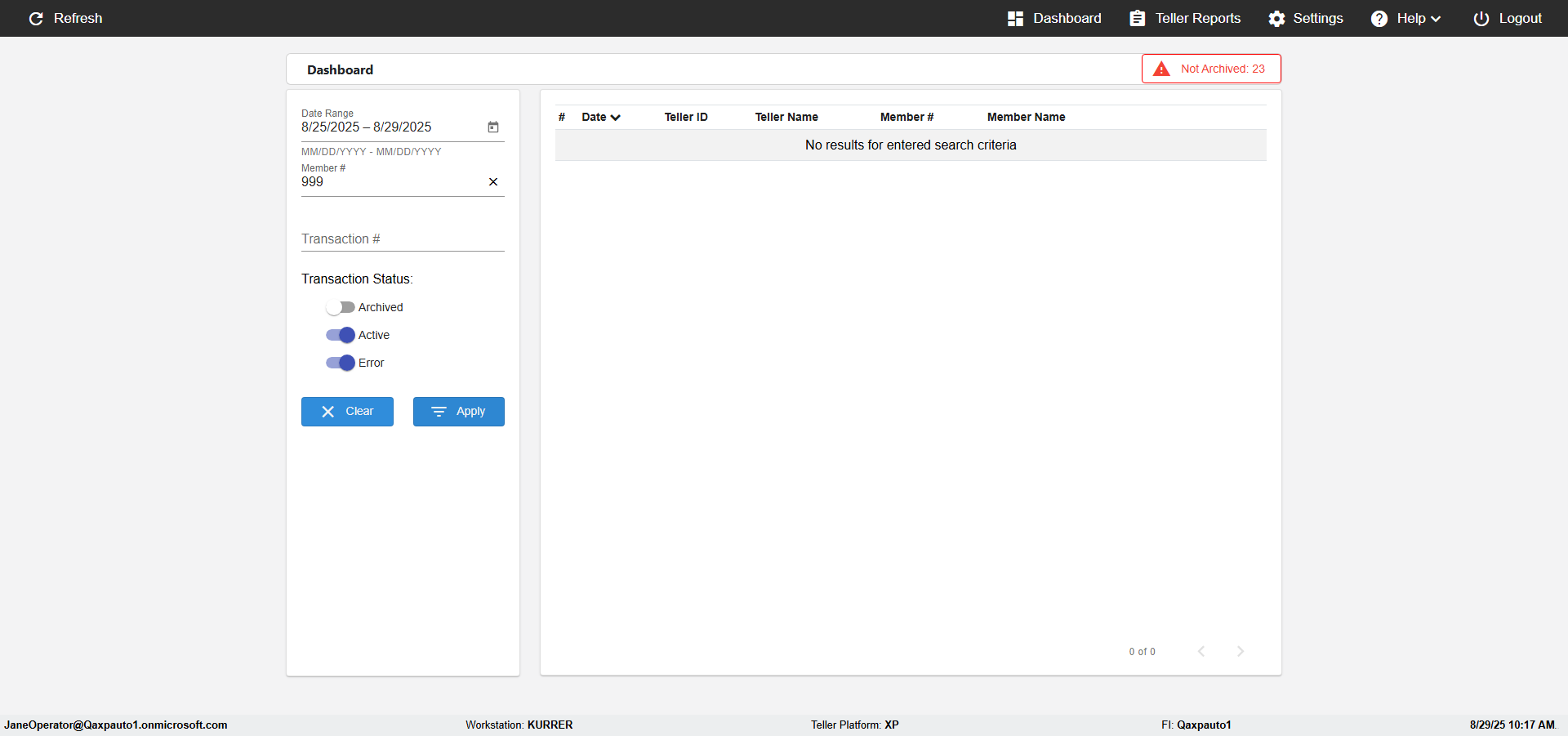 | {Description=verify Transactions in Teller, Email=, Teller LastName=, print signatur=, errorint=, TestID=verifyForTransactionInTellerAndSuperTeller, Color Transactions=, Member=999, UserPwd=iMM2022!, Transtatus=Archived-false;Active-true;Error-false, Receipt=, Report=, Teller=, Teller FirstName=, errorMessage=, Suppress=, Date=4, print Disburstments=, Print signature line=, Type=Teller, Transaction=, Header=, Username=JaneOperator@Qaxpauto1.onmicrosoft.com, SMS=, Sign=, Scan=} |