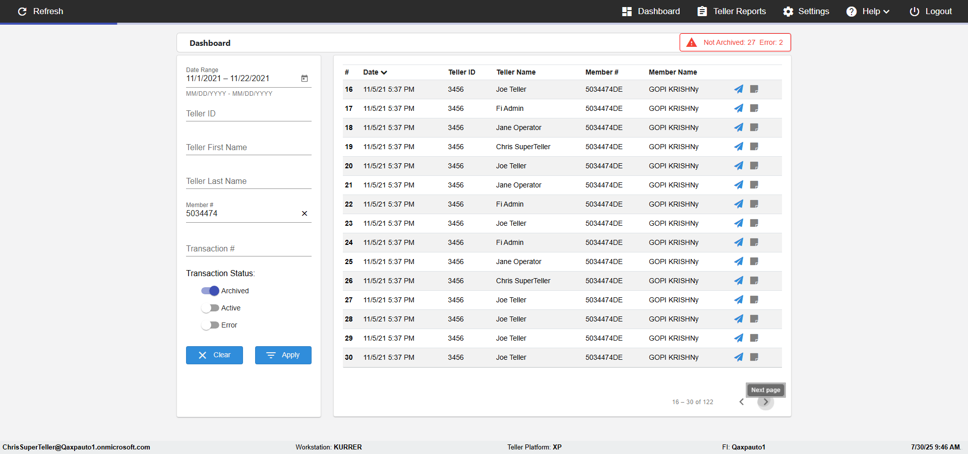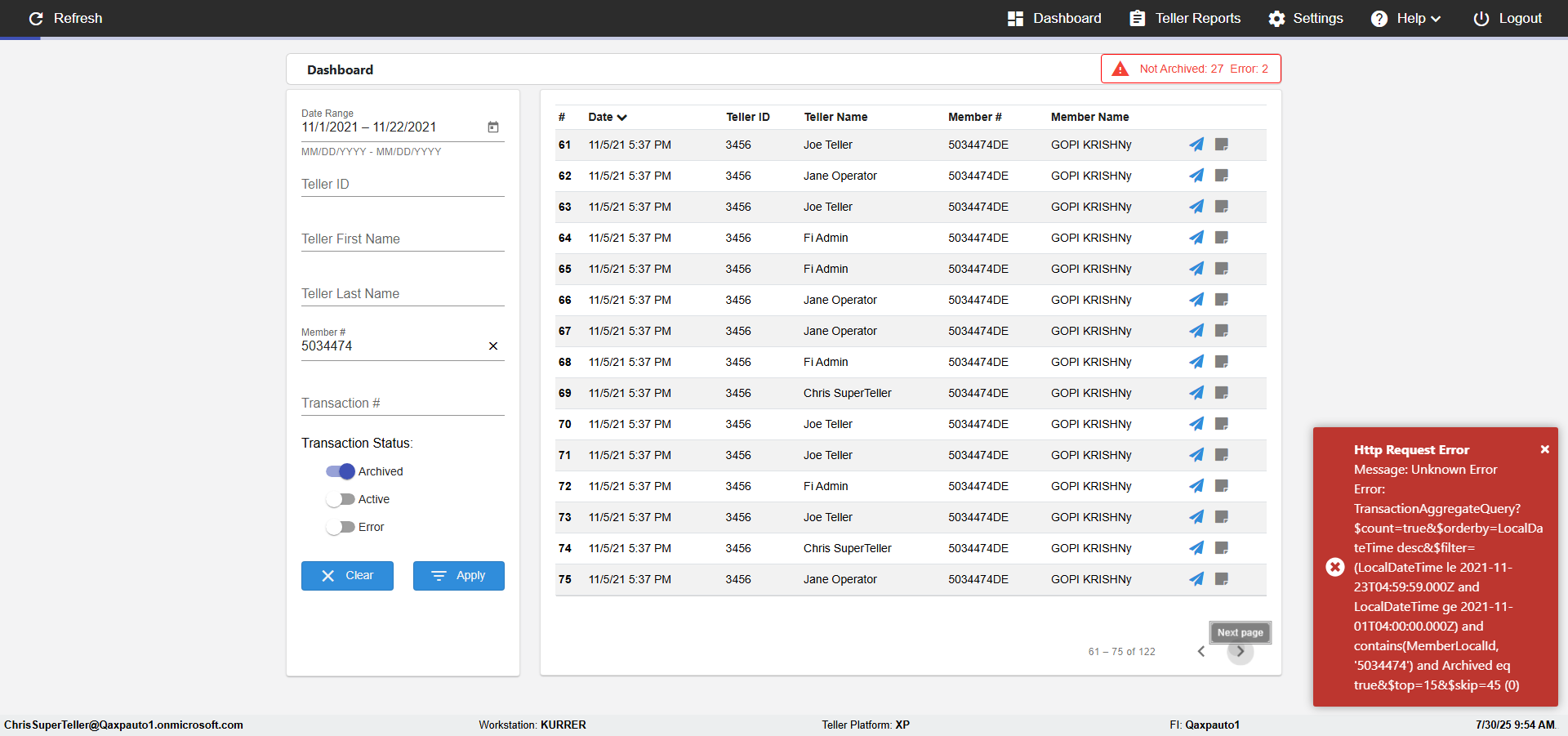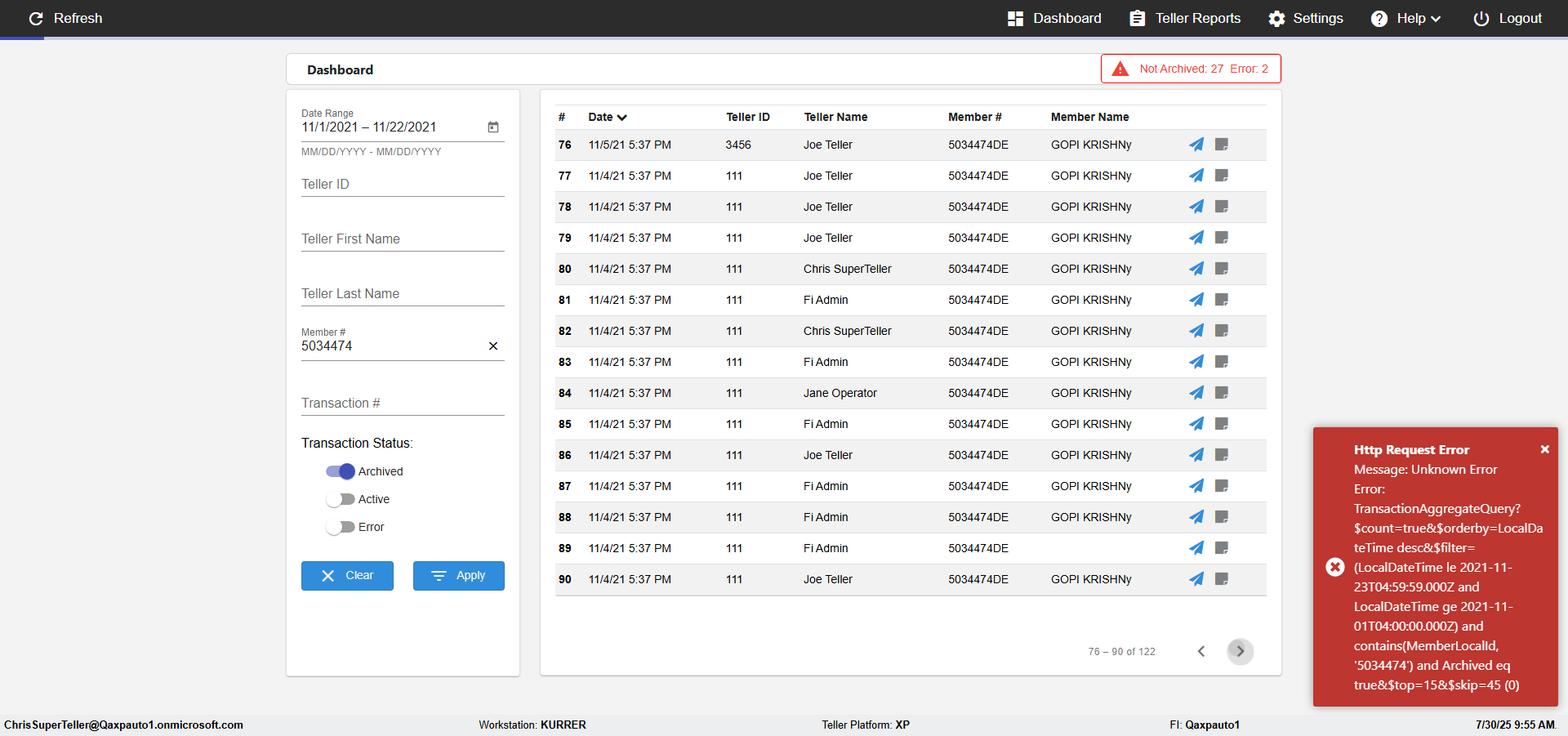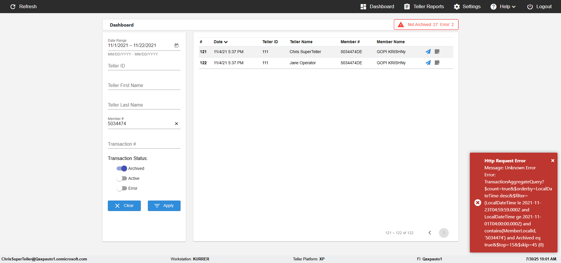 | {Description=verify UI Elemnts In DashBoard with Member, Email=, Teller LastName=, print signatur=, errorint=, TestID=verifyFiltersInDashBoard, Color Transactions=no, Member=5034474, UserPwd=iMM2022!, Transtatus=Archived-True;Active-False;Error-false, Receipt=, Report=, Teller=, Teller FirstName=, errorMessage=, Suppress=, Date=11/01/2021 - 11/22/2021, print Disburstments=, Print signature line=, Type=, Transaction=, Header=, Username=ChrisSuperTeller@Qaxpauto1.onmicrosoft.com, SMS=, Sign=, Scan=} |