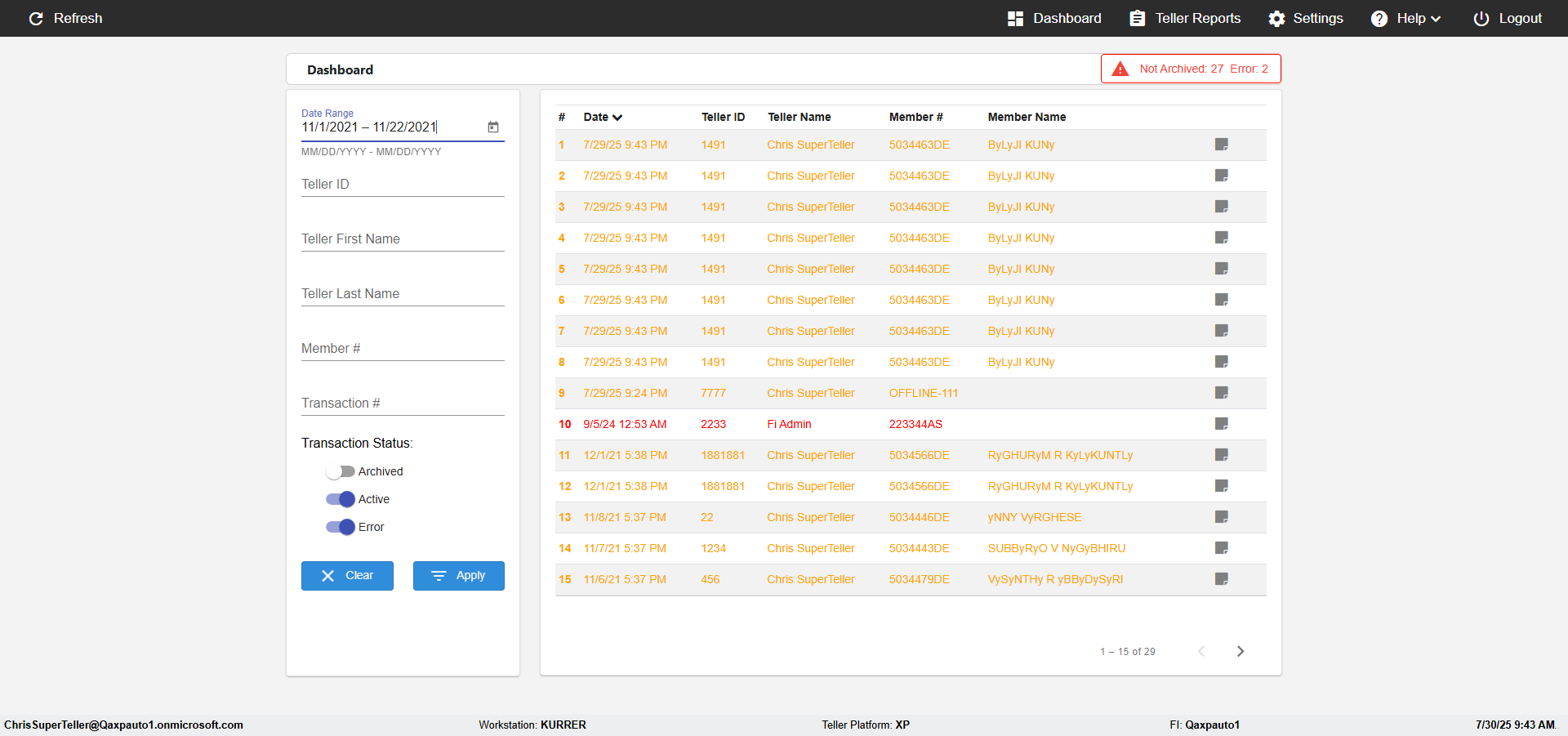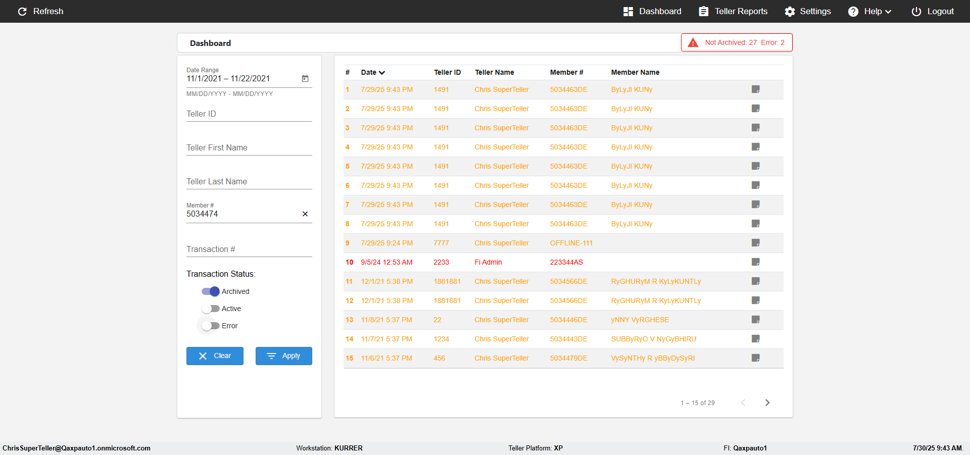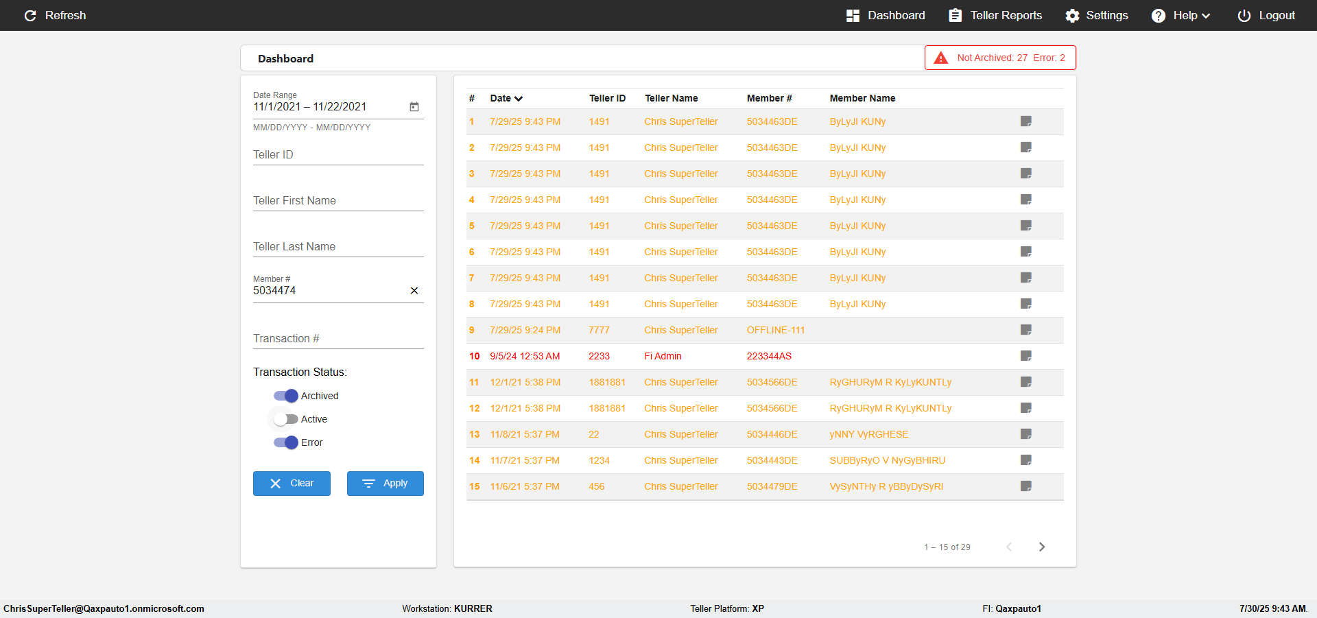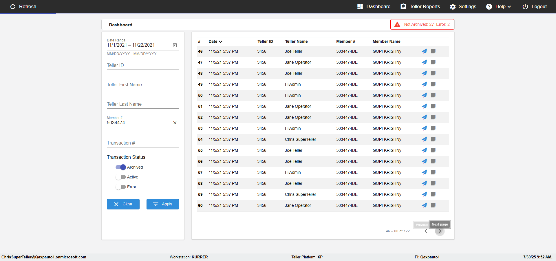 | {Description=verify UI Elemnts In DashBoard with Member, Email=, Teller LastName=, print signatur=, errorint=, TestID=verifyFiltersInDashBoard, Color Transactions=no, Member=5034474, UserPwd=iMM2022!, Transtatus=Archived-True;Active-False;Error-false, Receipt=, Report=, Teller=, Teller FirstName=, errorMessage=, Suppress=, Date=11/01/2021 - 11/22/2021, print Disburstments=, Print signature line=, Type=, Transaction=, Header=, Username=ChrisSuperTeller@Qaxpauto1.onmicrosoft.com, SMS=, Sign=, Scan=} |