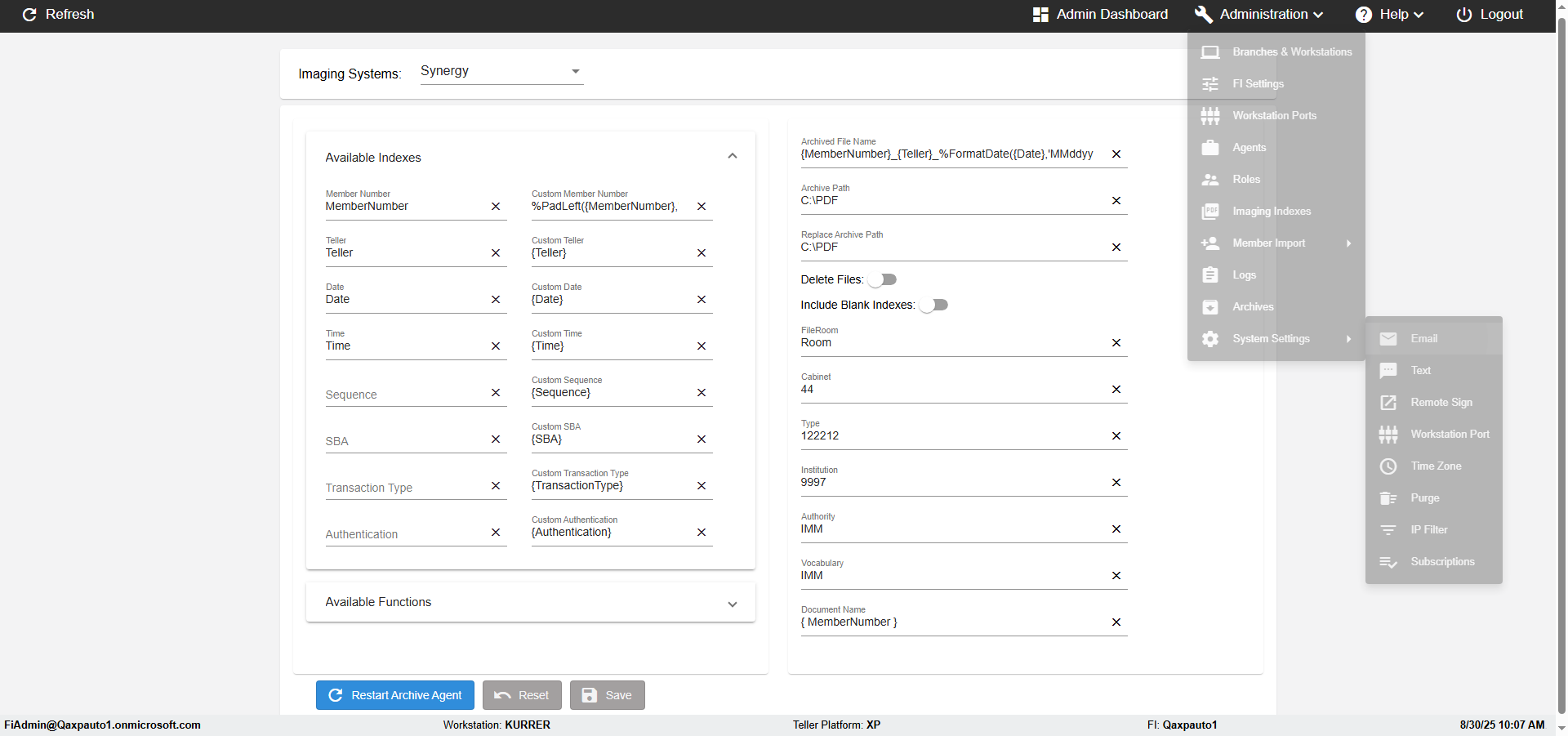 Control Panel, FI Management, Agents, Roles, Imaging Indexes, Member Import, Logging, Archives, About, Logout Actual(Passed): Successfully verified the Verfiy Administration menu has the following options- Control Panel, FI Management, Agents, Roles, Imaging Indexes, Member Import, Logging, Archives, About, Logout [ScreenShot] --- 30 Aug 10:06:09 701 - Element is displayed:: [[RemoteWebDriver: chrome on Windows 10 (eb39b1fe0963a4563bdb55ad5cd2cc29)] -> id: immAdministration] --- 30 Aug 10:06:11 851 - Element is displayed:: [[RemoteWebDriver: chrome on Windows 10 (eb39b1fe0963a4563bdb55ad5cd2cc29)] -> id: immAdministration] --- 30 Aug 10:06:14 064 - Element is displayed:: [[RemoteWebDriver: chrome on Windows 10 (eb39b1fe0963a4563bdb55ad5cd2cc29)] -> id: immMenuLogging] Successfully navigated to the 'Logging' page [ScreenShot] --- 30 Aug 10:06:15 015 - Element is displayed:: [[RemoteWebDriver: chrome on Windows 10 (eb39b1fe0963a4563bdb55ad5cd2cc29)] -> id: immRefresh] Successfully navigated to the 'Logging' page after refresh [ScreenShot] --- 30 Aug 10:06:15 519 - Element is displayed:: [[RemoteWebDriver: chrome on Windows 10 (eb39b1fe0963a4563bdb55ad5cd2cc29)] -> id: immAdministration] --- 30 Aug 10:06:17 659 - Element is displayed:: [[RemoteWebDriver: chrome on Windows 10 (eb39b1fe0963a4563bdb55ad5cd2cc29)] -> id: immAdministration] --- 30 Aug 10:06:18 408 - Element is displayed:: [[RemoteWebDriver: chrome on Windows 10 (eb39b1fe0963a4563bdb55ad5cd2cc29)] -> id: immMenuAgents] Successfully navigated to the 'Agent' page [ScreenShot] --- 30 Aug 10:06:21 118 - Element is displayed:: [[RemoteWebDriver: chrome on Windows 10 (eb39b1fe0963a4563bdb55ad5cd2cc29)] -> id: immRefresh] Successfully navigated to the 'Agent' page after refresh [ScreenShot] --- 30 Aug 10:06:21 599 - Element is displayed:: [[RemoteWebDriver: chrome on Windows 10 (eb39b1fe0963a4563bdb55ad5cd2cc29)] -> id: immAdministration] --- 30 Aug 10:06:23 771 - Element is displayed:: [[RemoteWebDriver: chrome on Windows 10 (eb39b1fe0963a4563bdb55ad5cd2cc29)] -> id: immAdministration] --- 30 Aug 10:06:25 990 - Element is displayed:: [[RemoteWebDriver: chrome on Windows 10 (eb39b1fe0963a4563bdb55ad5cd2cc29)] -> id: immMenuArchive] Successfully navigated to the 'Archives' page [ScreenShot] --- 30 Aug 10:06:28 593 - Element is displayed:: [[RemoteWebDriver: chrome on Windows 10 (eb39b1fe0963a4563bdb55ad5cd2cc29)] -> id: immRefresh] Successfully navigated to the 'Archives' page after refresh [ScreenShot] --- 30 Aug 10:06:28 935 - Element is displayed:: [[RemoteWebDriver: chrome on Windows 10 (eb39b1fe0963a4563bdb55ad5cd2cc29)] -> id: immAdministration] --- 30 Aug 10:06:31 069 - Element is displayed:: [[RemoteWebDriver: chrome on Windows 10 (eb39b1fe0963a4563bdb55ad5cd2cc29)] -> id: immAdministration] --- 30 Aug 10:06:31 358 - Element is displayed:: [[RemoteWebDriver: chrome on Windows 10 (eb39b1fe0963a4563bdb55ad5cd2cc29)] -> id: immMenuRoles] Successfully navigated to the 'Roles' page [ScreenShot] --- 30 Aug 10:06:34 044 - Element is displayed:: [[RemoteWebDriver: chrome on Windows 10 (eb39b1fe0963a4563bdb55ad5cd2cc29)] -> id: immRefresh] Successfully navigated to the 'Roles' page after refresh [ScreenShot] --- 30 Aug 10:06:34 357 - Element is displayed:: [[RemoteWebDriver: chrome on Windows 10 (eb39b1fe0963a4563bdb55ad5cd2cc29)] -> id: immAdministration] --- 30 Aug 10:06:36 492 - Element is displayed:: [[RemoteWebDriver: chrome on Windows 10 (eb39b1fe0963a4563bdb55ad5cd2cc29)] -> id: immAdministration] --- 30 Aug 10:06:38 996 - Element is displayed:: [[RemoteWebDriver: chrome on Windows 10 (eb39b1fe0963a4563bdb55ad5cd2cc29)] -> id: immMenuMemberImportOnDemand] Successfully navigated to the 'Member Import On Demand' page [ScreenShot] --- 30 Aug 10:06:41 620 - Element is displayed:: [[RemoteWebDriver: chrome on Windows 10 (eb39b1fe0963a4563bdb55ad5cd2cc29)] -> id: immRefresh] Successfully navigated to the 'Member Import On Demand' page after refresh [ScreenShot] --- 30 Aug 10:06:41 955 - Element is displayed:: [[RemoteWebDriver: chrome on Windows 10 (eb39b1fe0963a4563bdb55ad5cd2cc29)] -> id: immAdministration] --- 30 Aug 10:06:44 099 - Element is displayed:: [[RemoteWebDriver: chrome on Windows 10 (eb39b1fe0963a4563bdb55ad5cd2cc29)] -> id: immAdministration] --- 30 Aug 10:06:46 651 - Element is displayed:: [[RemoteWebDriver: chrome on Windows 10 (eb39b1fe0963a4563bdb55ad5cd2cc29)] -> id: immMenuMemberImportSchedule] Successfully navigated to the 'Member Import Schedule' page [ScreenShot] --- 30 Aug 10:06:49 380 - Element is displayed:: [[RemoteWebDriver: chrome on Windows 10 (eb39b1fe0963a4563bdb55ad5cd2cc29)] -> id: immRefresh] Successfully navigated to the 'Member Import Schedule' page after refresh [ScreenShot] --- 30 Aug 10:06:49 747 - Element is displayed:: [[RemoteWebDriver: chrome on Windows 10 (eb39b1fe0963a4563bdb55ad5cd2cc29)] -> id: immAdministration] --- 30 Aug 10:06:51 887 - Element is displayed:: [[RemoteWebDriver: chrome on Windows 10 (eb39b1fe0963a4563bdb55ad5cd2cc29)] -> id: immAdministration] --- 30 Aug 10:06:52 120 - Element is displayed:: [[RemoteWebDriver: chrome on Windows 10 (eb39b1fe0963a4563bdb55ad5cd2cc29)] -> id: immMenuImagingIndexes] Successfully navigated to the 'Imaging Indexes' page [ScreenShot] --- 30 Aug 10:06:54 887 - Element is displayed:: [[RemoteWebDriver: chrome on Windows 10 (eb39b1fe0963a4563bdb55ad5cd2cc29)] -> id: immRefresh] Successfully navigated to the 'Imaging Indexes' page after refresh [ScreenShot] --- 30 Aug 10:06:55 237 - Element is displayed:: [[RemoteWebDriver: chrome on Windows 10 (eb39b1fe0963a4563bdb55ad5cd2cc29)] -> id: immAdministration] --- 30 Aug 10:06:57 370 - Element is displayed:: [[RemoteWebDriver: chrome on Windows 10 (eb39b1fe0963a4563bdb55ad5cd2cc29)] -> id: immAdministration] --- 30 Aug 10:07:01 944 - Element is displayed:: [[RemoteWebDriver: chrome on Windows 10 (eb39b1fe0963a4563bdb55ad5cd2cc29)] -> id: immMenuSystemSettingsSMTP] Successfully navigated to the 'System Se