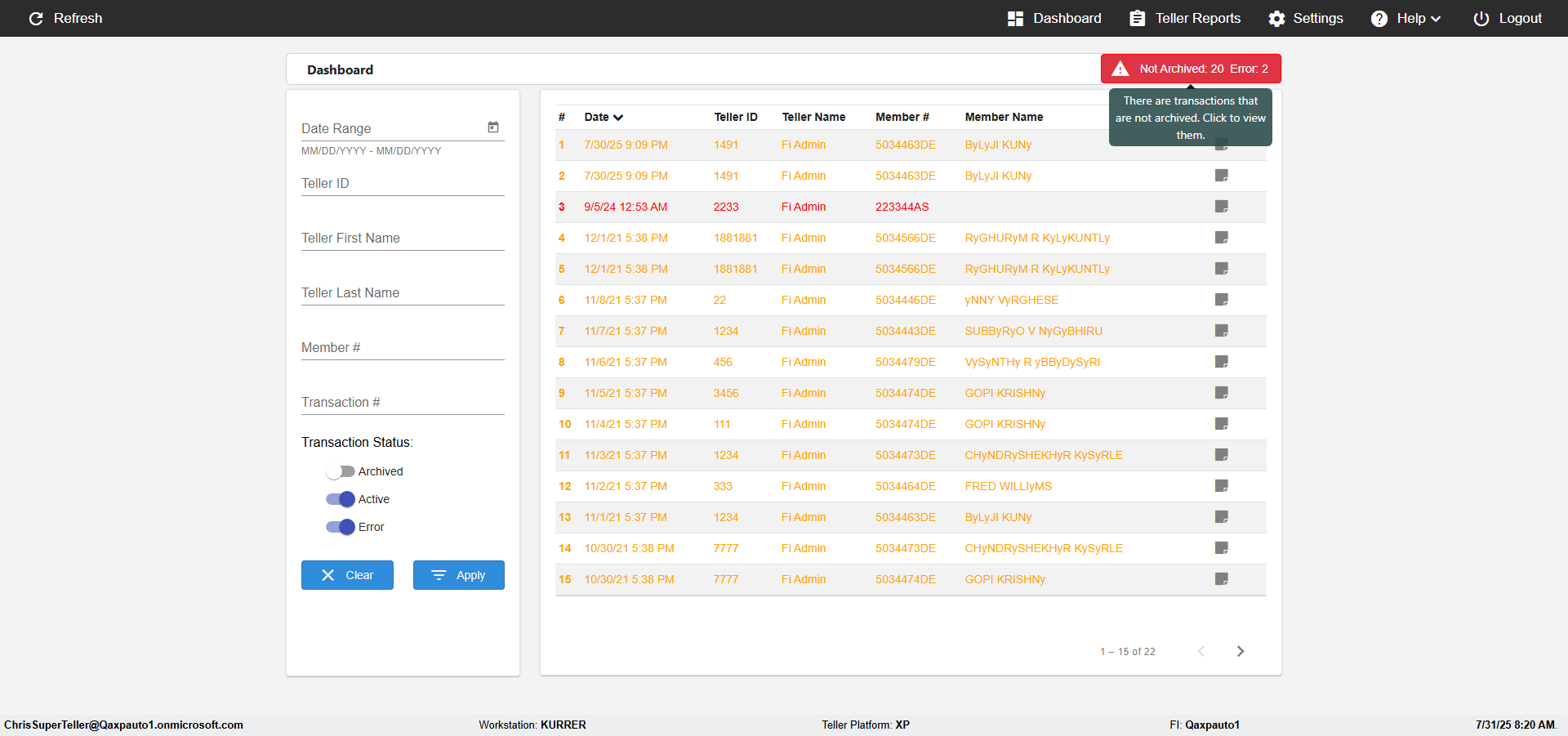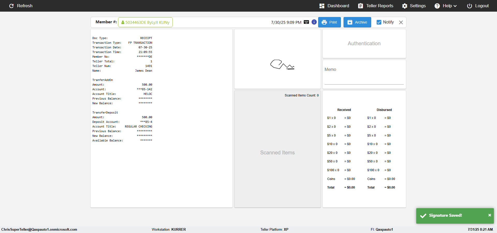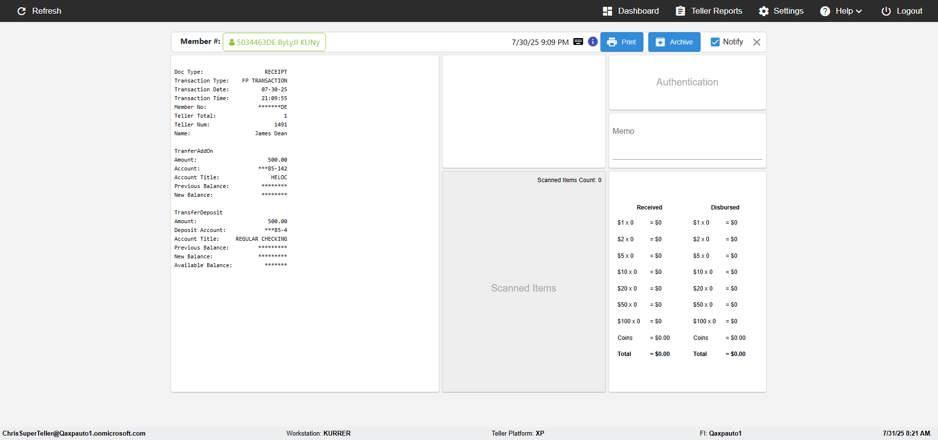 | {Toggel=, Archived Transactions=yes, Description=verify End TO End Test OF Normal Teller In Ereceipt Page, Email=FALSE, Archive=TRUE, Document Type=SSN, Notify=TRUE, SignatureTab=Touch,, DisbursedExpression=|-10*5, Operation=, Teller LastName=, Disbursed cash=1-1|2-2|5-2|10-1|20-2|50-1|100-1|Coins-3, errorint=, TestID=verifyEndTOEndTestOFNormalTellerInEreceipt, Print=FALSE, DisbursedExpressionValue=FALSE, Phone=(555) 021-3315, ReceivedCashValue=FALSE, Member=, UserPwd=iMM2022!, Transtatus=Archived-false;Active-true;Error-false, Docment ID=216554121, Teller=, Teller FirstName=, errorMessage=, ReceivedExpressionValue=TRUE, SecondName=, Date=, Platfrom=, Received cash=1-1|2-2|5-2|10-1|20-2|50-1|100-1|Coins-3, Transaction=, Header=, Expression=, Username=ChrisSuperTeller@Qaxpauto1.onmicrosoft.com, DisbursedCashValue=TRUE, FullName=, ReceivedExpression=|+100*2, SMS=FALSE, Memo=eReceipts Demo} |
