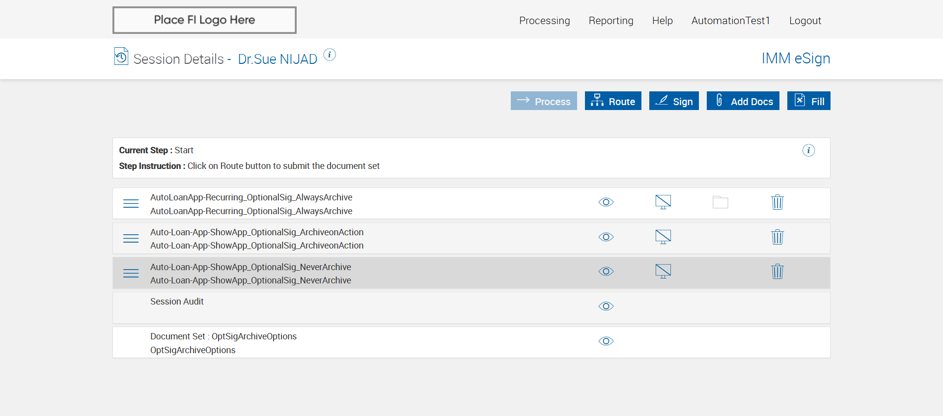 Process a session with document set that has 3 different Archive Options which has optional signature fields