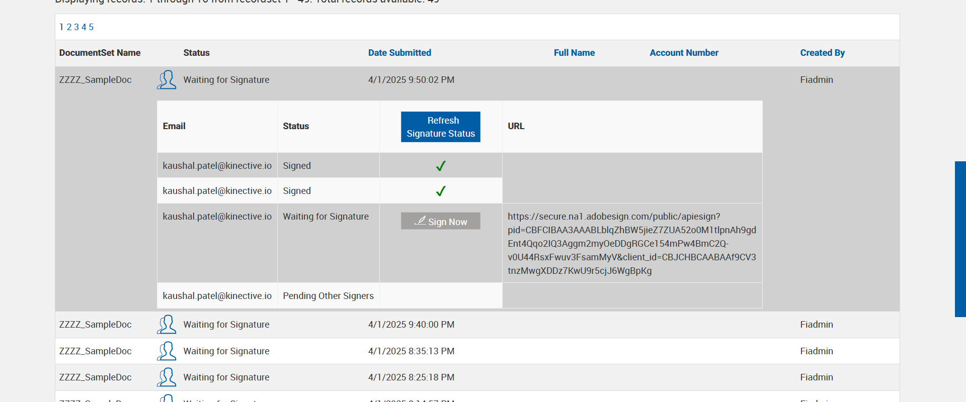 Expected: Verify green tick-mark displayed for first two parties in 'Remote Signautre Status Report' page