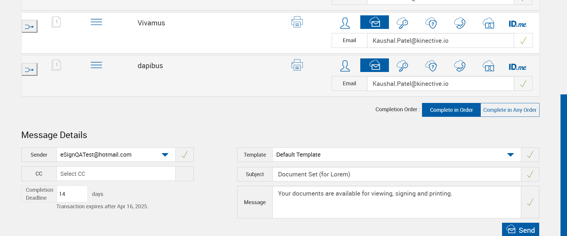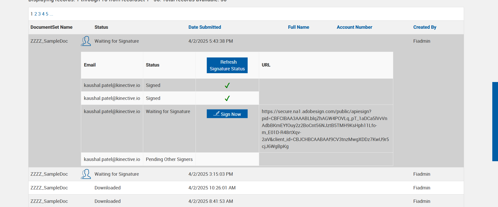 Expected: Verify green tick-mark displayed for first two parties in 'Remote Signautre Status Report' page