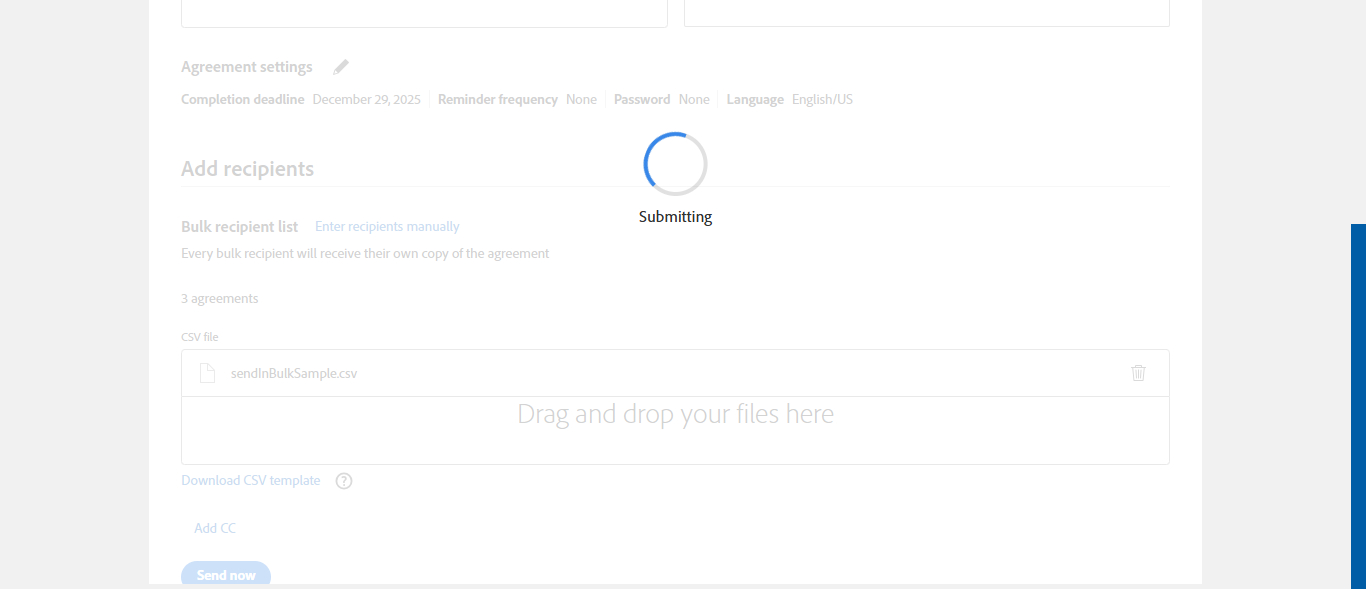 Success message The Bulk send Import CSV , containing 3 agreements, has been queued for sending to recipients.
