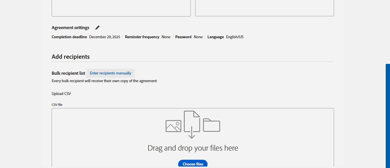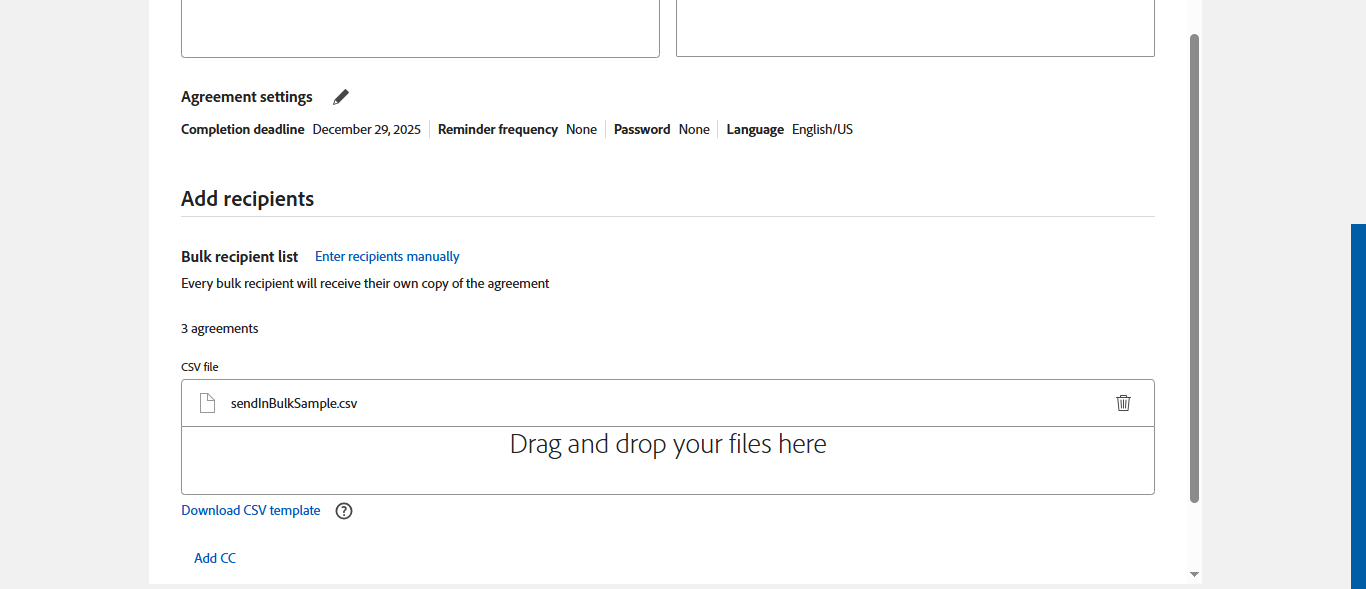 Success message The Bulk send "Import CSV ", containing 3 agreements, has been queued for sending to recipients. |