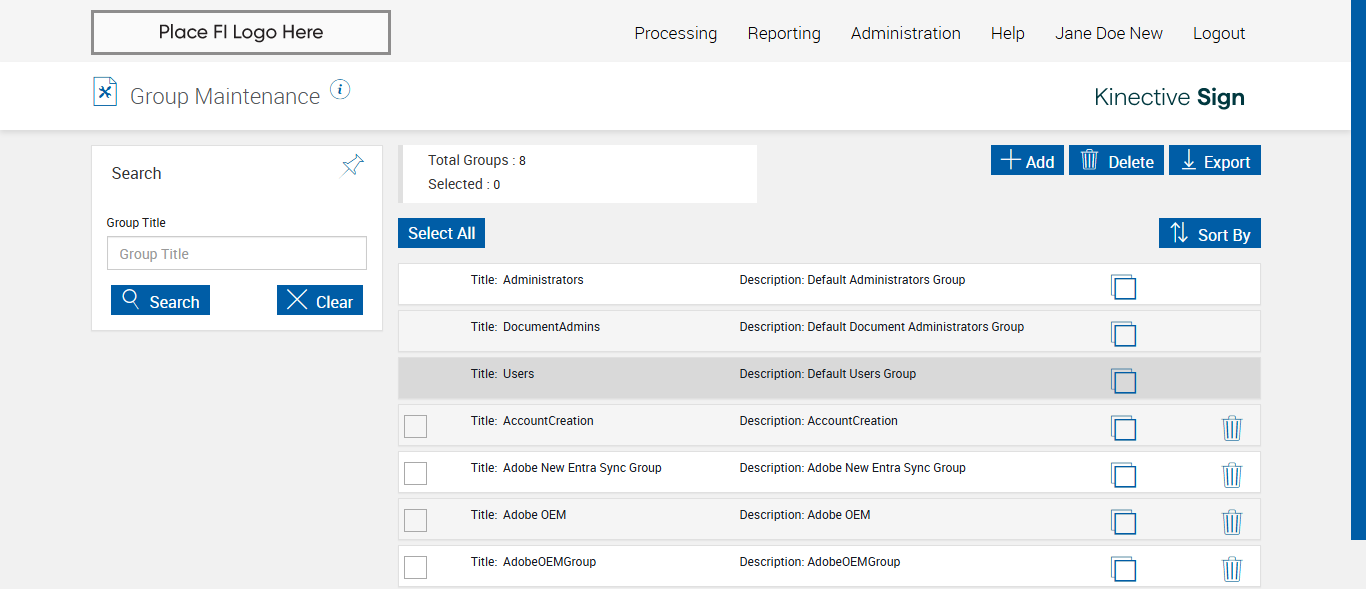 Expected: Entra Group Sync checkbox should be disabled for SignPlus new FI[Administrators, DocumentAdmins, Users, AdobeOEMTest, Adobe OEM, Adobe New Entra Sync Group, AdobeOEMGroup, AccountCreation]'