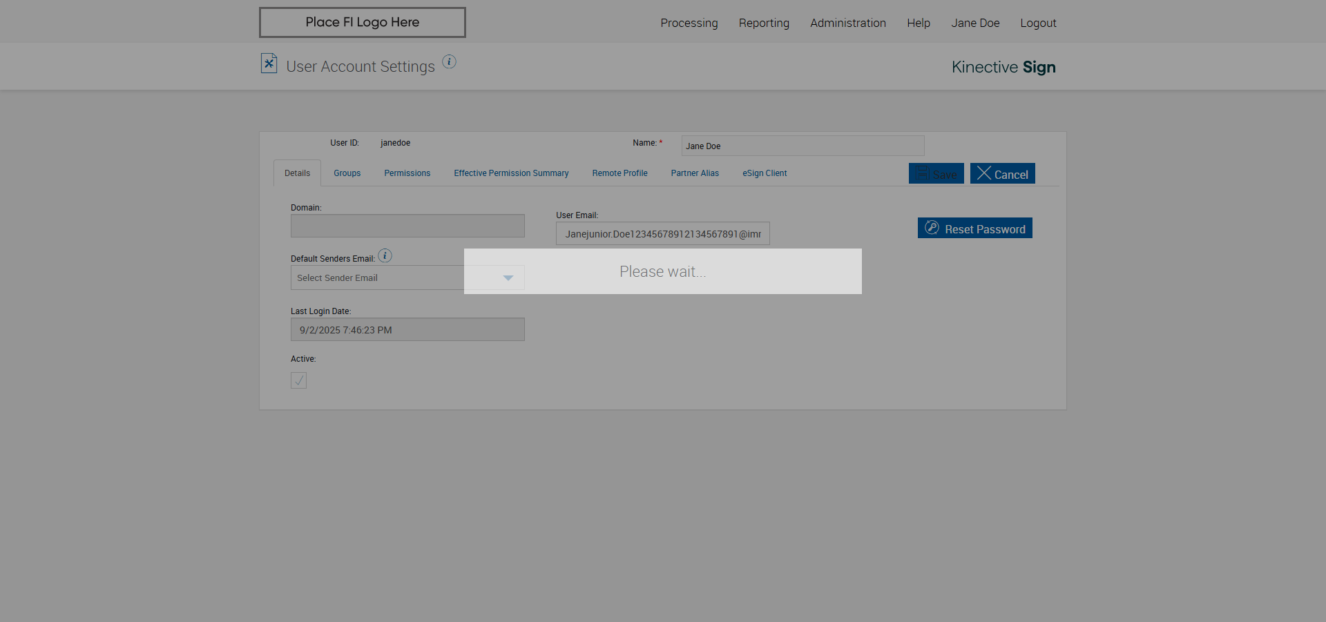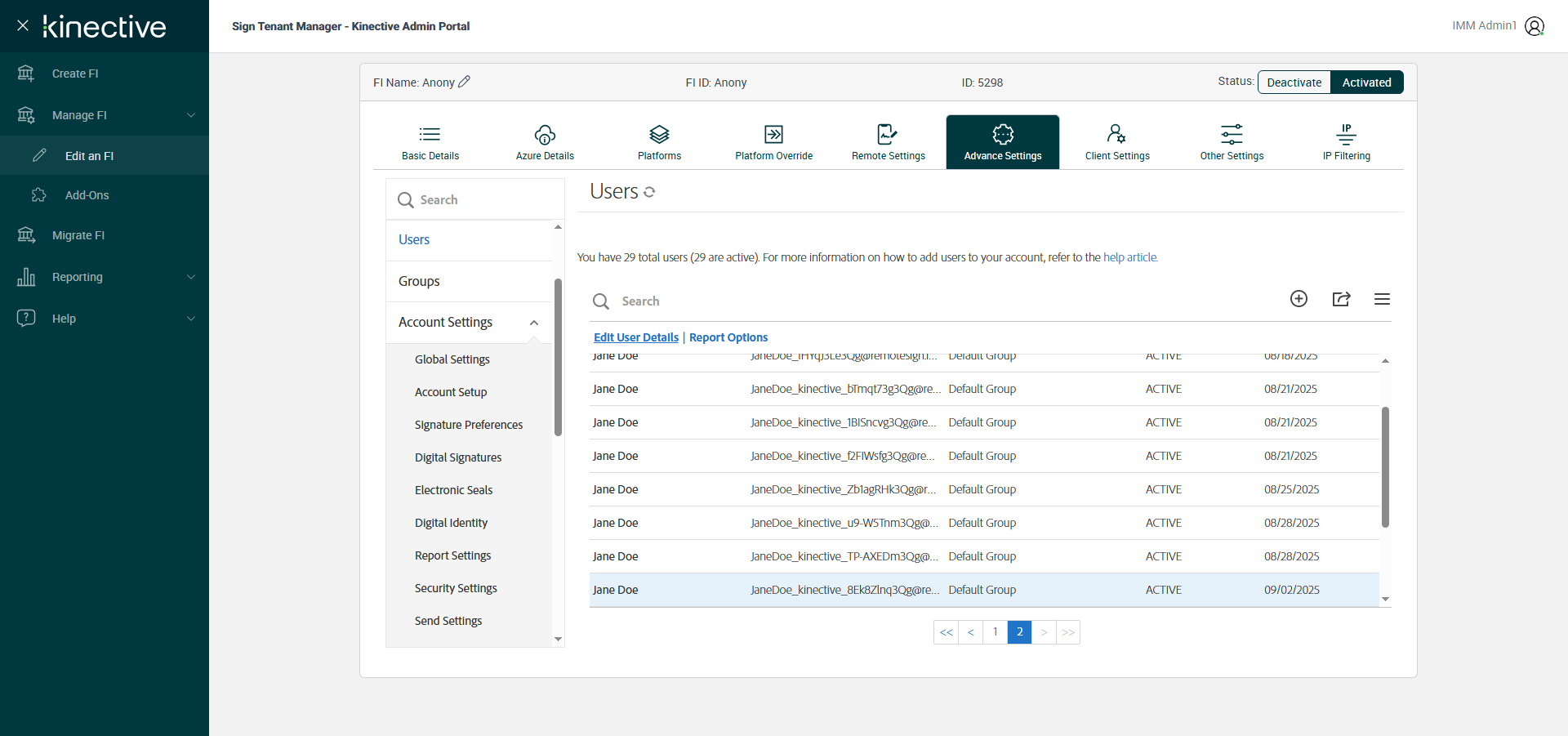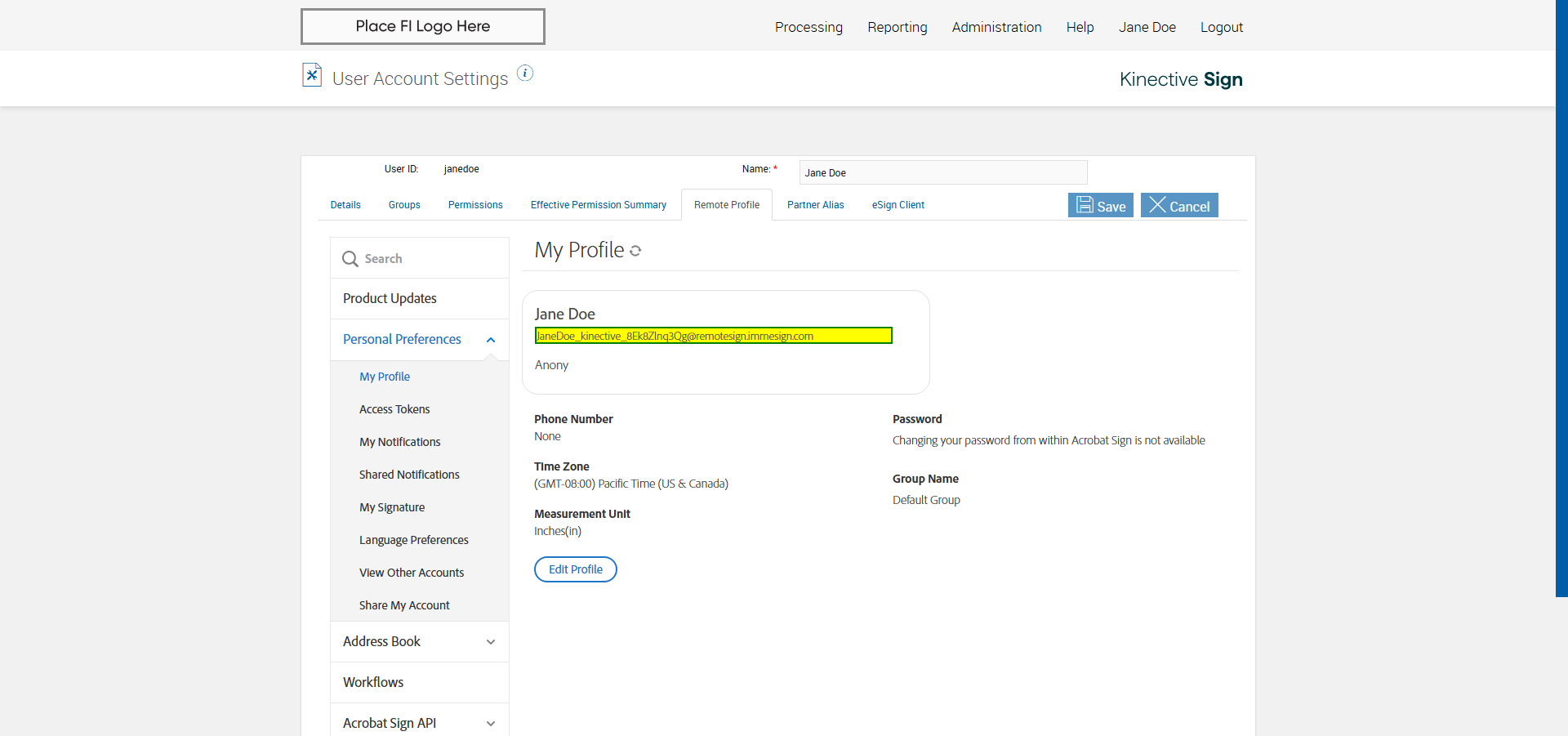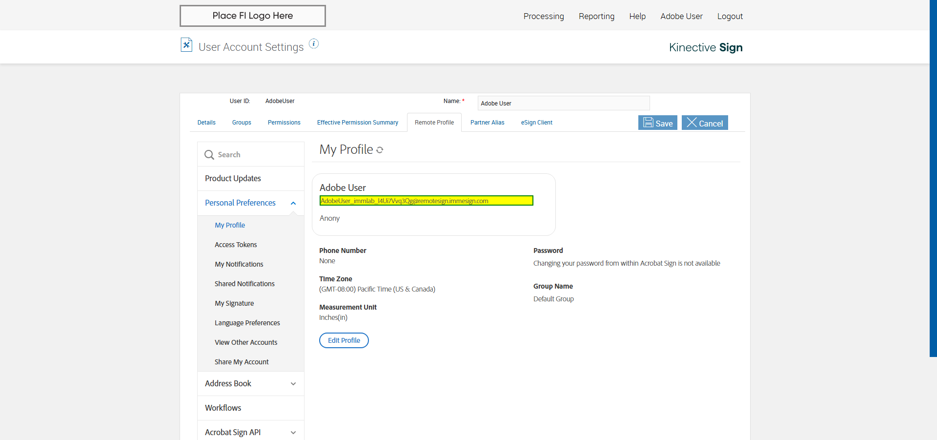Adobe User created and email is displayed in the advanced setings Page JaneDoe_kinective_8Ek8Zlnq3Qg@remotesign.immesign.com [ScreenShot]
