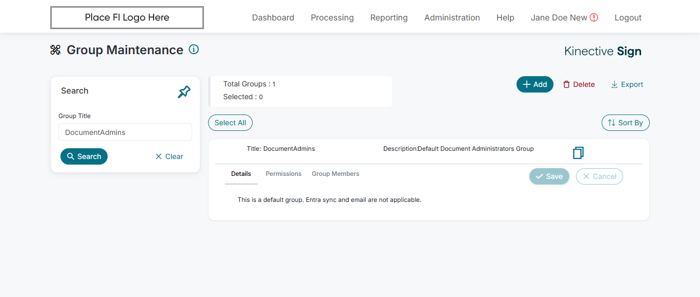 Expected: Entra Group Sync checkbox should be not displayed for Default Group 'DocumentAdmins'